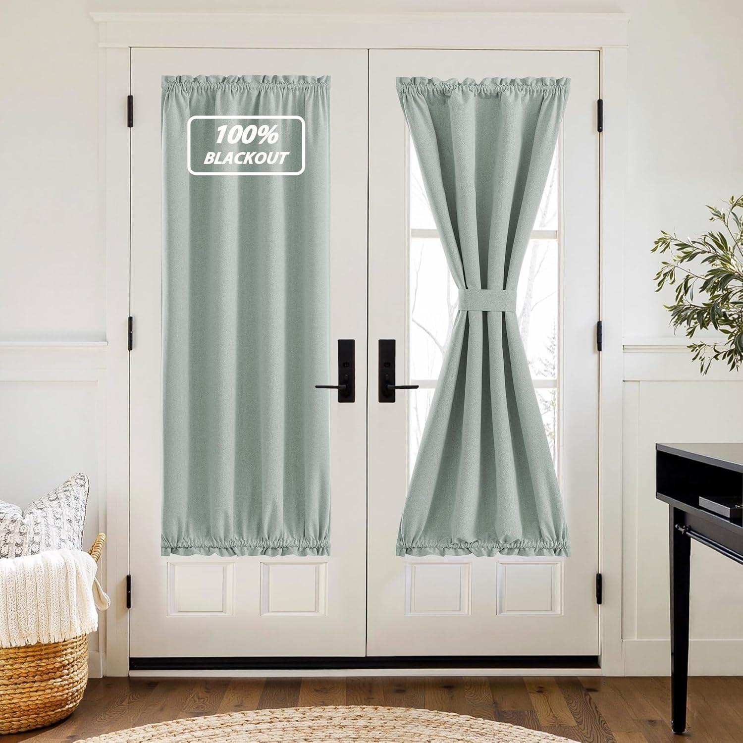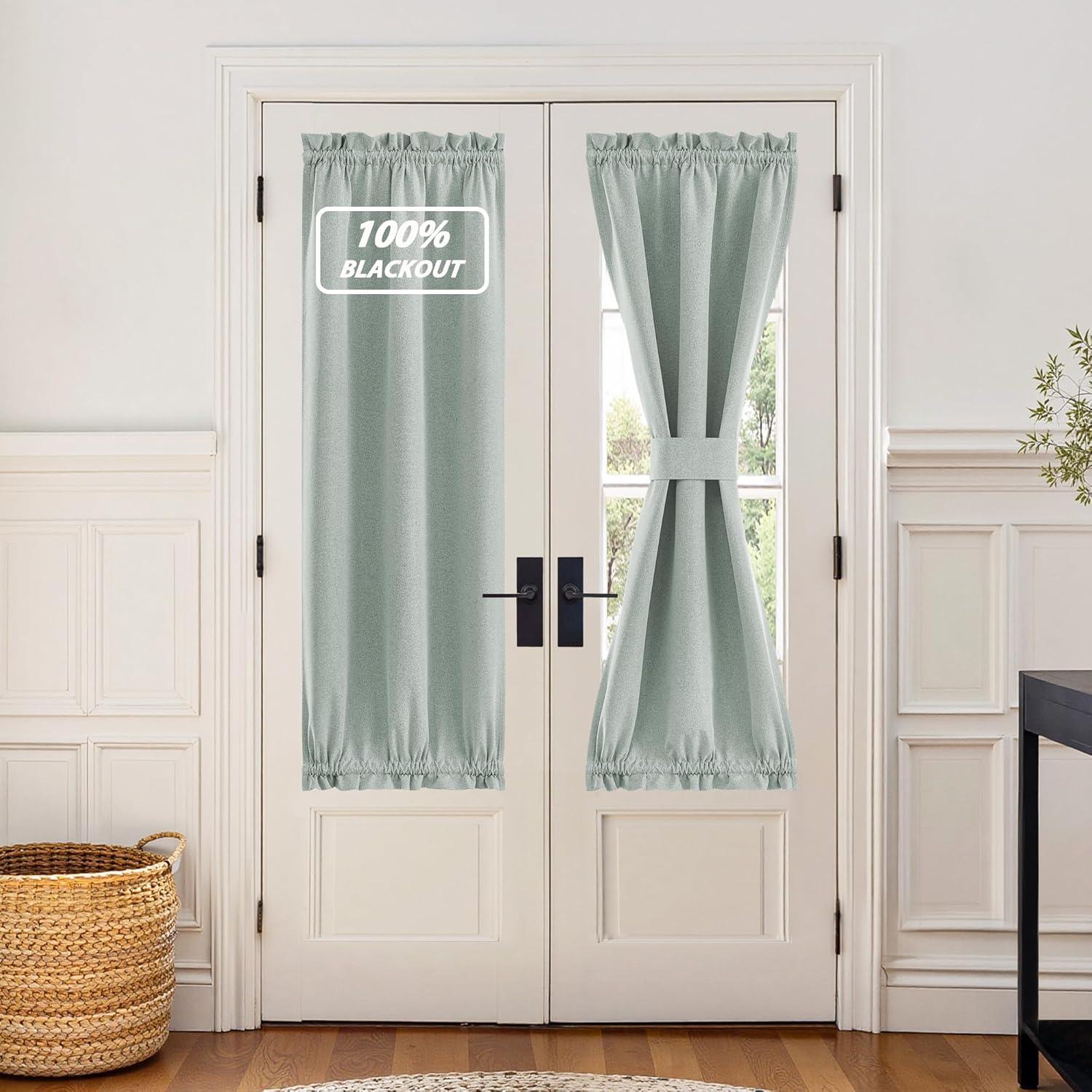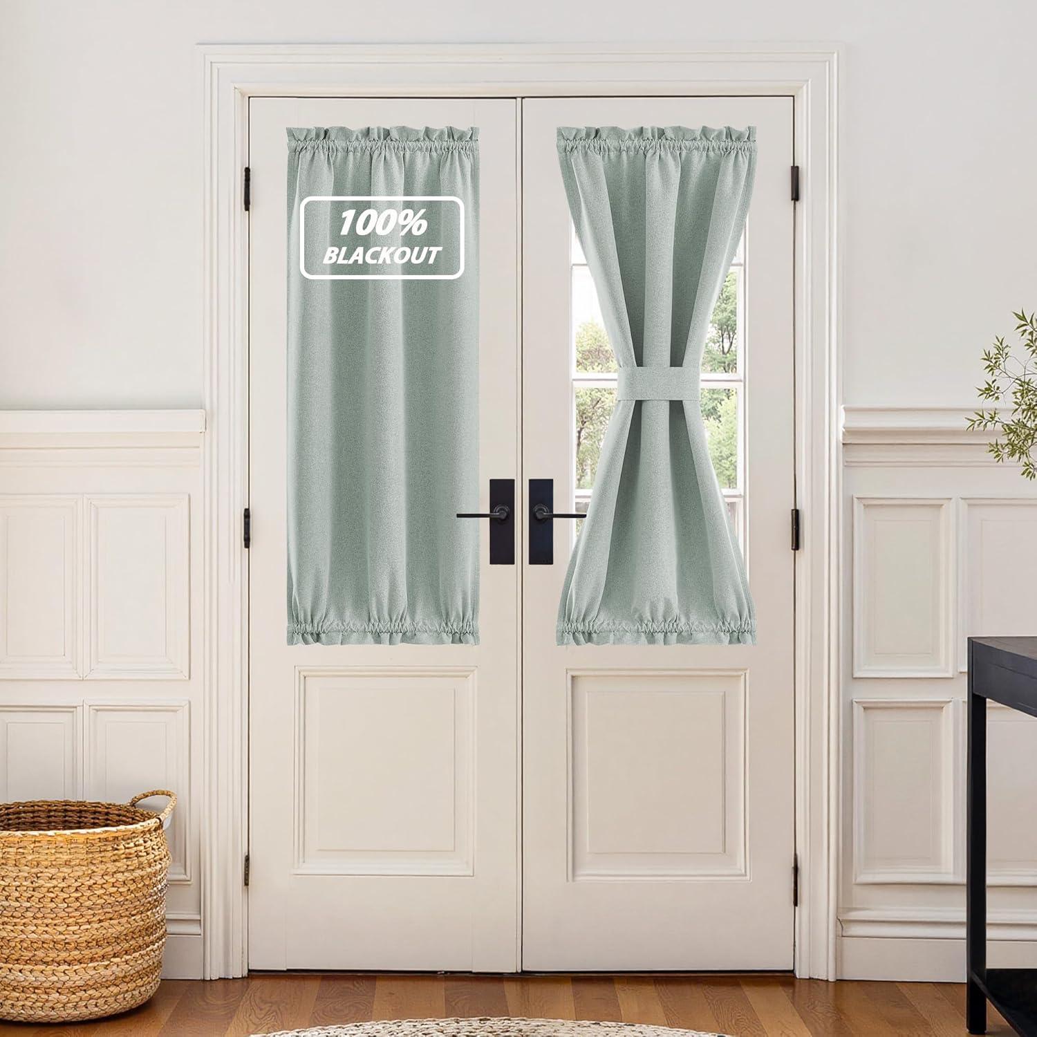 NICEETOWN 100% Blackout Door Curtain, Light Green Linen Blended Privacy French Short Door Curtain for Patio Sidelight Shade for Glass, 25 x 40 inches, 1 Panel(Greyish Green)