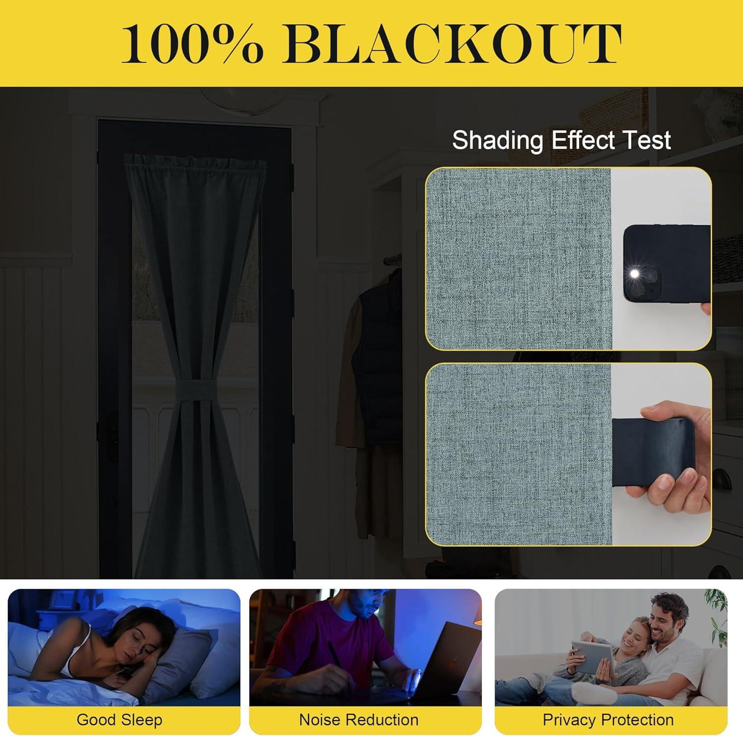 100% Blackout: The real blackout door curtains on the market. Linen blackout curtains crafted with white liner backing make the drapes completely keep out the 100% sunlight and UV ray. Protect your furniture from color fading due to sunlight exposition.