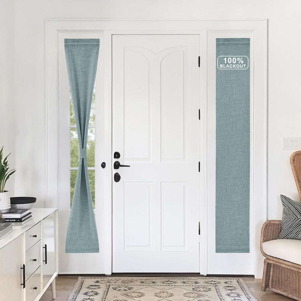 NICEETOWN 100% Blackout Door Curtain, Light Green Linen Blended Privacy French Short Door Curtain for Patio Sidelight Shade for Glass, 25 x 40 inches, 1 Panel(Skylark Blue)