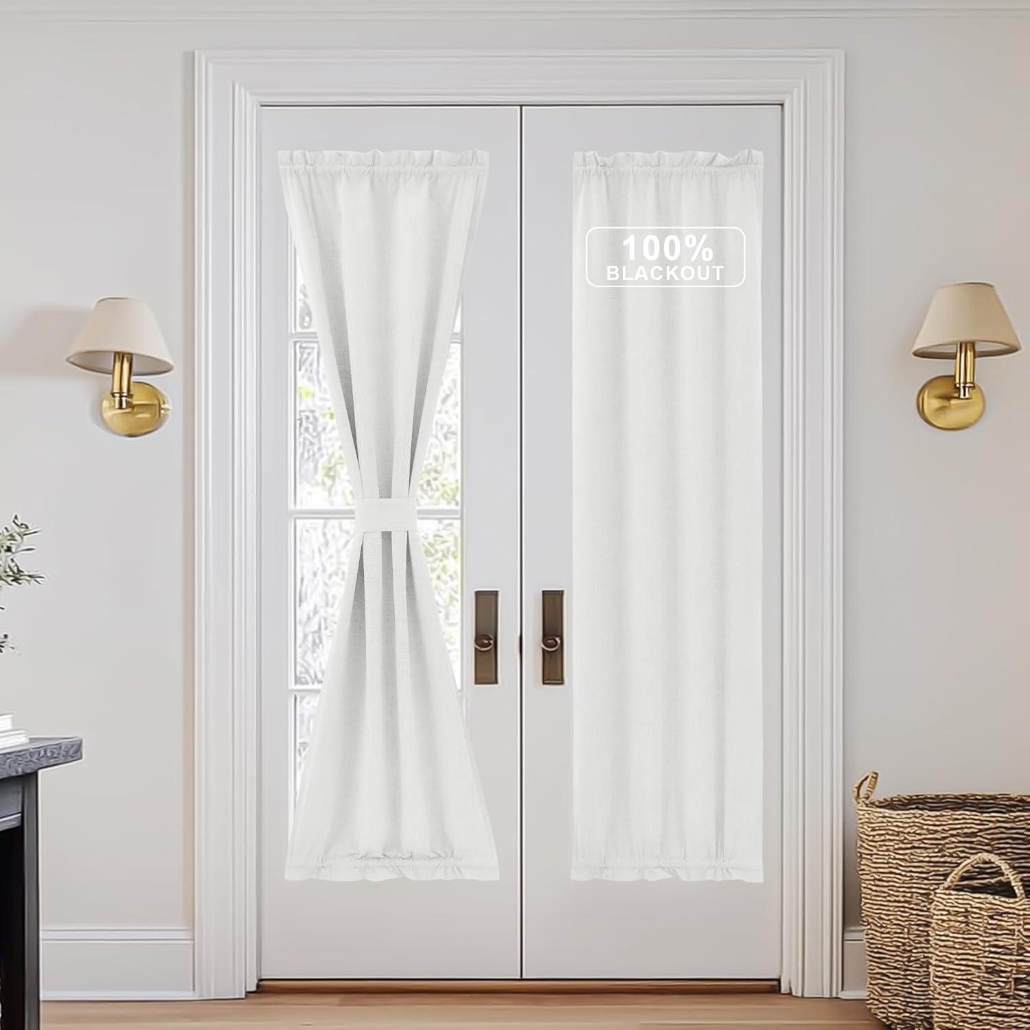 NICEETOWN 100% Blackout Door Curtain, Light Green Linen Blended Privacy French Short Door Curtain for Patio Sidelight Shade for Glass, 25 x 40 inches, 1 Panel(White)