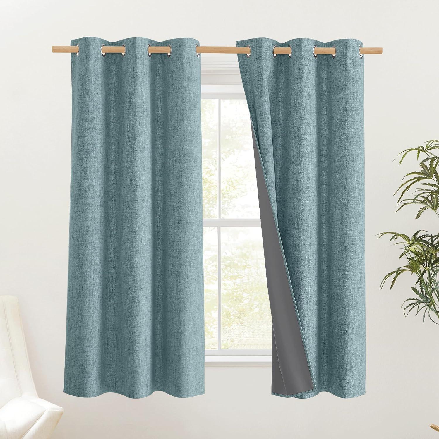 NICETOWN 100% Absolutely Blackout Linen Curtains with Thermal Insulated Liner, Skylark Blue, 42" Wide, 45" Length Energy Saving Curtains for Dining Room 2 Panels Set, Vertical Blinds