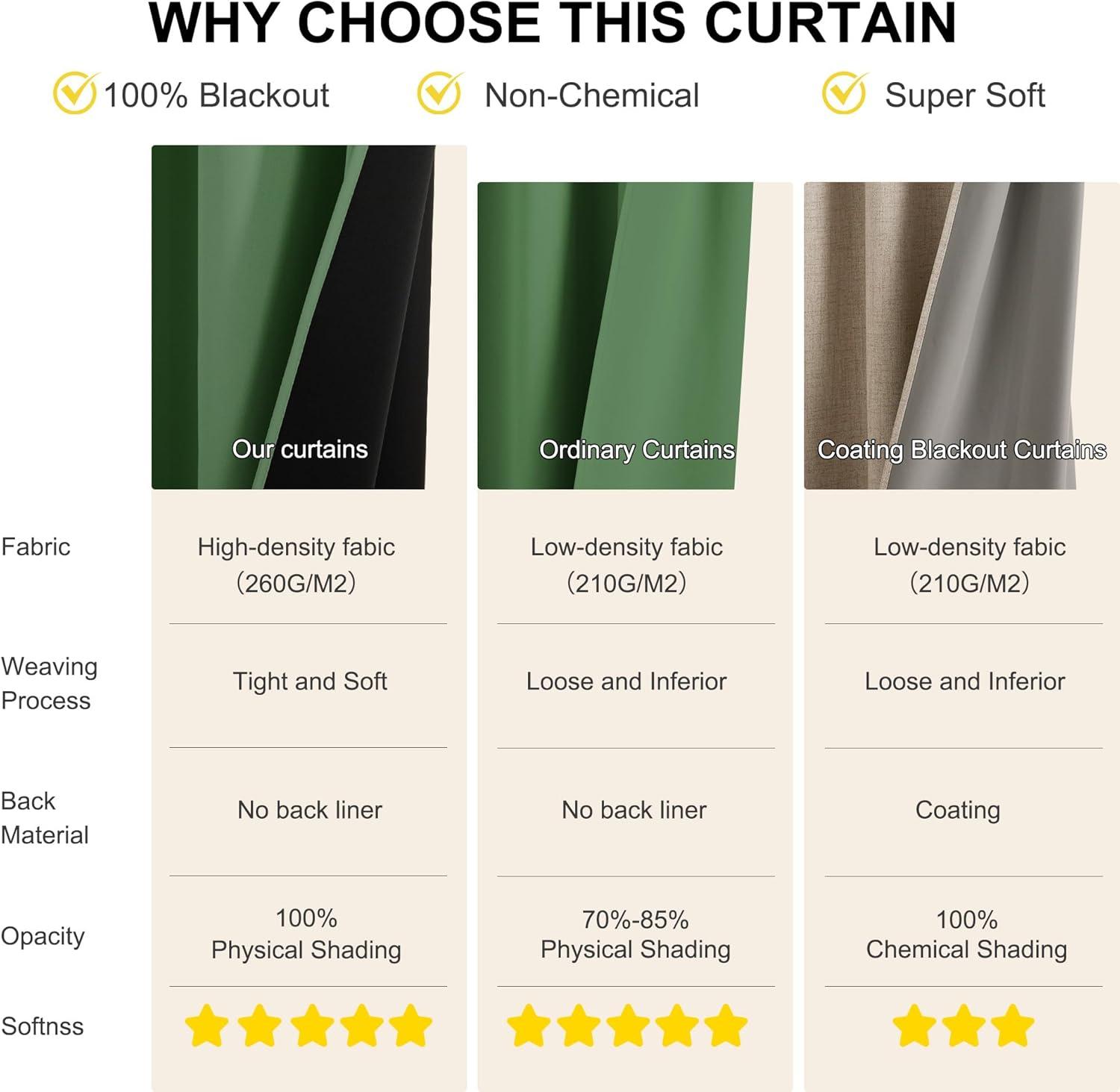 100% BLACKOUT: These curtains are manufactured in a STANDARD 100 certified by the OEKO TEX factory. The curtains can block out 100% bright sunlight and UV ray, bring you a full room darkening environment for good night sleep, afternoon nap and weekend lie-ins.