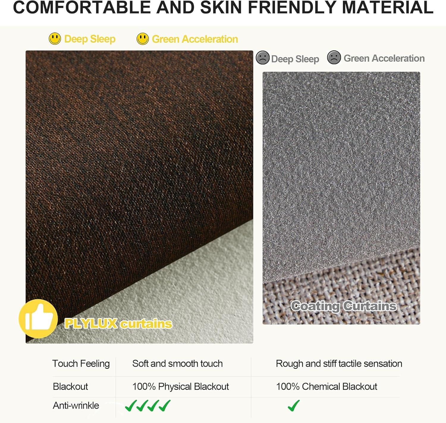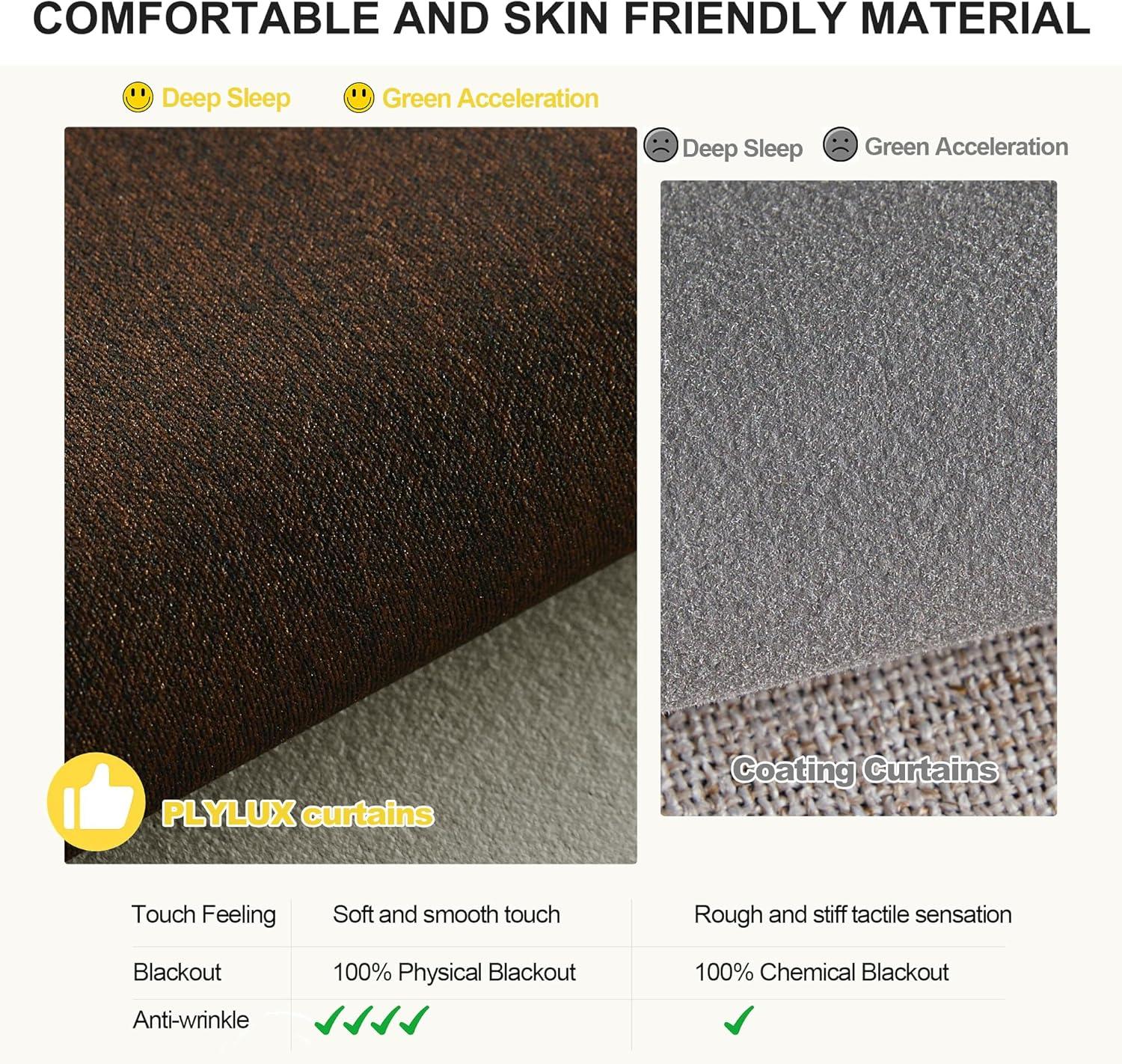 100% BLACKOUT: These curtains are manufactured in a STANDARD 100 certified by the OEKO TEX factory. The curtains can block out 100% bright sunlight and UV ray, bring you a full room darkening environment for good night sleep, afternoon nap and weekend lie-ins.