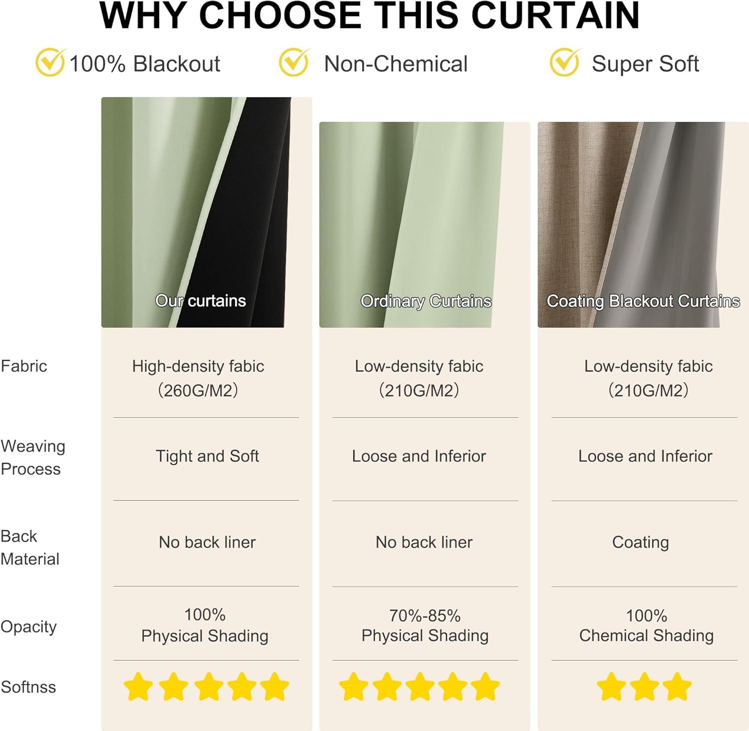 100% BLACKOUT: These curtains are manufactured in a STANDARD 100 certified by the OEKO TEX factory. The curtains can block out 100% bright sunlight and UV ray, bring you a full room darkening environment for good night sleep, afternoon nap and weekend lie-ins.