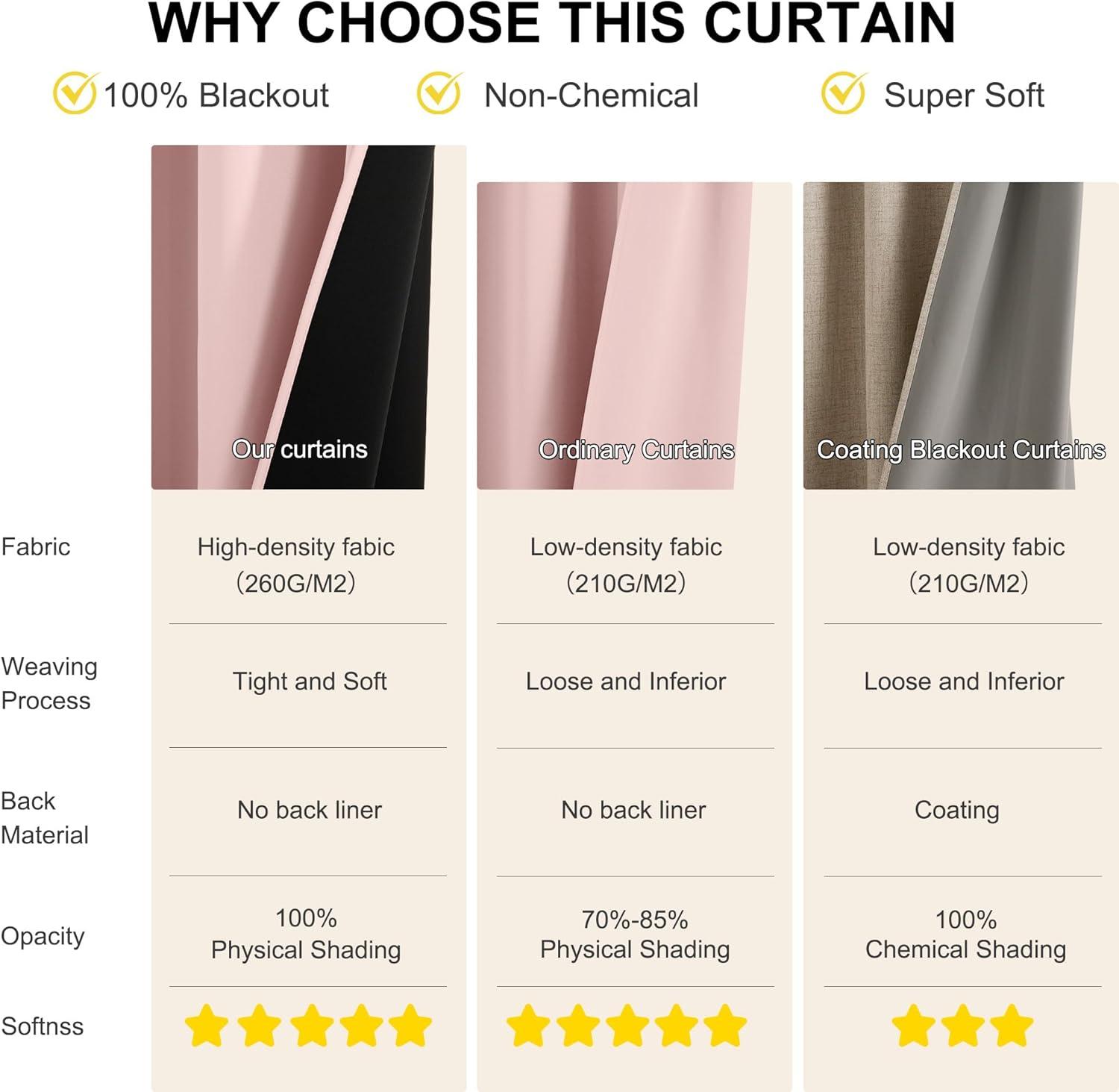 100% BLACKOUT: These curtains are manufactured in a STANDARD 100 certified by the OEKO TEX factory. The curtains can block out 100% bright sunlight and UV ray, bring you a full room darkening environment for good night sleep, afternoon nap and weekend lie-ins.