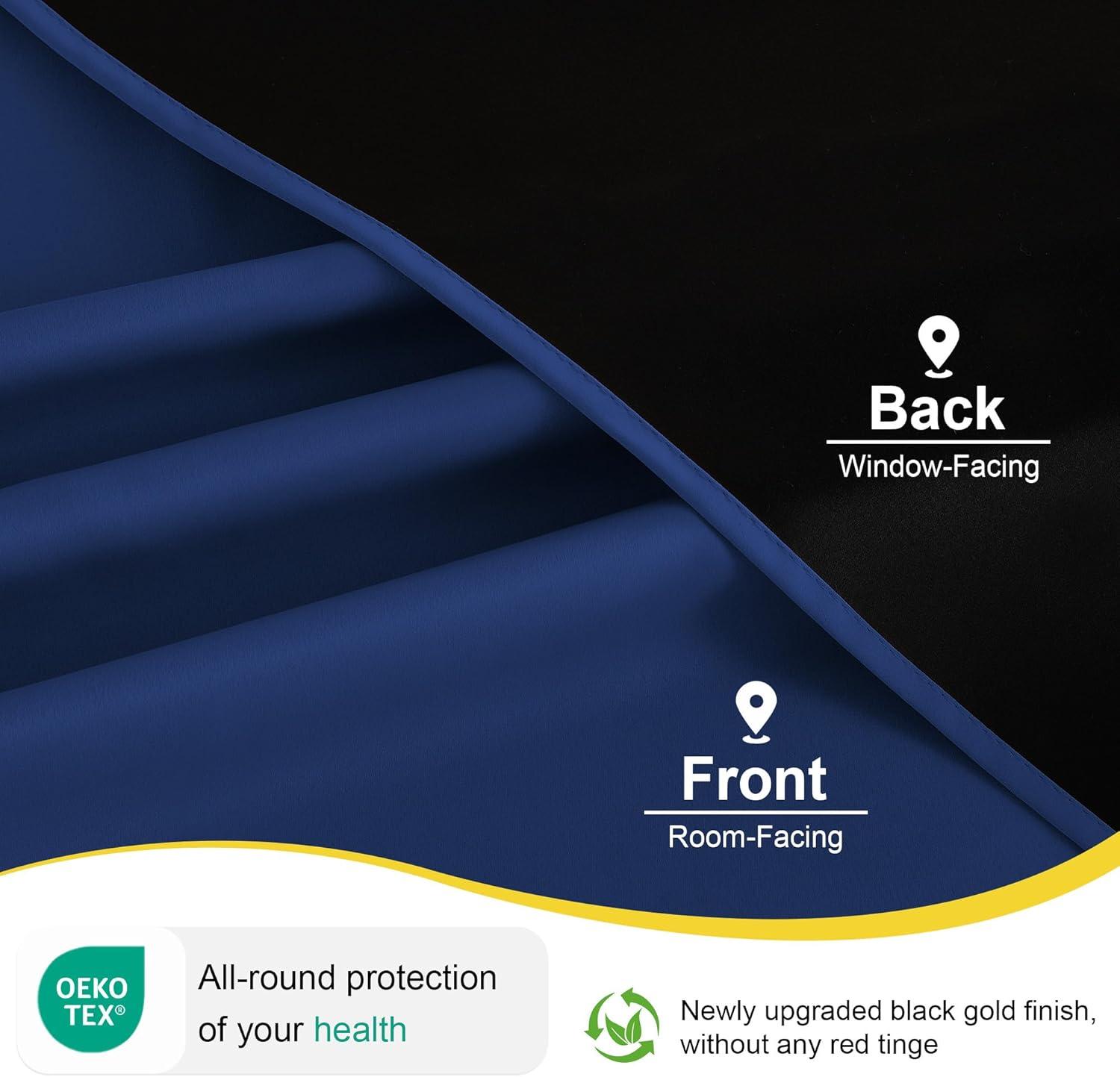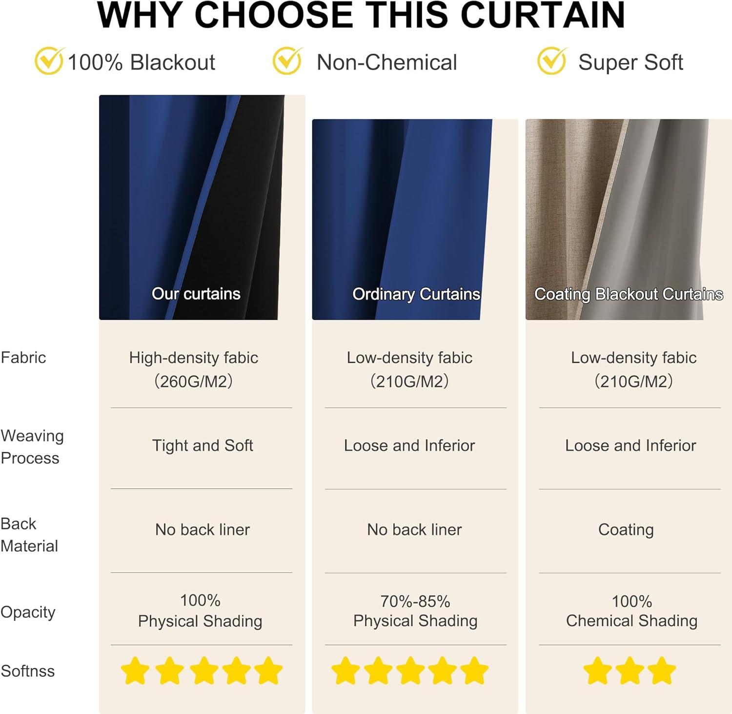 100% BLACKOUT: These curtains are manufactured in a STANDARD 100 certified by the OEKO TEX factory. The curtains can block out 100% bright sunlight and UV ray, bring you a full room darkening environment for good night sleep, afternoon nap and weekend lie-ins.