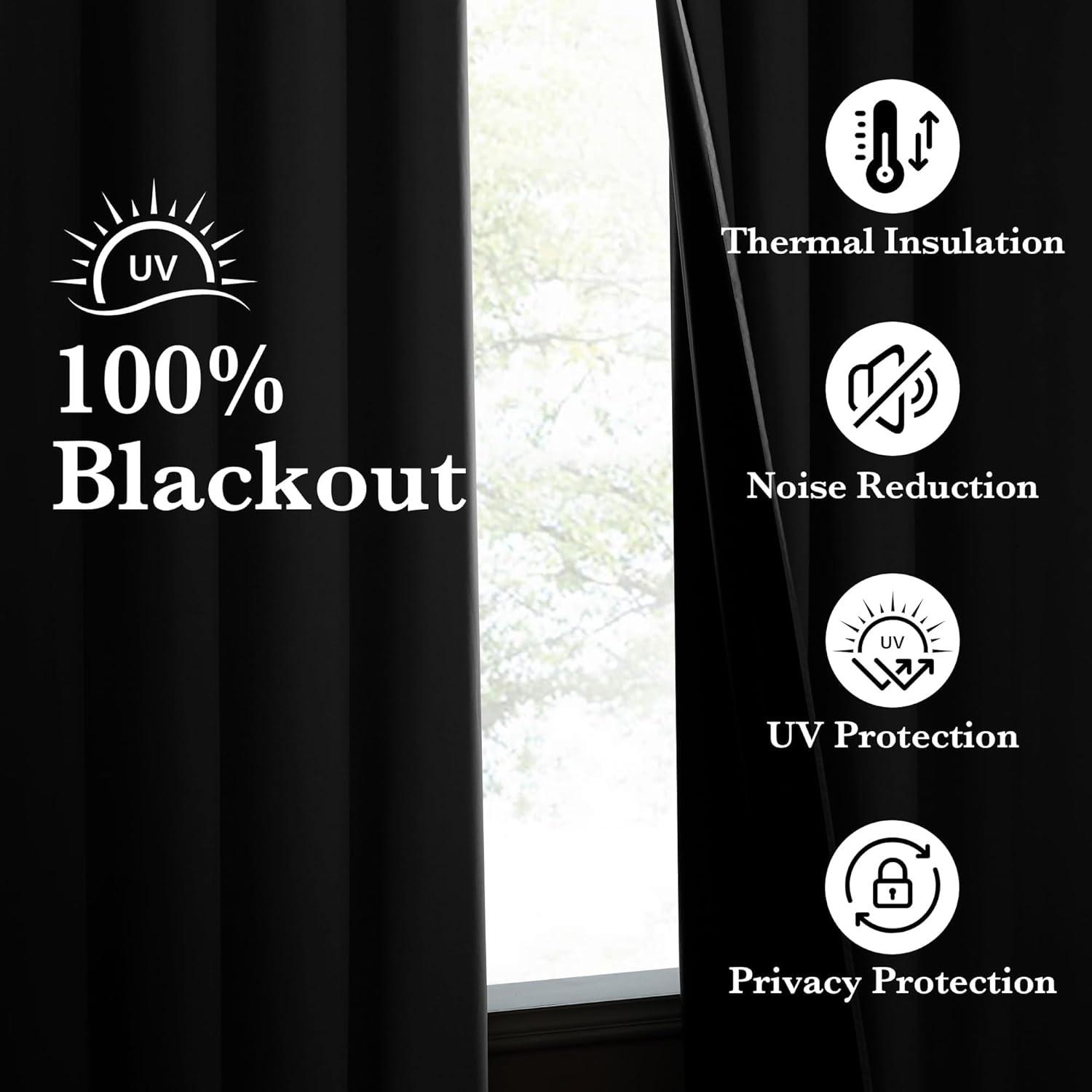 100% Blackout: These full blackout curtains are designed with a black coating liner backing that completely blocks out sunlight and harmful UV rays. They create a dark environment, allowing you to enjoy a restful sleep even during the day.