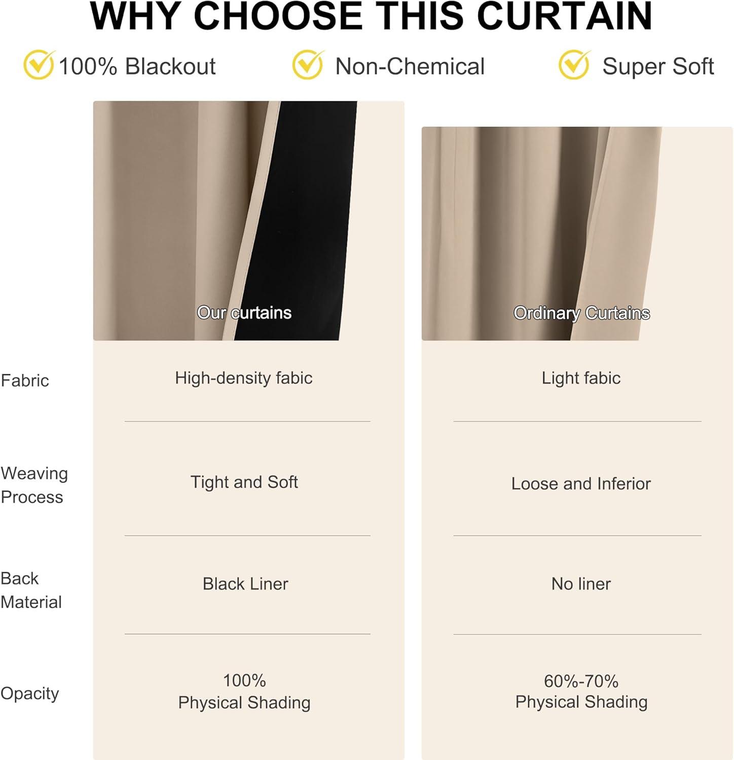 100% BLACKOUT: Sew in black liner backing makes the drapes thick enough to completely keep out the 100% SUNLIGHT and UV RAY. The greatest benefit is to offer you a real dark environment, bringing you a good night's sleep during the day.