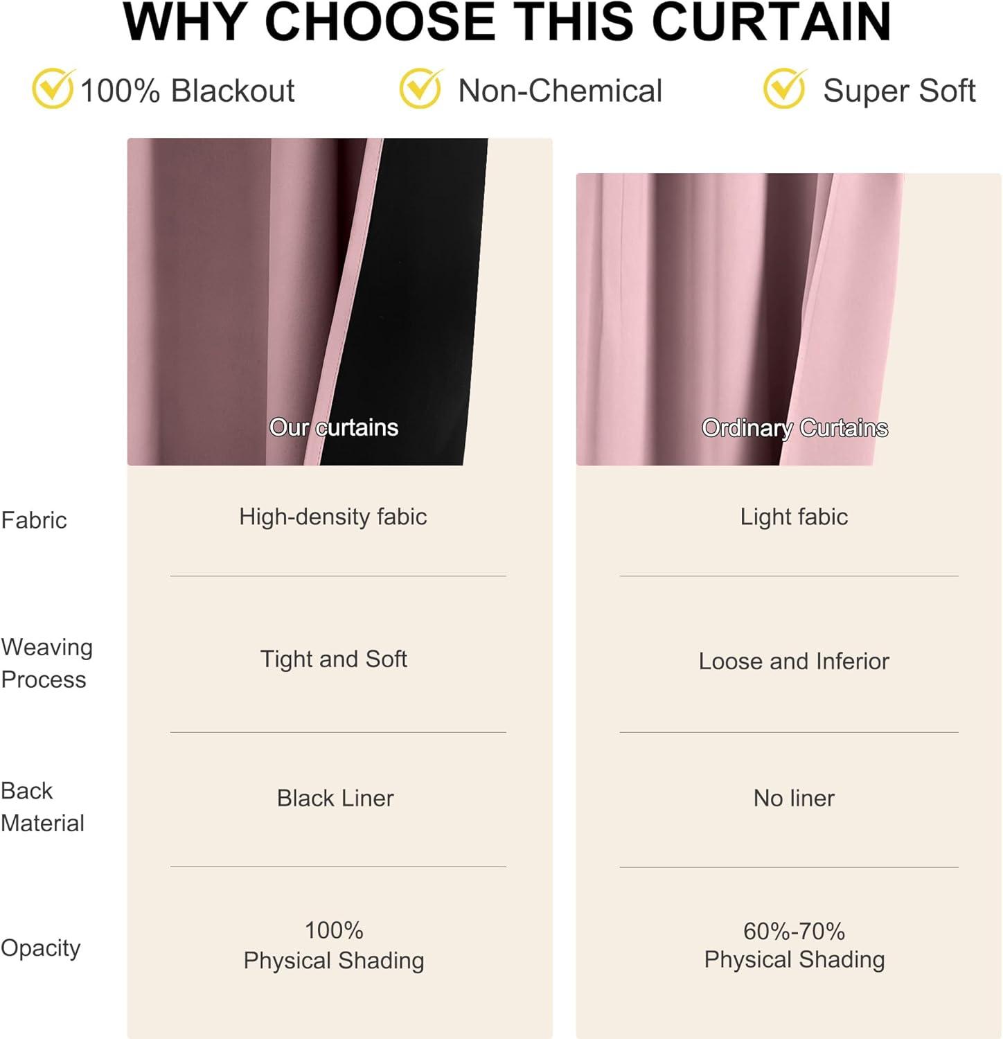 100% BLACKOUT: Sew in black liner backing makes the drapes thick enough to completely keep out the 100% SUNLIGHT and UV RAY. The greatest benefit is to offer you a real dark environment, bringing you a good night's sleep during the day.