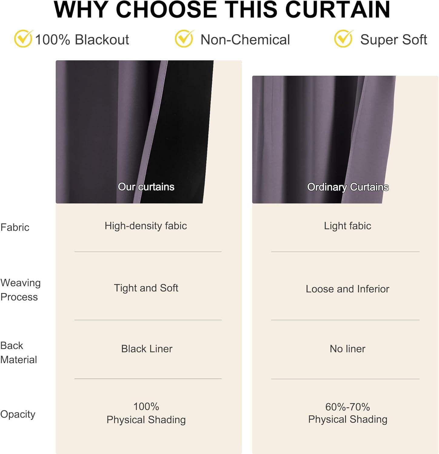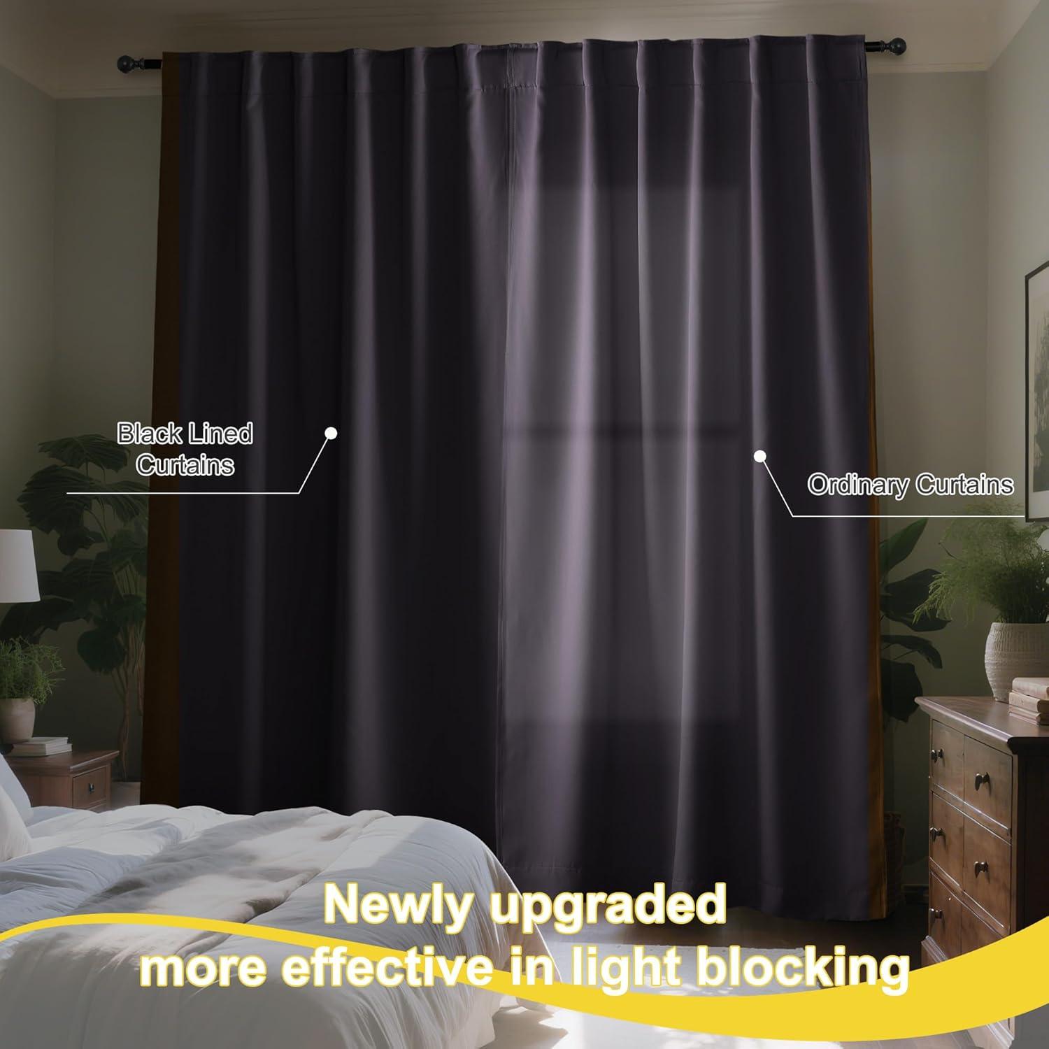 100% BLACKOUT: Sew in black liner backing makes the drapes thick enough to completely keep out the 100% SUNLIGHT and UV RAY. The greatest benefit is to offer you a real dark environment, bringing you a good night's sleep during the day.