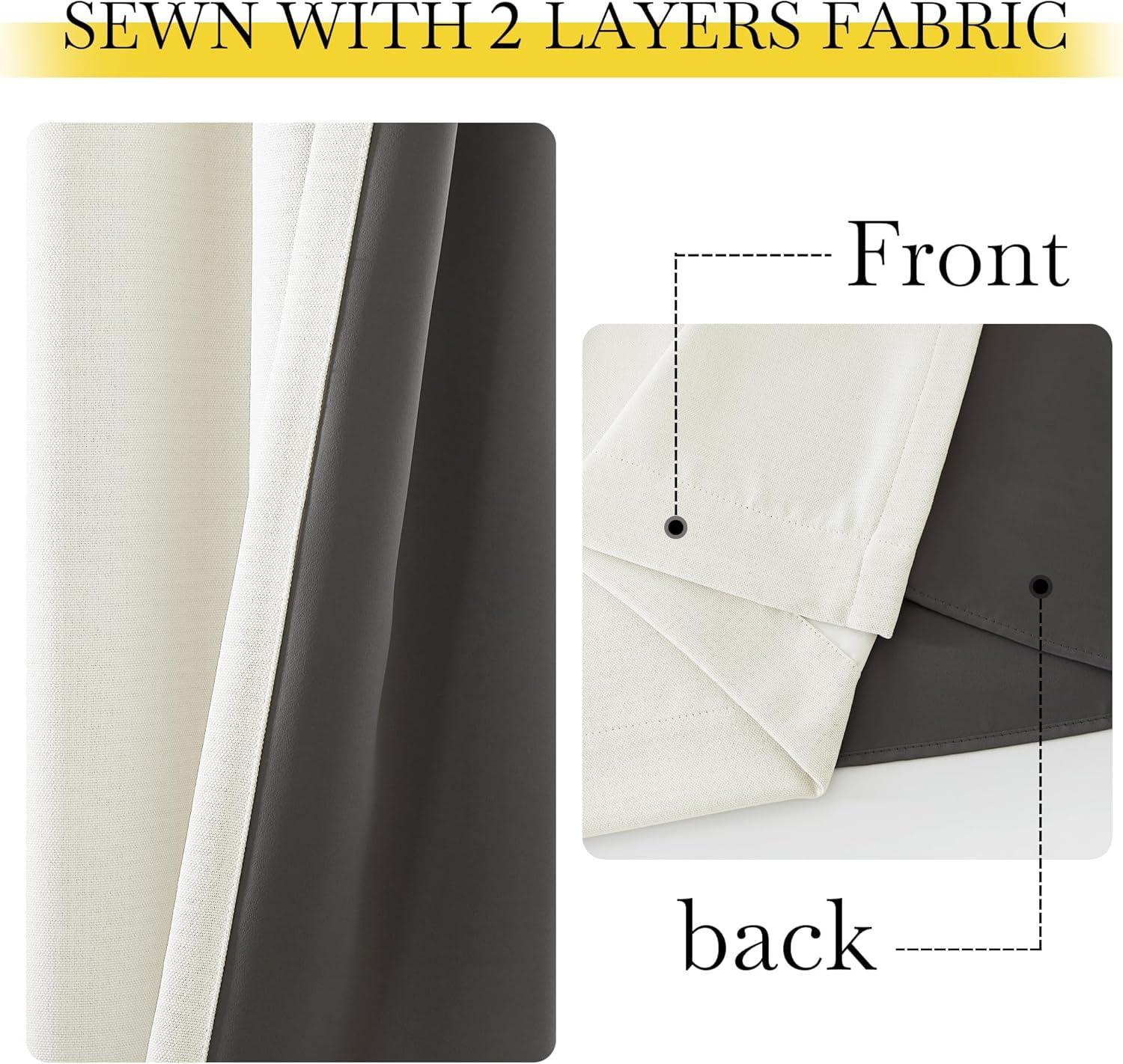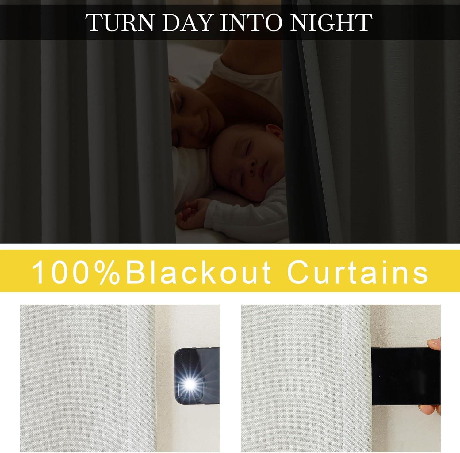 100% Blackout: The faux linen real blackout curtains sewn in grey liner backing to keep out the sunlight and UV ray completely. Also offer you a really dark environment, bringing you a good night's sleep during the day.