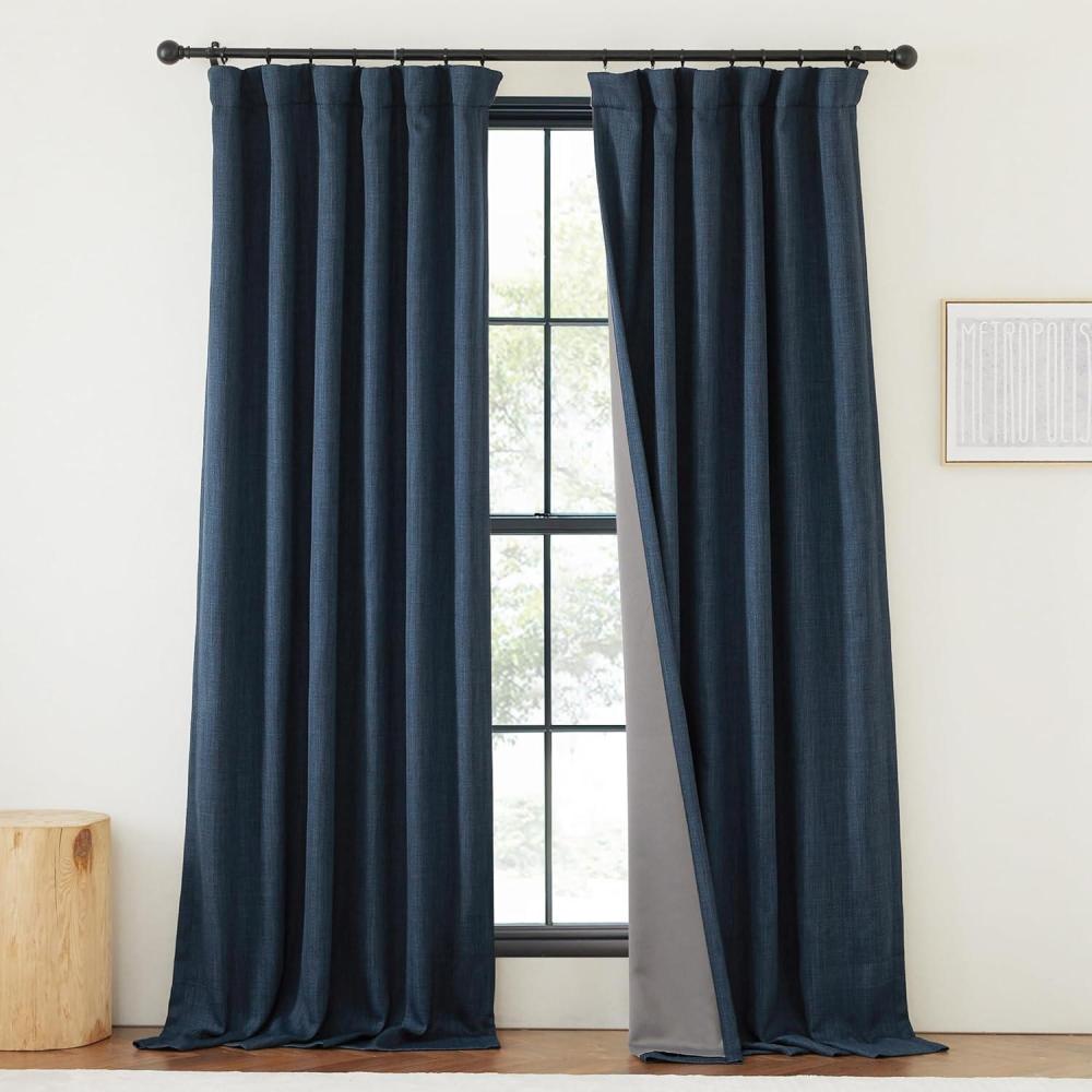 Ready Made: Package includes 2 panels of faux linen 100% blackout pinch pleated curtains, each measuring 50″W (100″W for pair), with 3 hanging options(2.2″ diam) to suit most of the standard or decorative curtain rods.