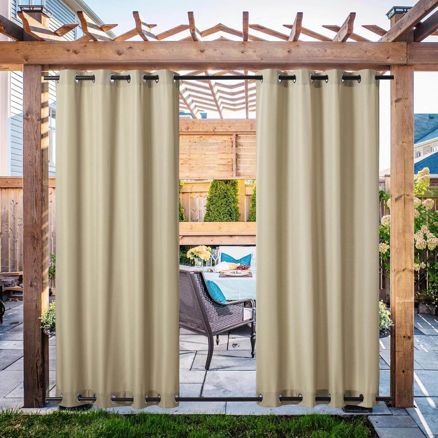 NICETOWN 2 Panels Outdoor Curtains Weighted Sunblock with Rustproof Grommet Top and Bottom, Thermal Insulated Fixed Windproof Blackout Outdoor Curtain Drapes Privacy for Patio, W52 x L95, Grey(Tan)