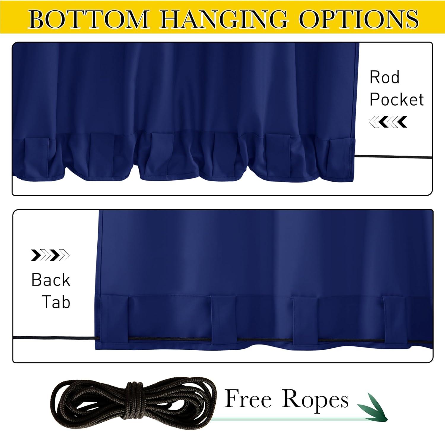 Ready-Made: The package includes 2 panels of weighted blackout cabana curtains and a piece of rope for fixing. The Rustproof grommets & Back Tab at the top and bottom fit standard rods up to 1.6″ in diameter.