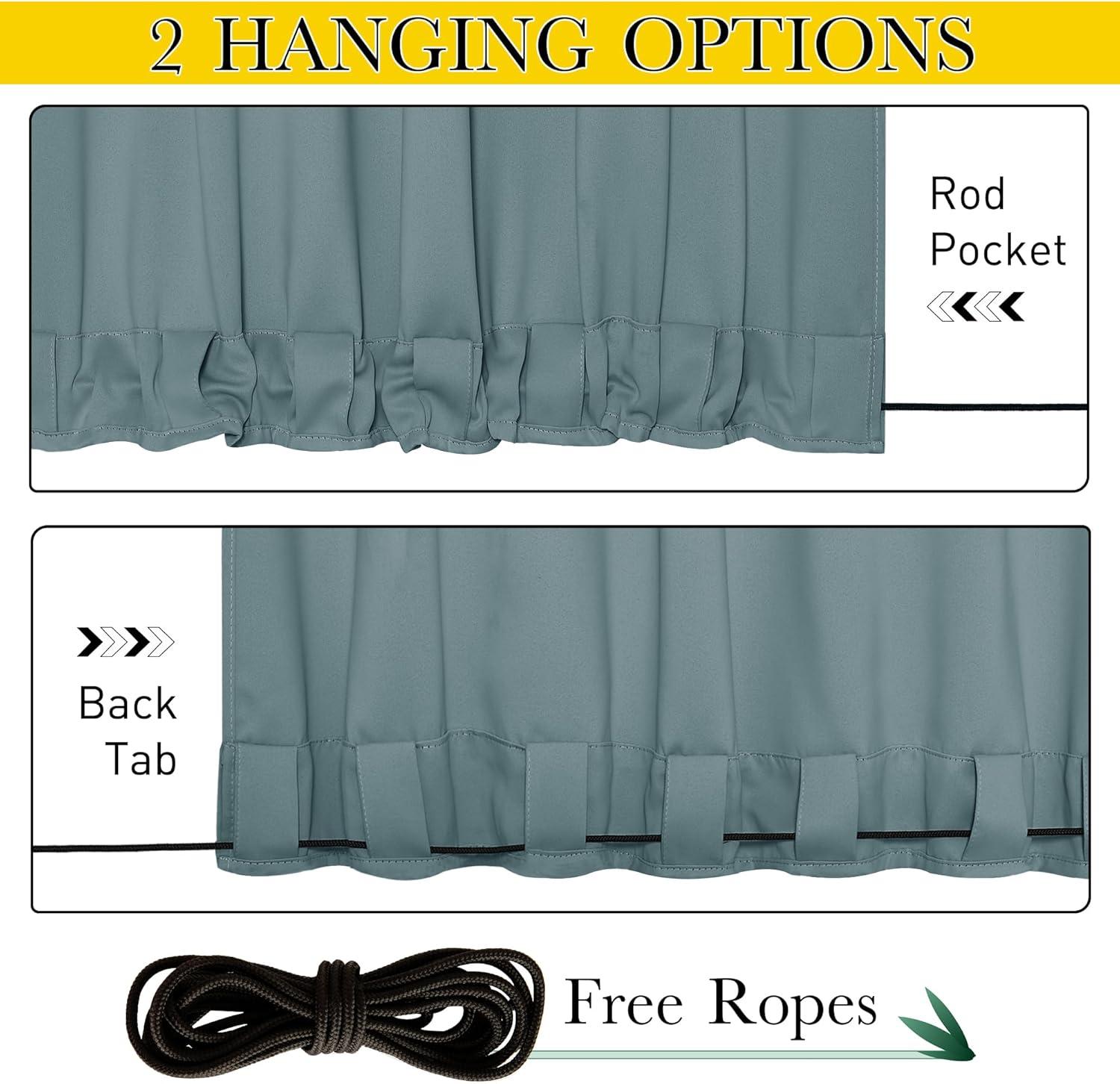 Ready-Made: The package includes 2 panels of weighted blackout cabana curtains and a piece of rope for fixing. The Rustproof grommets & Back Tab at the top and bottom fit standard rods up to 1.6″ in diameter.