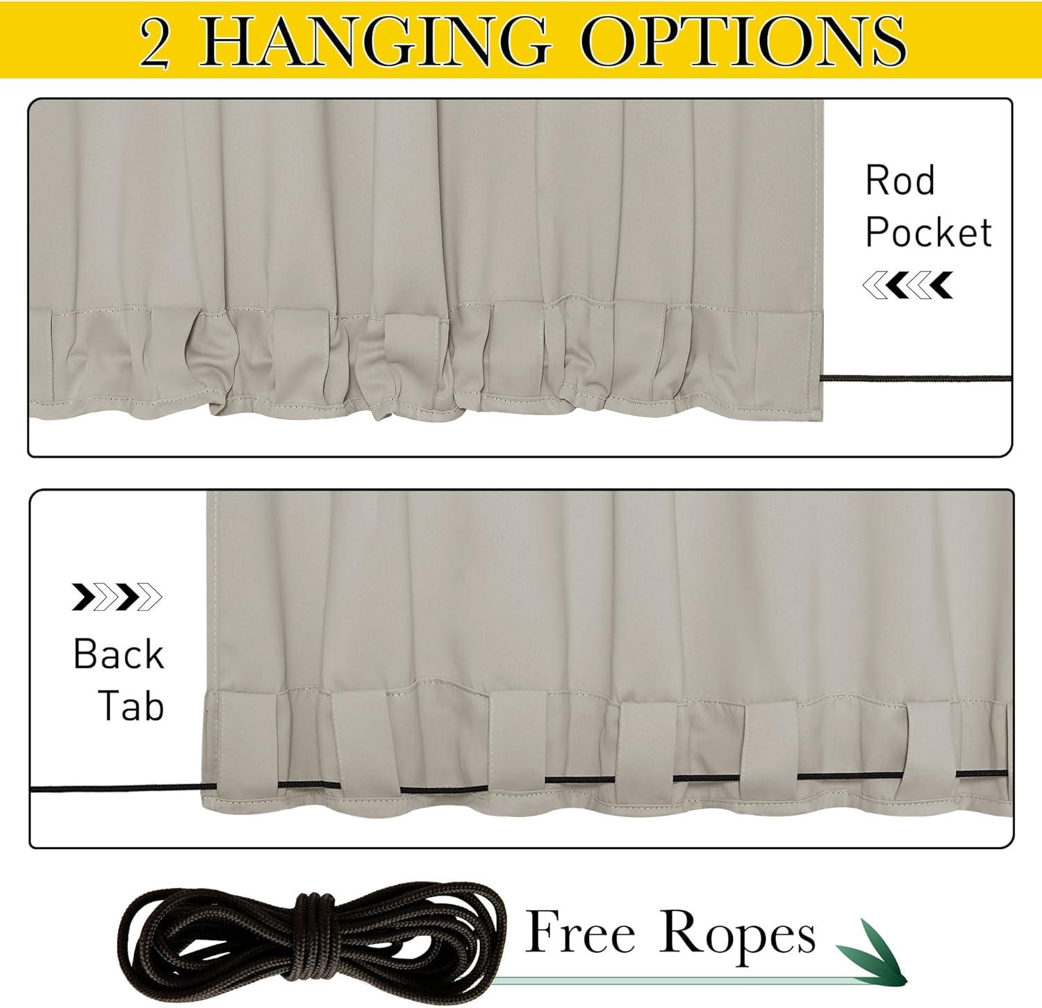 Ready-Made: The package includes 2 panels of weighted blackout cabana curtains and a piece of rope for fixing. The Rustproof grommets & Back Tab at the top and bottom fit standard rods up to 1.6″ in diameter.