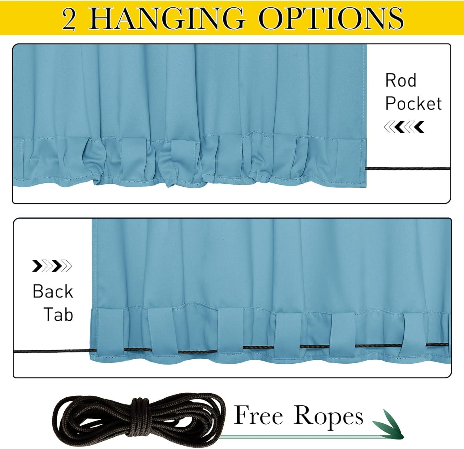 Ready-Made: The package includes 2 panels of weighted blackout cabana curtains and a piece of rope for fixing. The Rustproof grommets & Back Tab at the top and bottom fit standard rods up to 1.6″ in diameter.