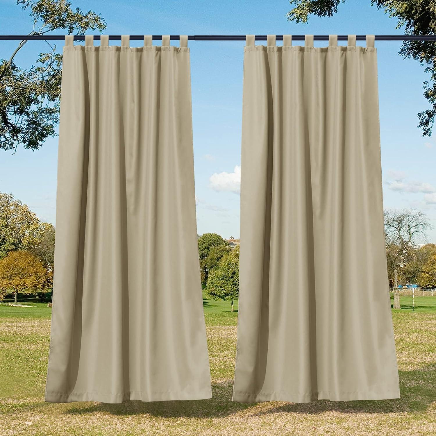 NICETOWN 2 Pieces Outdoor Curtainss for Patio Waterproof 95 inch Length, Sticky Tab Top Thermal Insulated Blackout Window Treatment Dividers Protect Privacy for Cabana/Arbor, W52 x L95, Silver Grey(Tan)