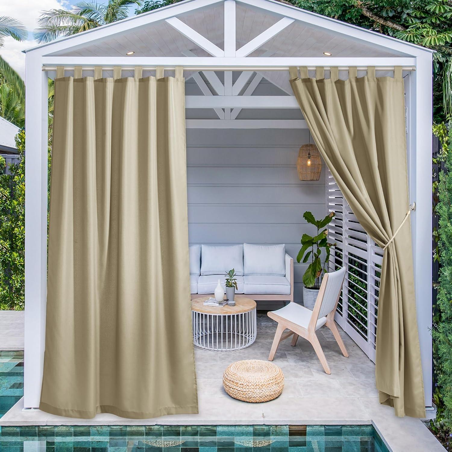 GOOD PERFORMANCE: NICETOWN sticky tab top outdoor curtain will fit both indoor and outdoor living which will be a safe and privacy divider of public such as porch, balcony, patio, cabana or garden.