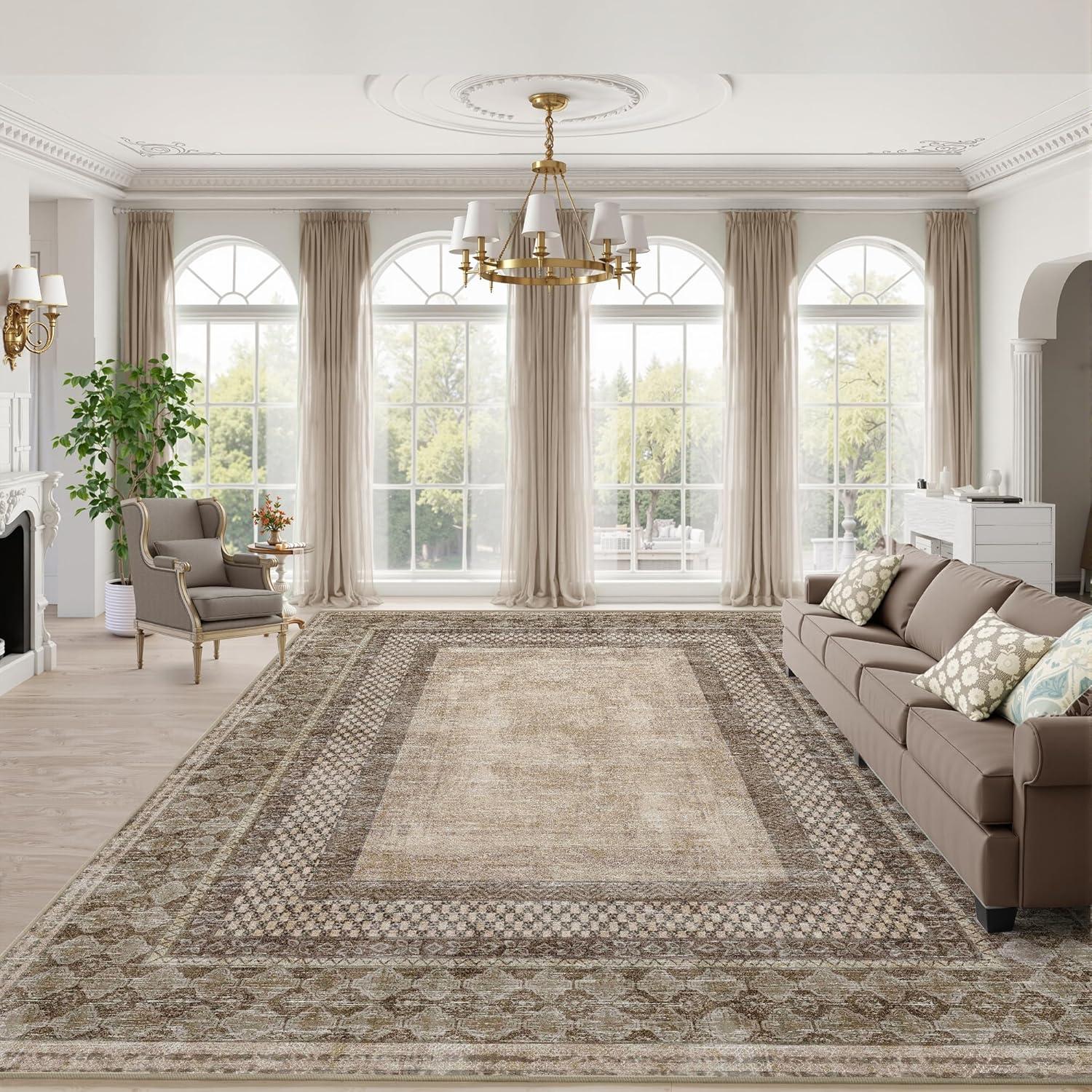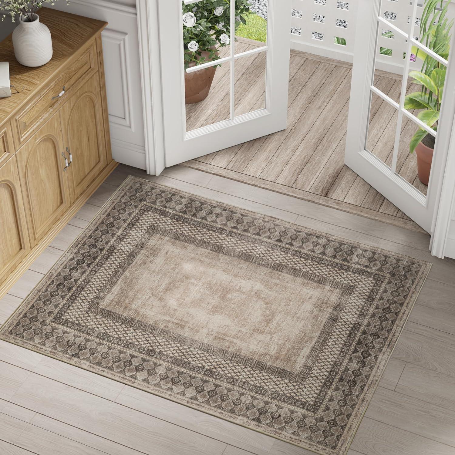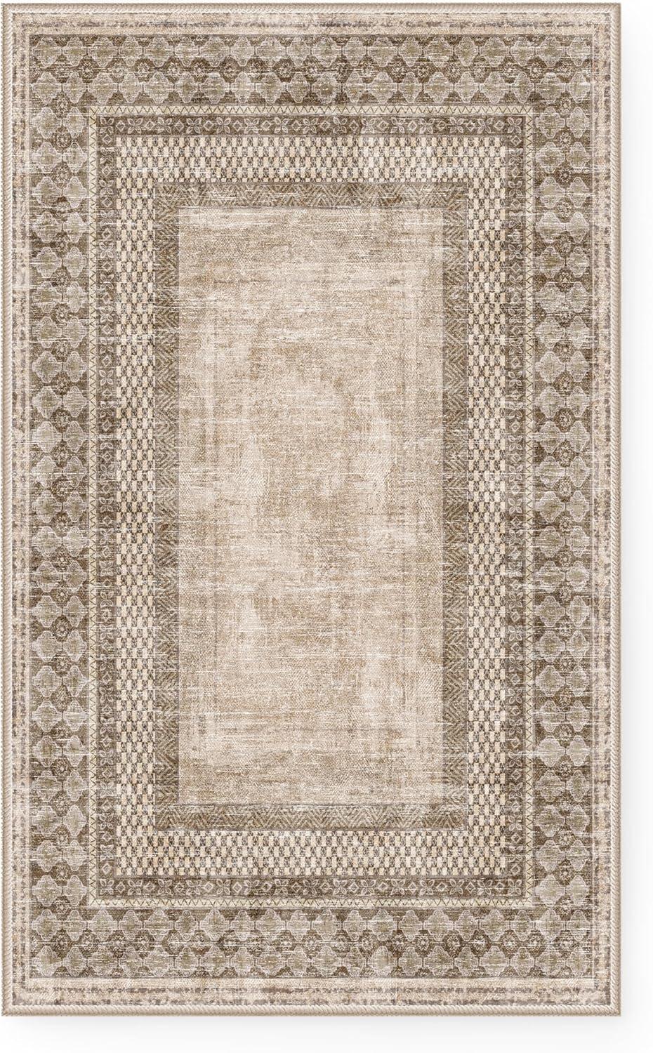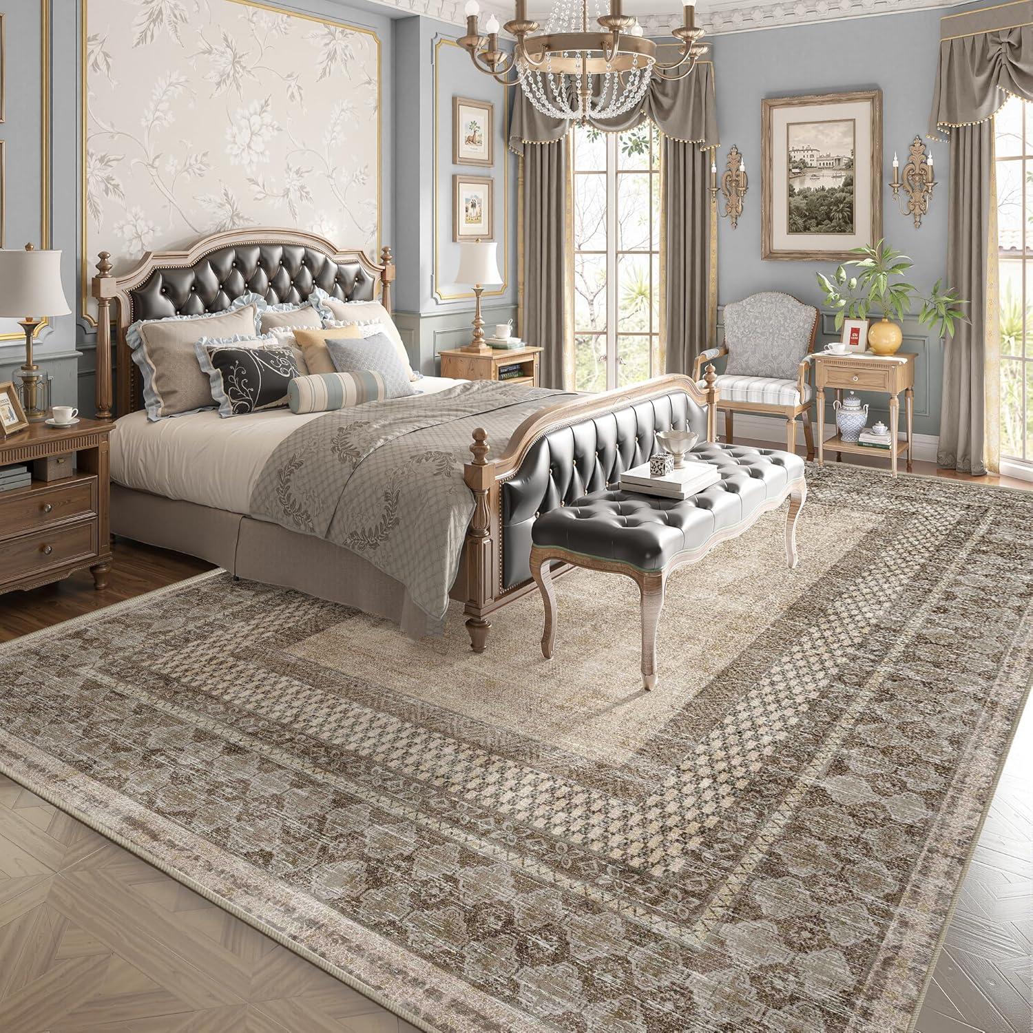 NICETOWN 8x10 Ultra-Thin Brown Oriental Rug for Bedroom, Tumble Washable Area Rugs 8x10, Boho Non-Slip Vintage Living Room Rugs, Oriental Carpet Entrance for Kitchen, Laundry, Bathroom, Bedroom(Brown)