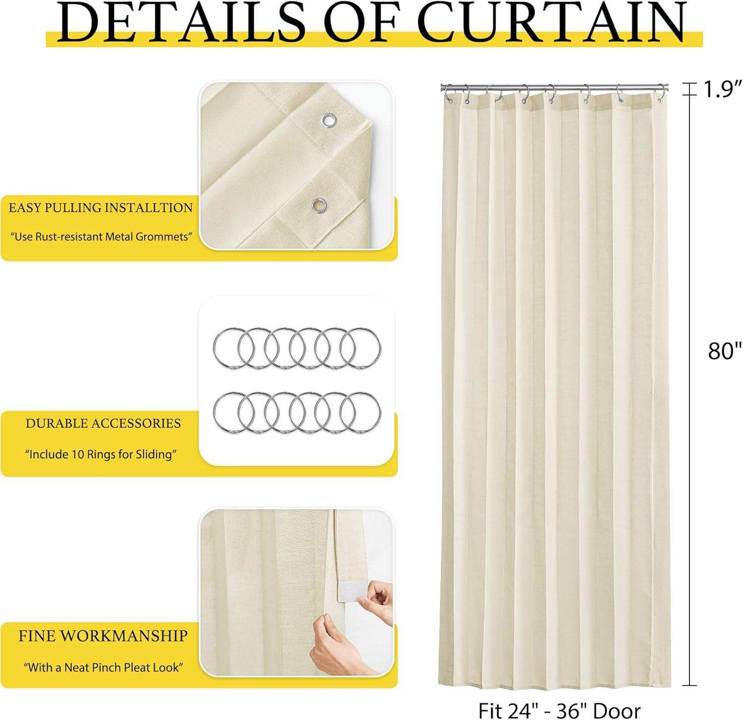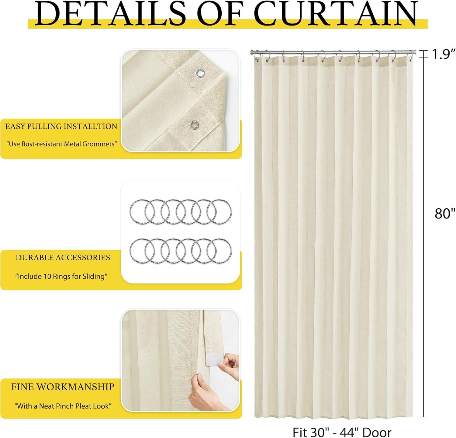 Product Info.: The door curtain package comes with 1 panel and Hooks. Each panel measures 38 inches wide by 80 inches long. The length excludes the rings.It's easy hanging and removing on an existing rod.