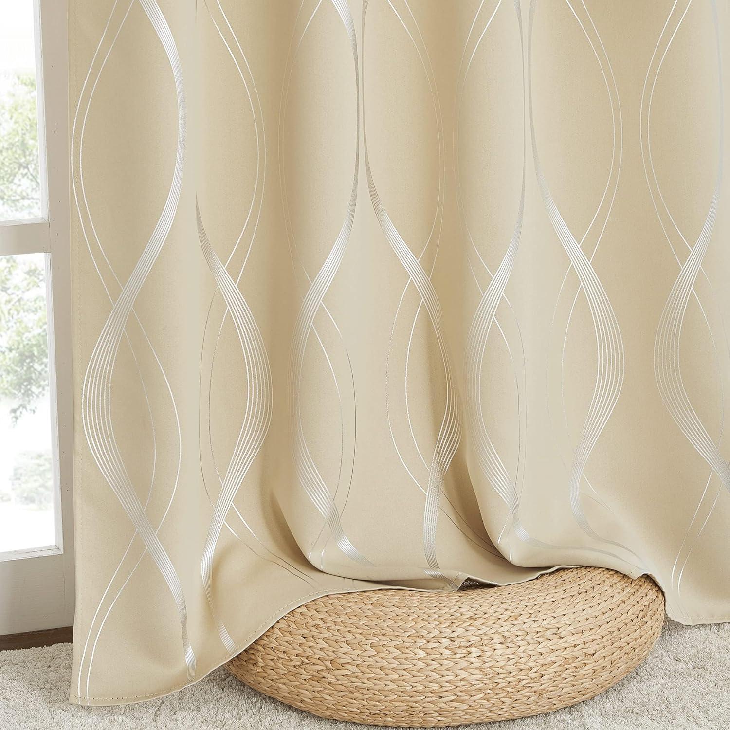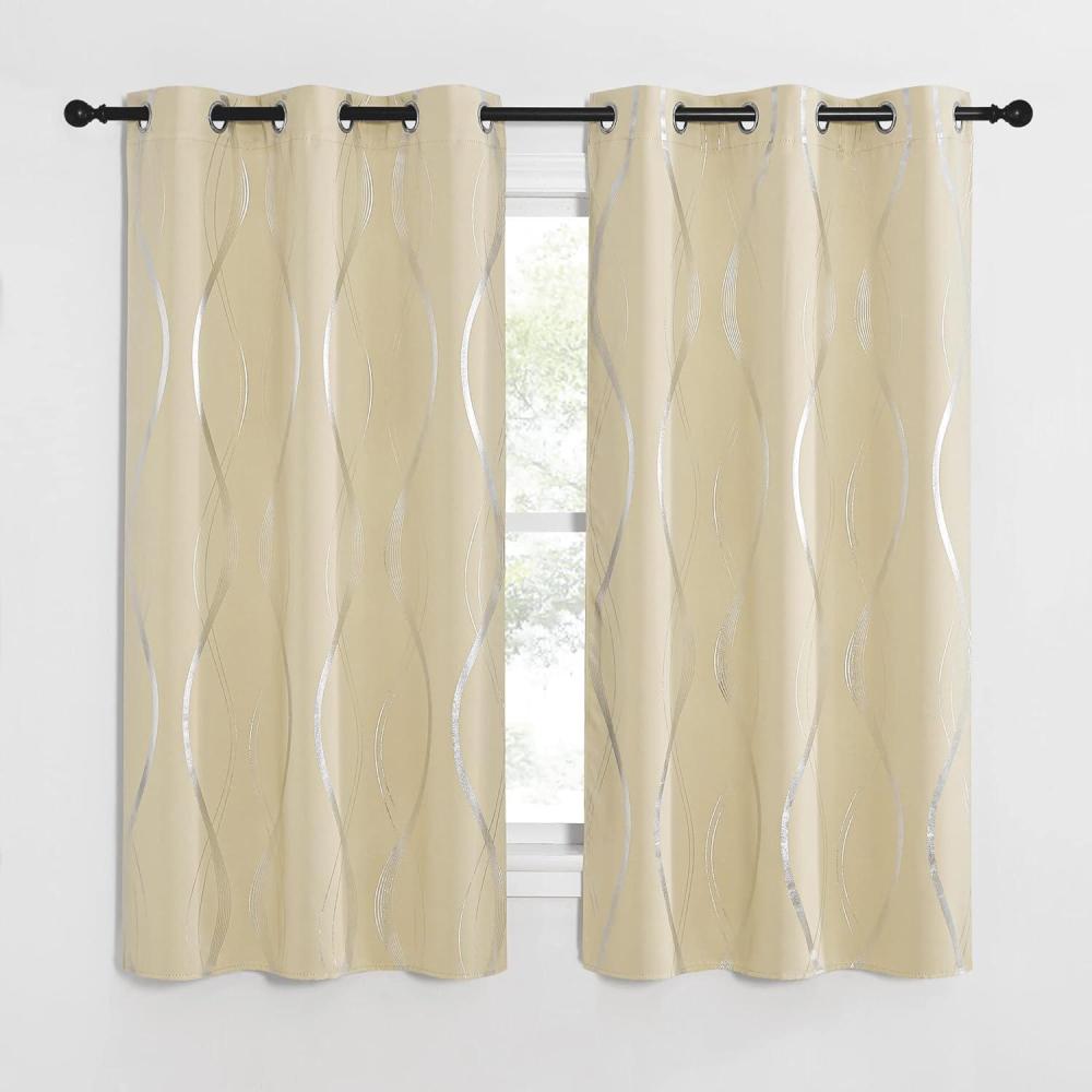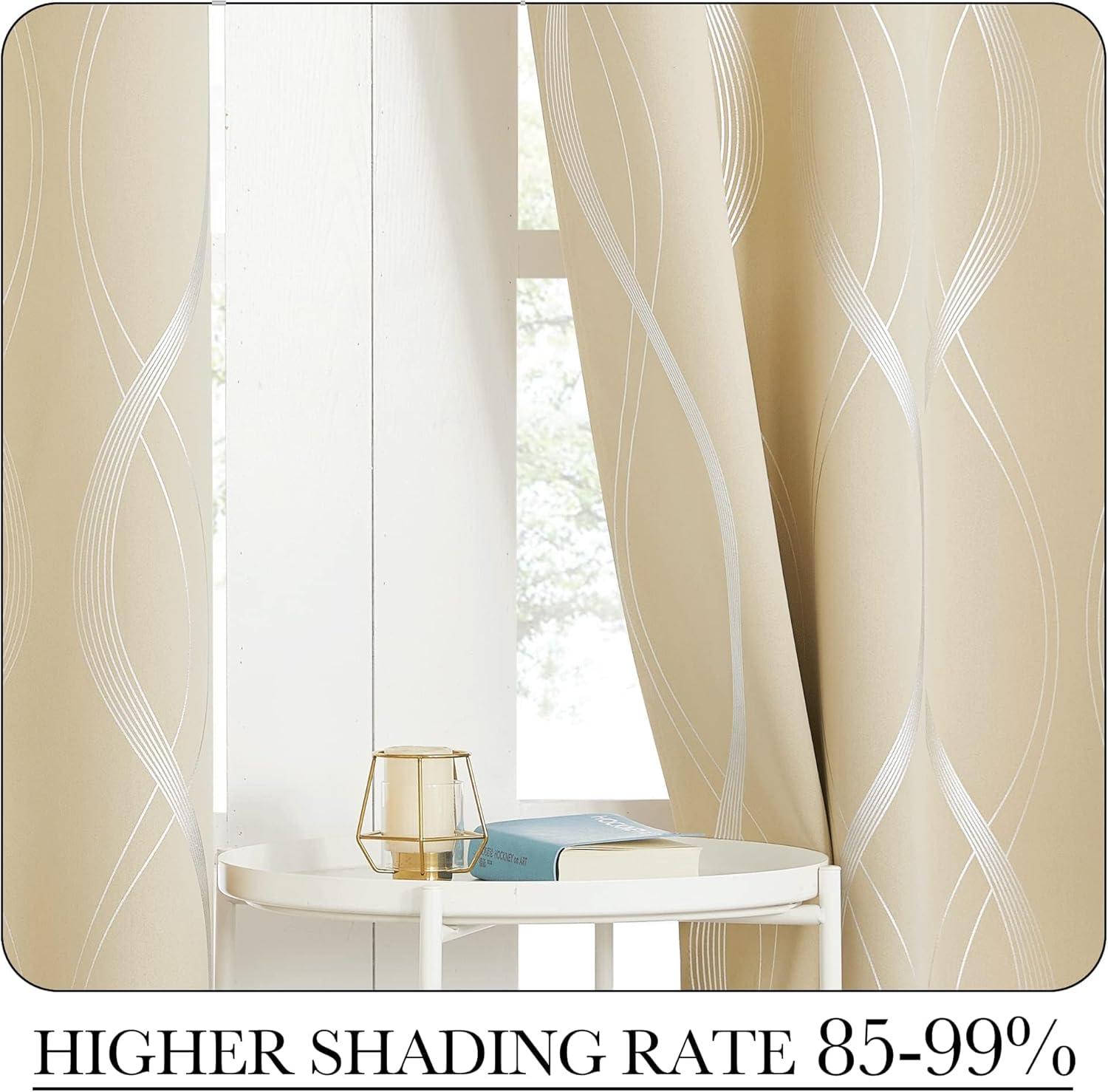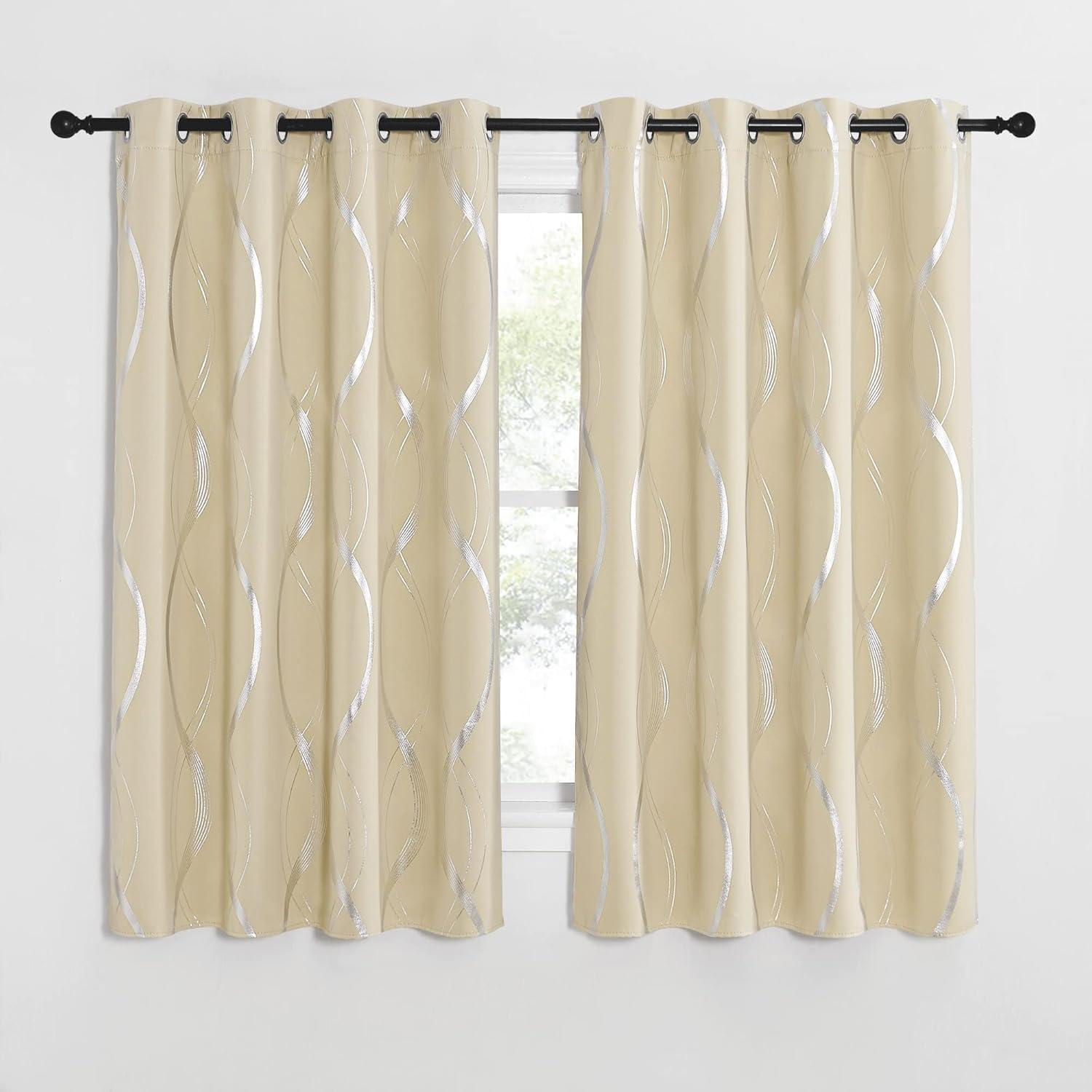 imageNICETOWN Blackout Short Curtains Panels for Bedroom Microfiber Noise Reducing Thermal Insulated Wave Line Foil Print Design Drapes for Office Classroom Stone Blue 2 Panels 52 x 54 Inch1  Beige