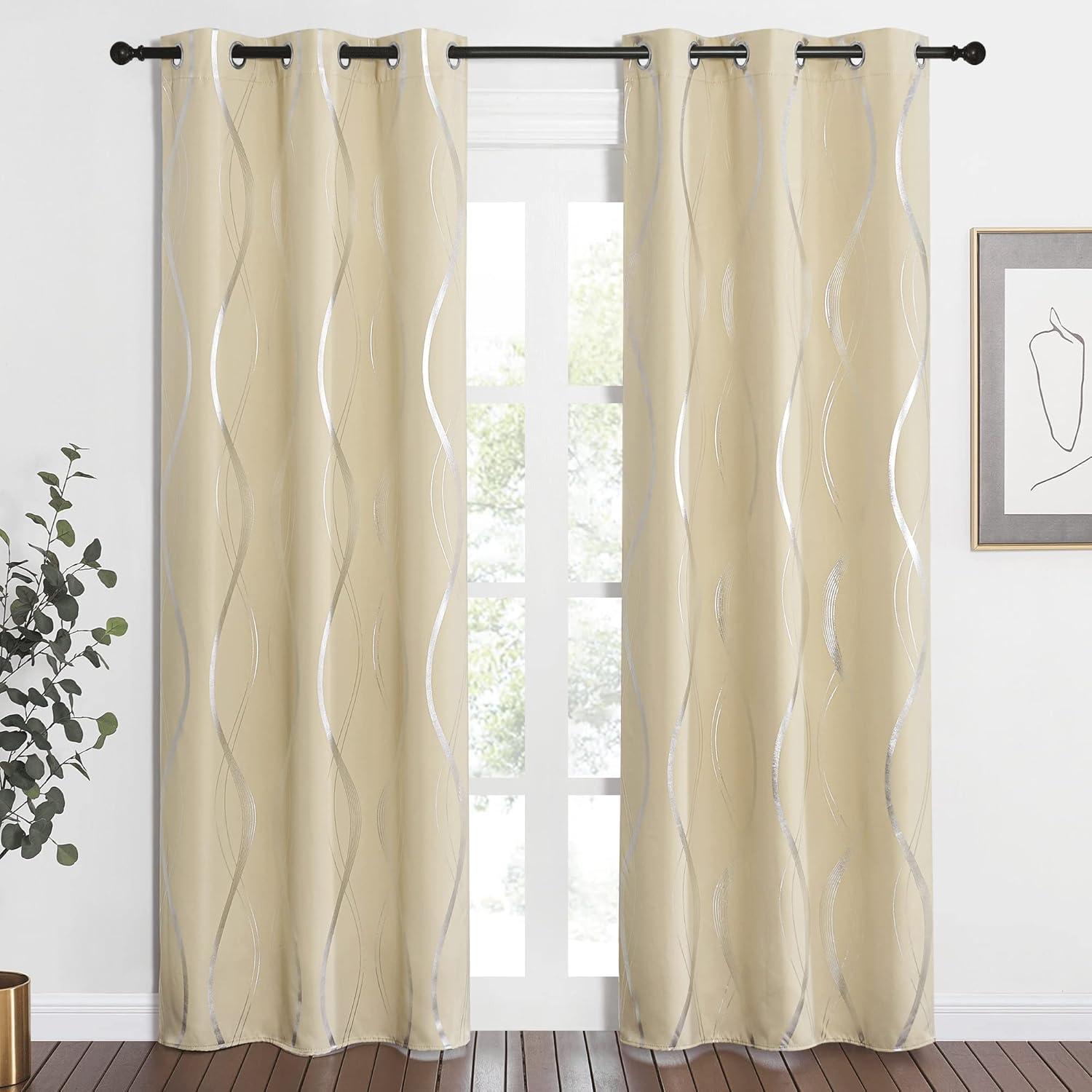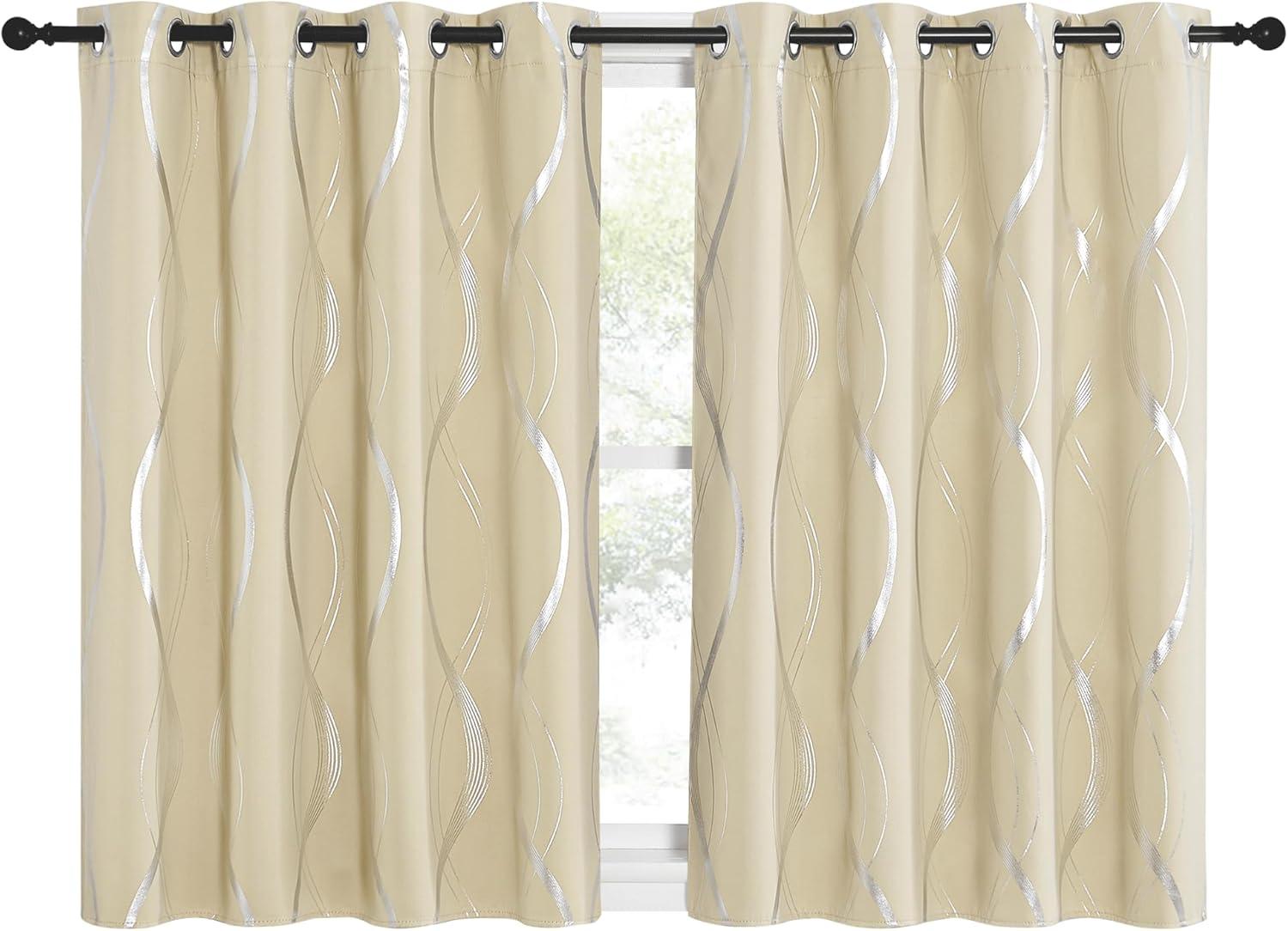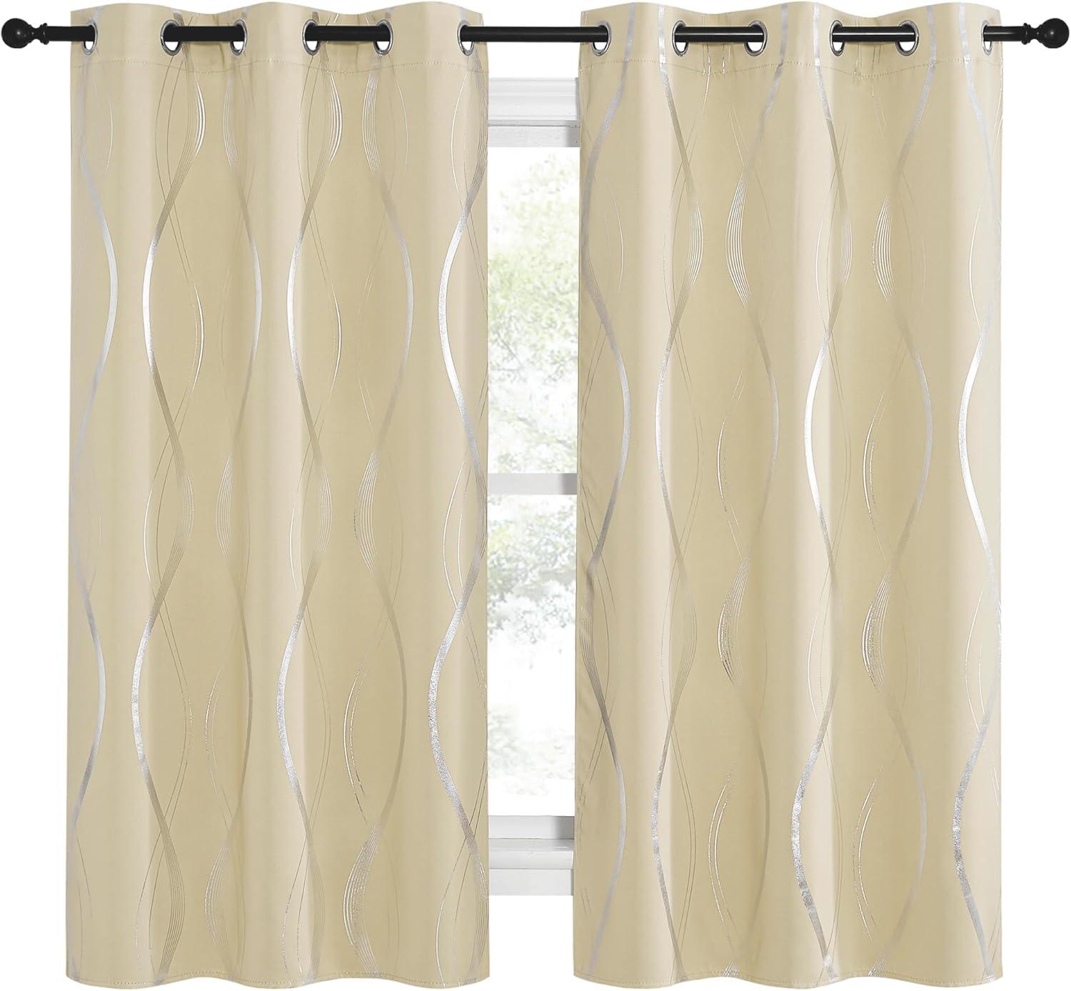 NICETOWN Blackout Short Curtains Panels for Bedroom, Microfiber Noise Reducing Thermal Insulated Wave Line Foil Print Design Drapes for Office, Classroom (Stone Blue, 2 Panels, 52 x 54 Inch)(1 – Beige)
