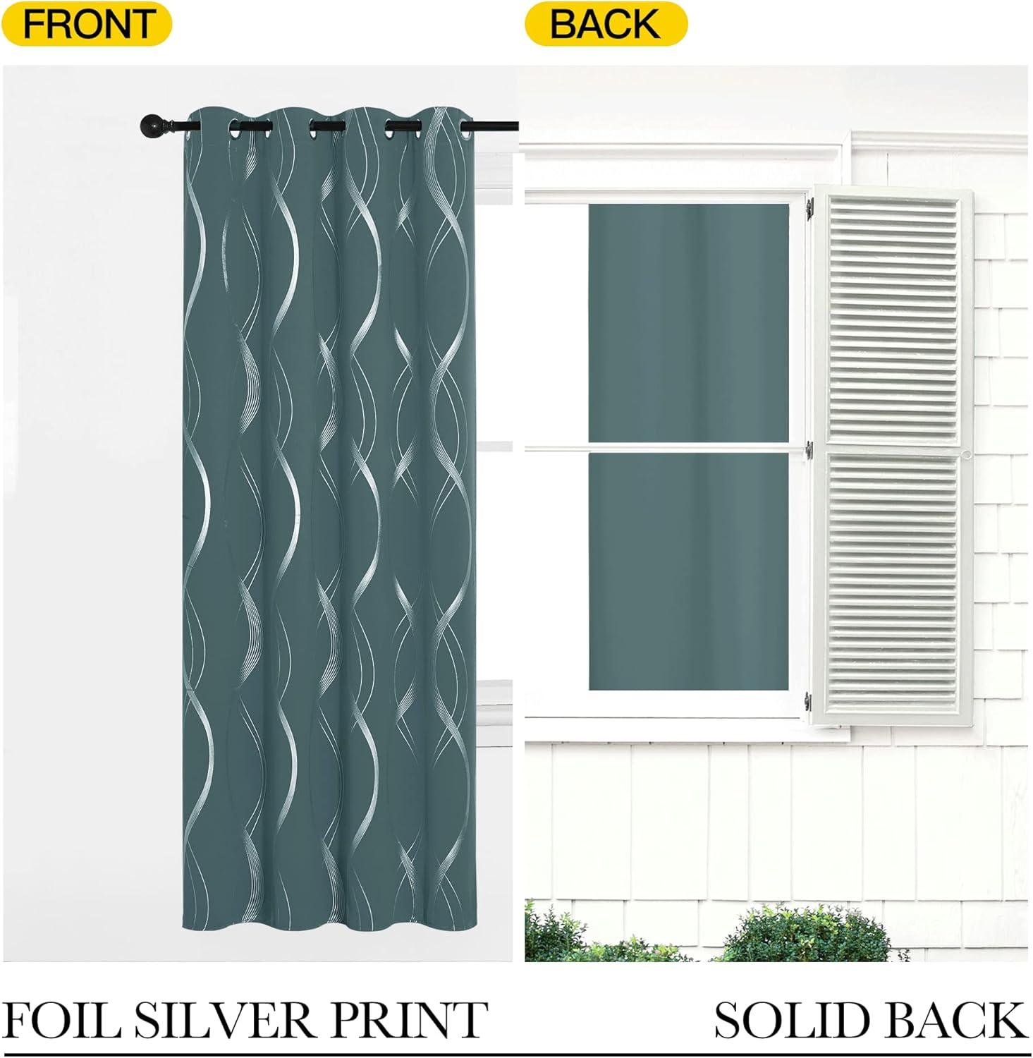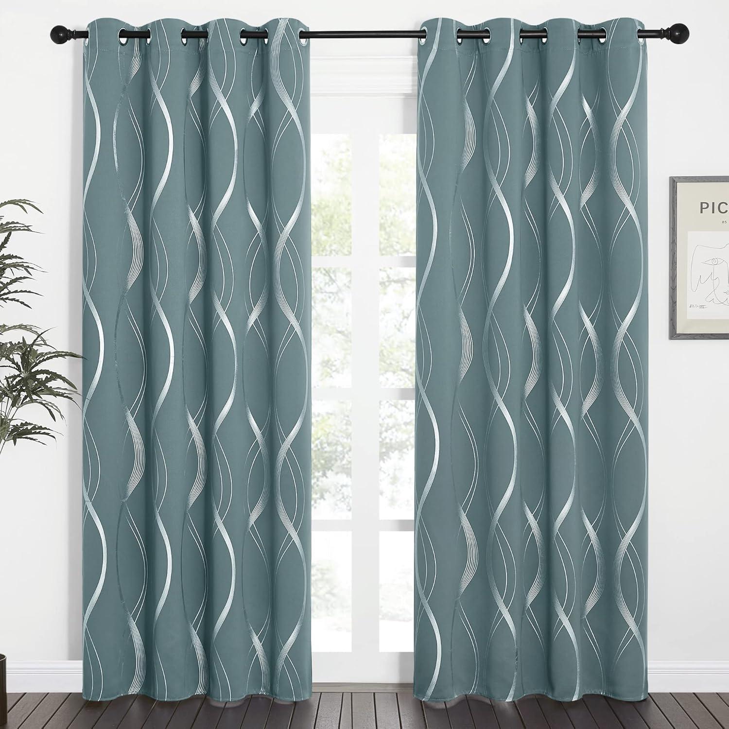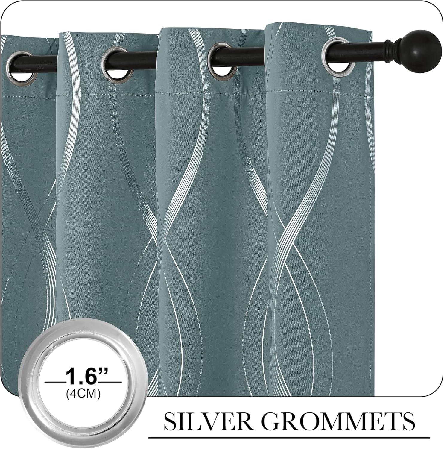 NICETOWN Blackout Short Curtains Panels for Bedroom, Microfiber Noise Reducing Thermal Insulated Wave Line Foil Print Design Drapes for Office, Classroom (Stone Blue, 2 Panels, 52 x 54 Inch)(1 – Greyish Green)