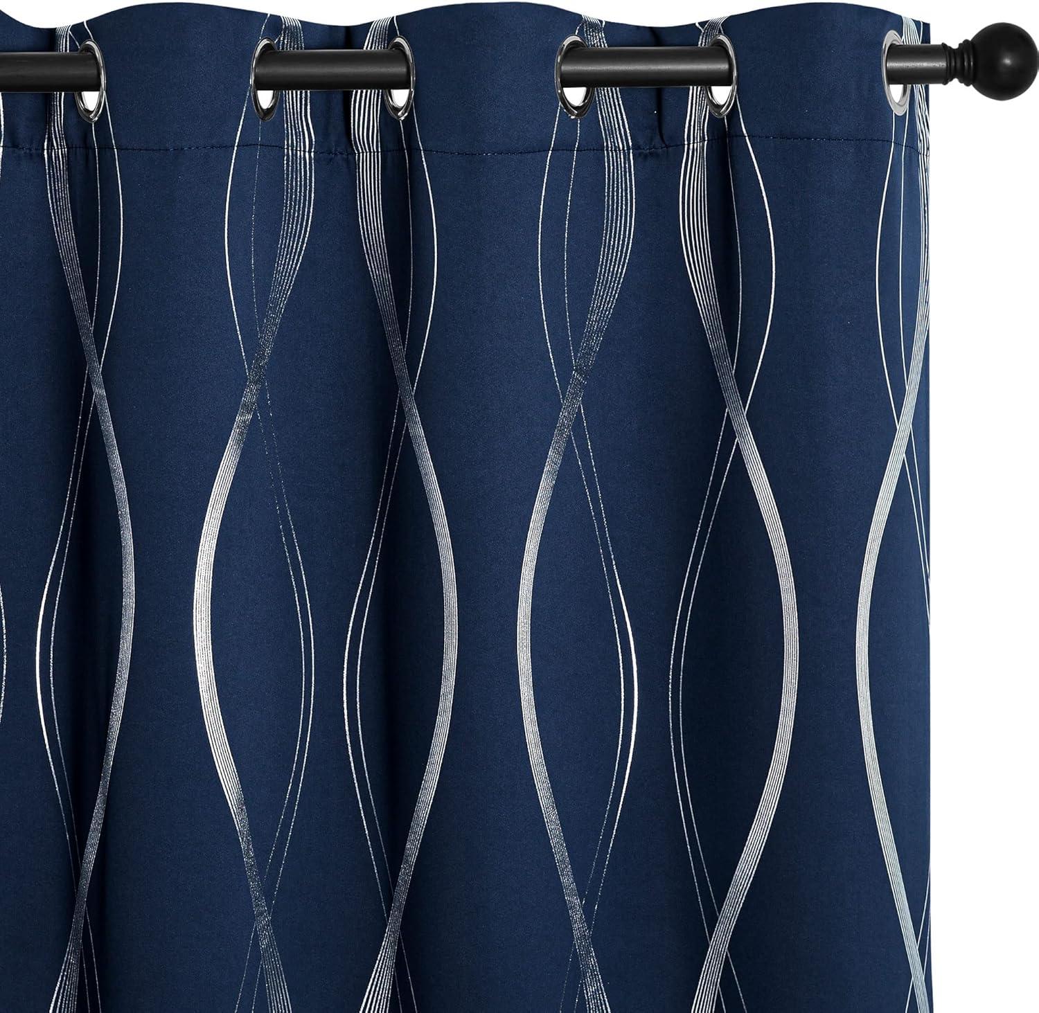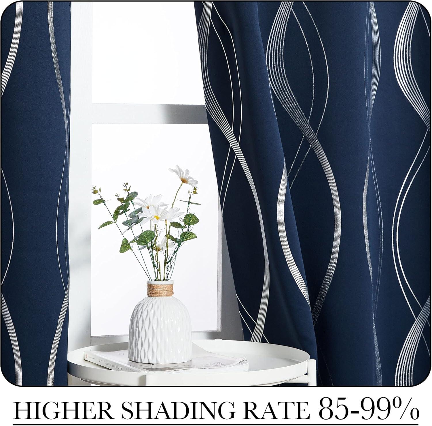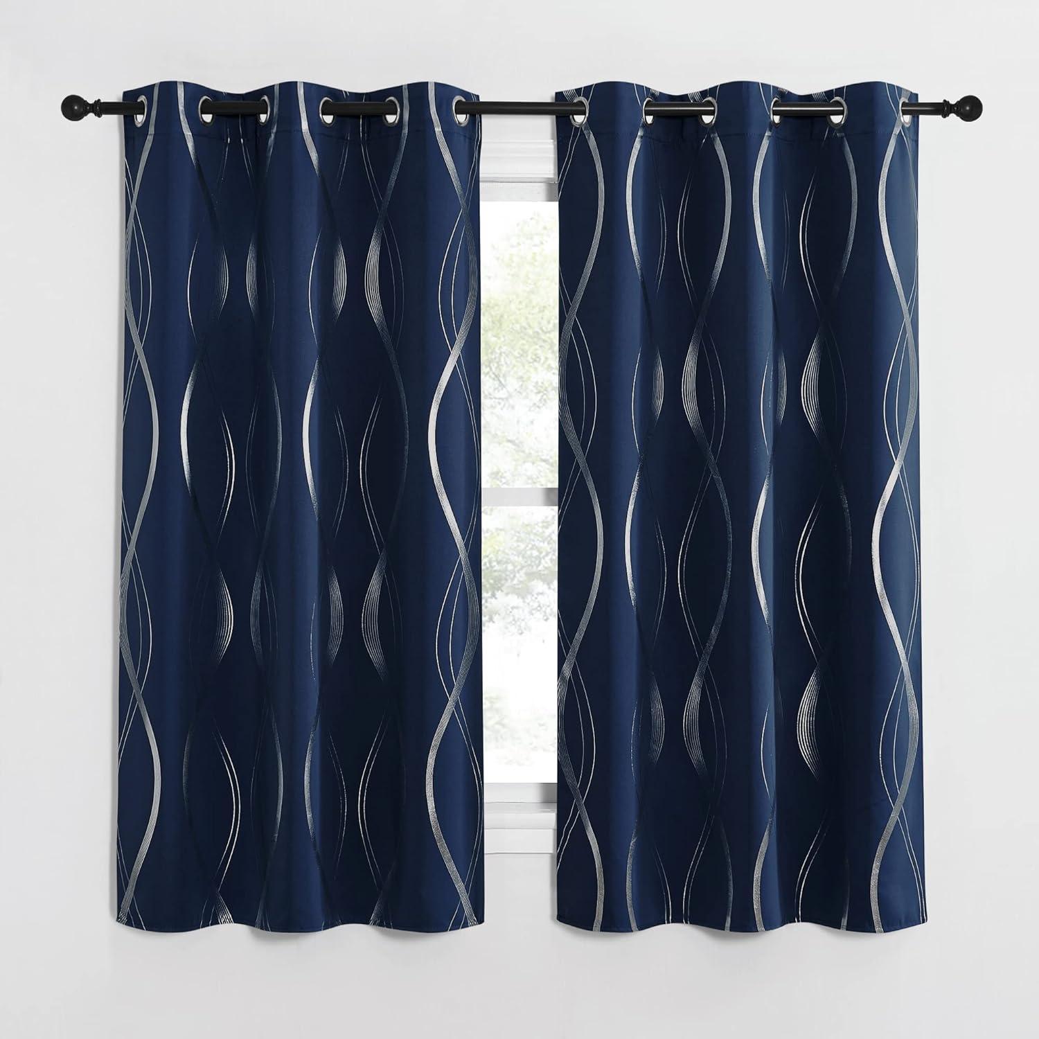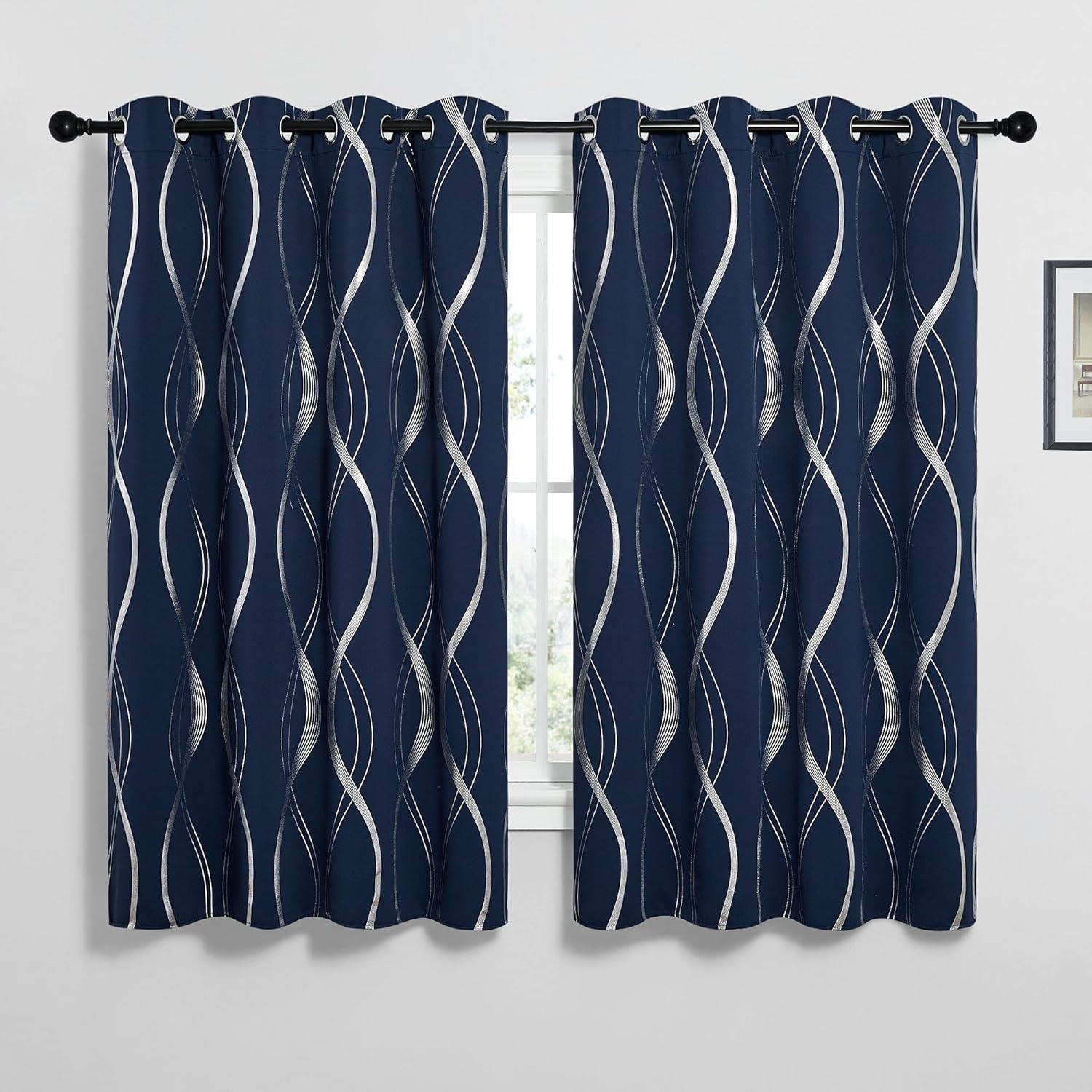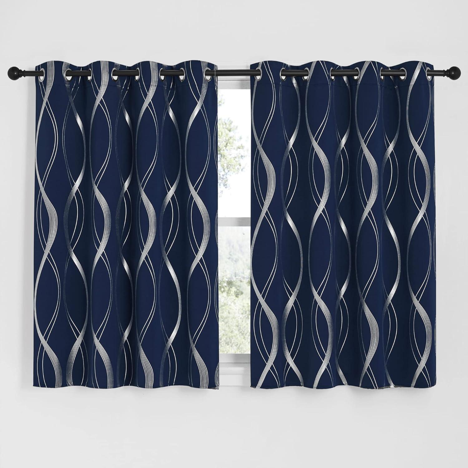 NICETOWN Blackout Short Curtains Panels for Bedroom, Microfiber Noise Reducing Thermal Insulated Wave Line Foil Print Design Drapes for Office, Classroom (Stone Blue, 2 Panels, 52 x 54 Inch)(1 – Navy)