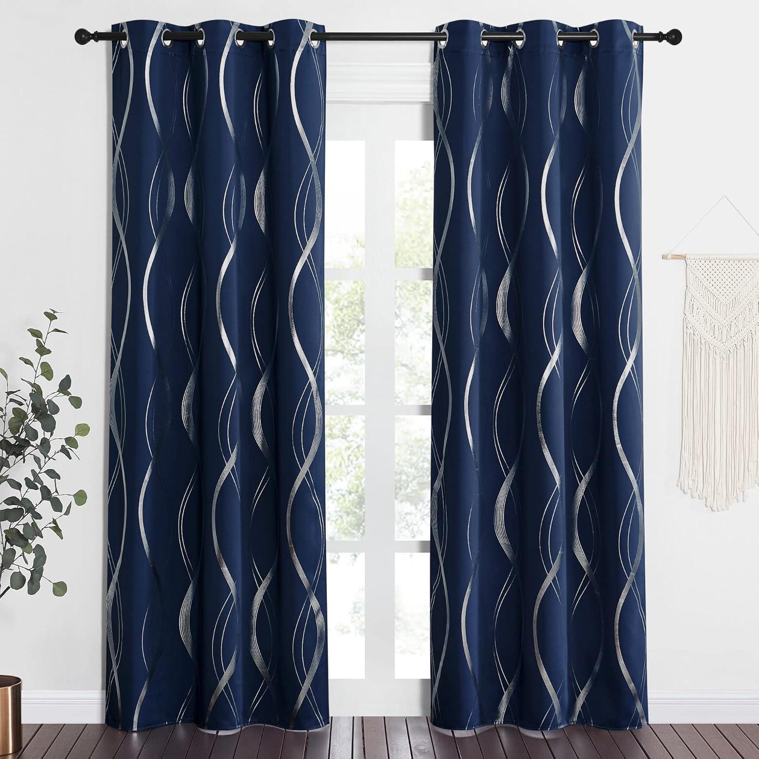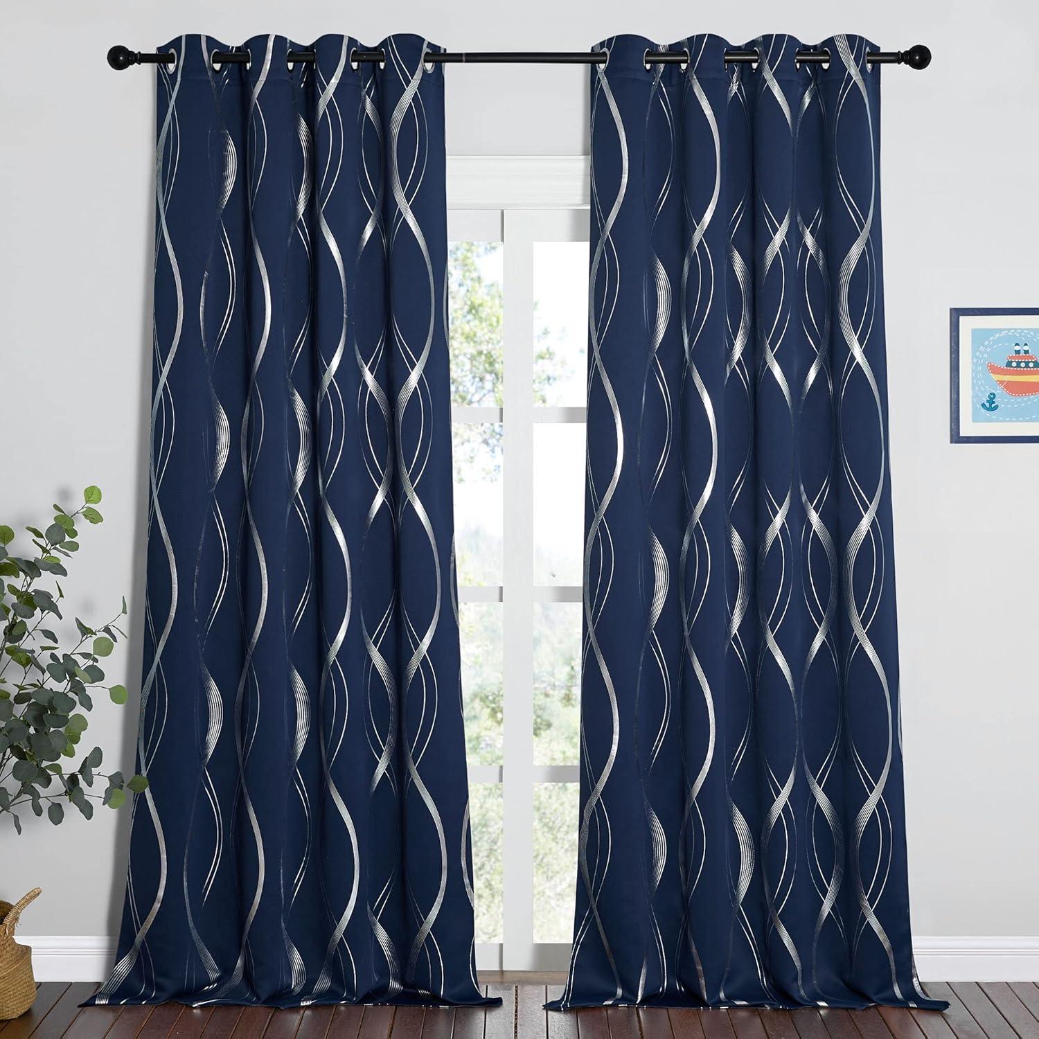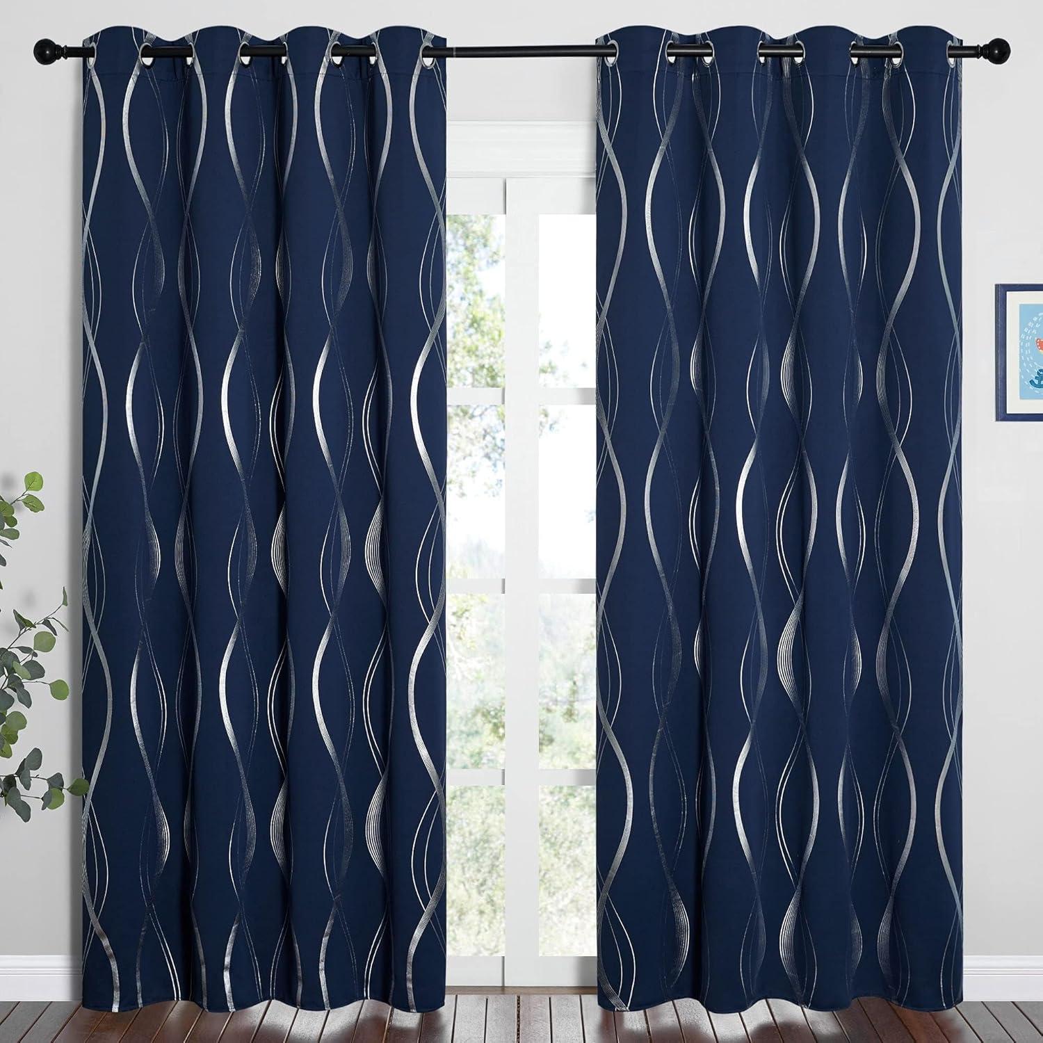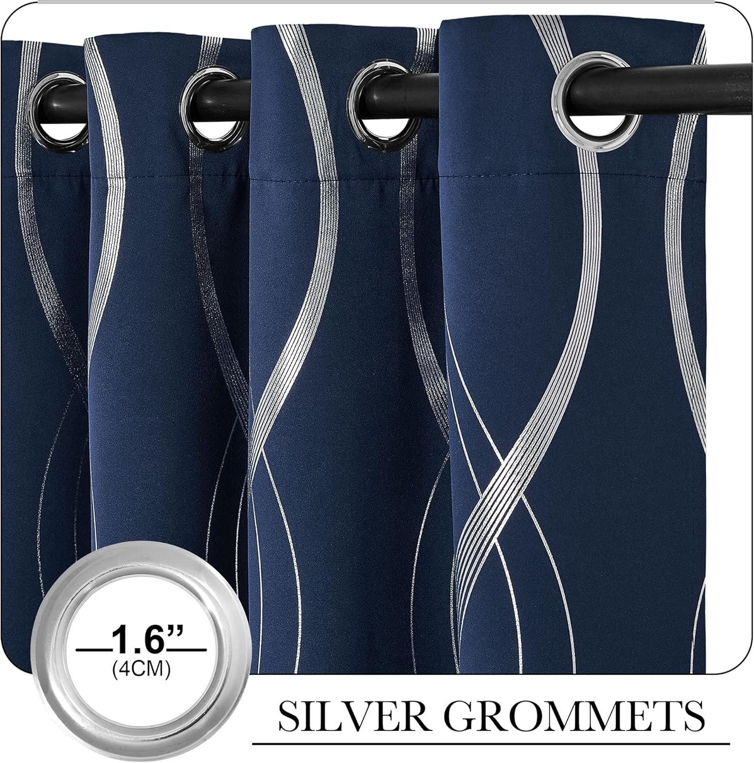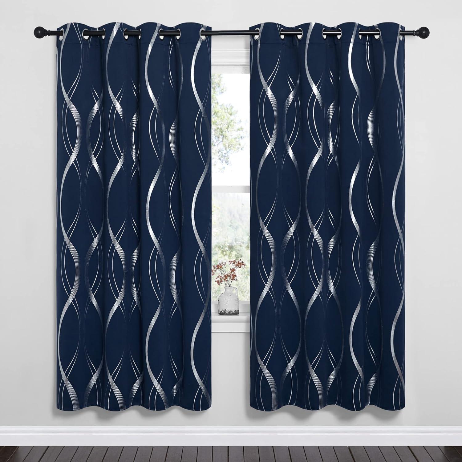NICETOWN Blackout Short Curtains Panels for Bedroom, Microfiber Noise Reducing Thermal Insulated Wave Line Foil Print Design Drapes for Office, Classroom (Stone Blue, 2 Panels, 52 x 54 Inch)(1 – Navy)