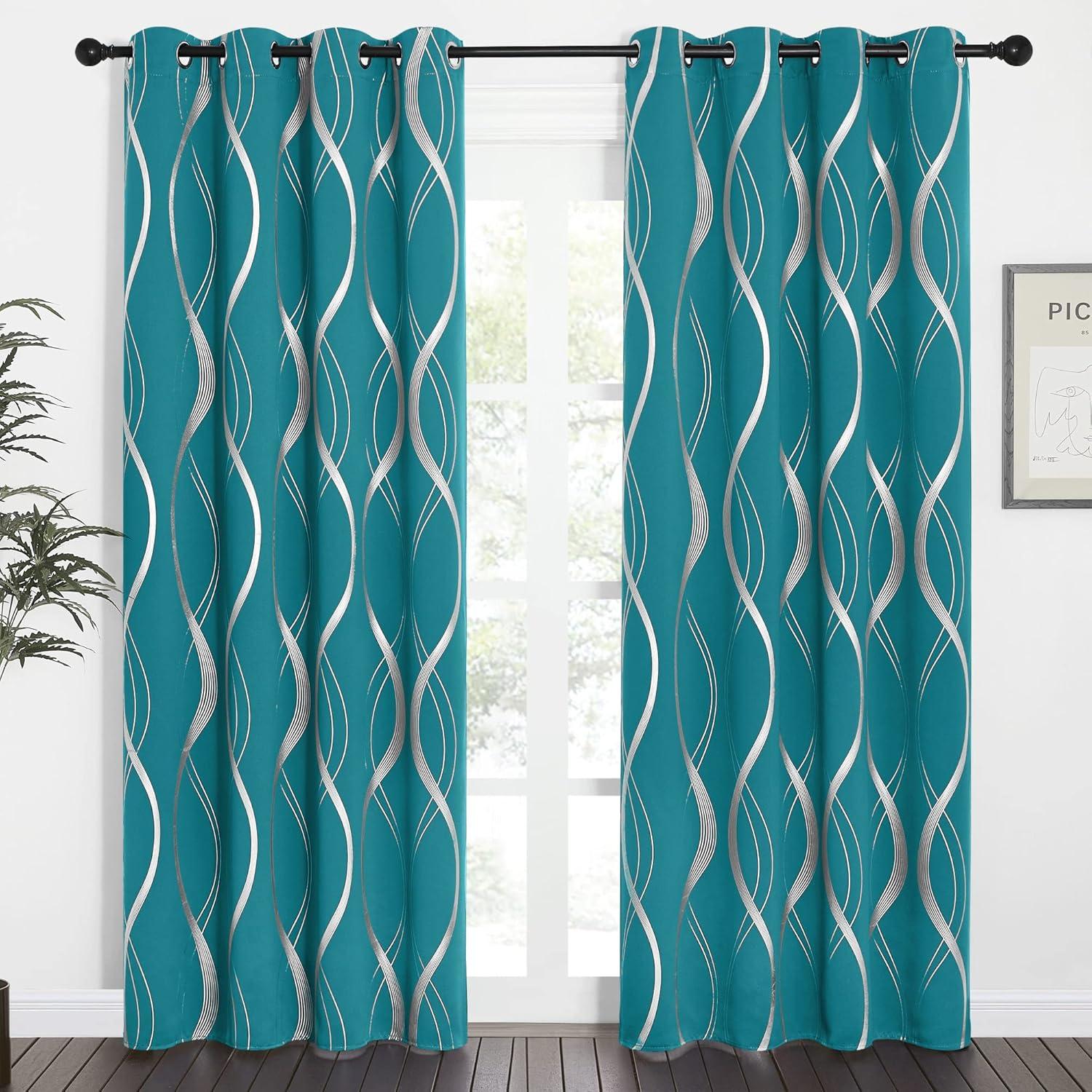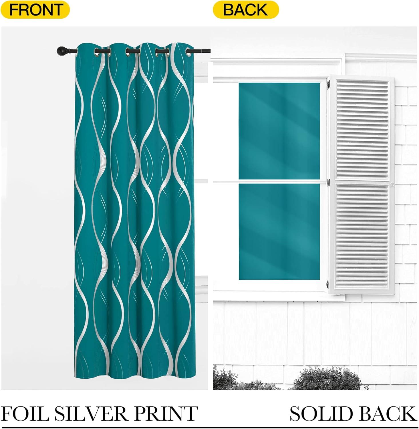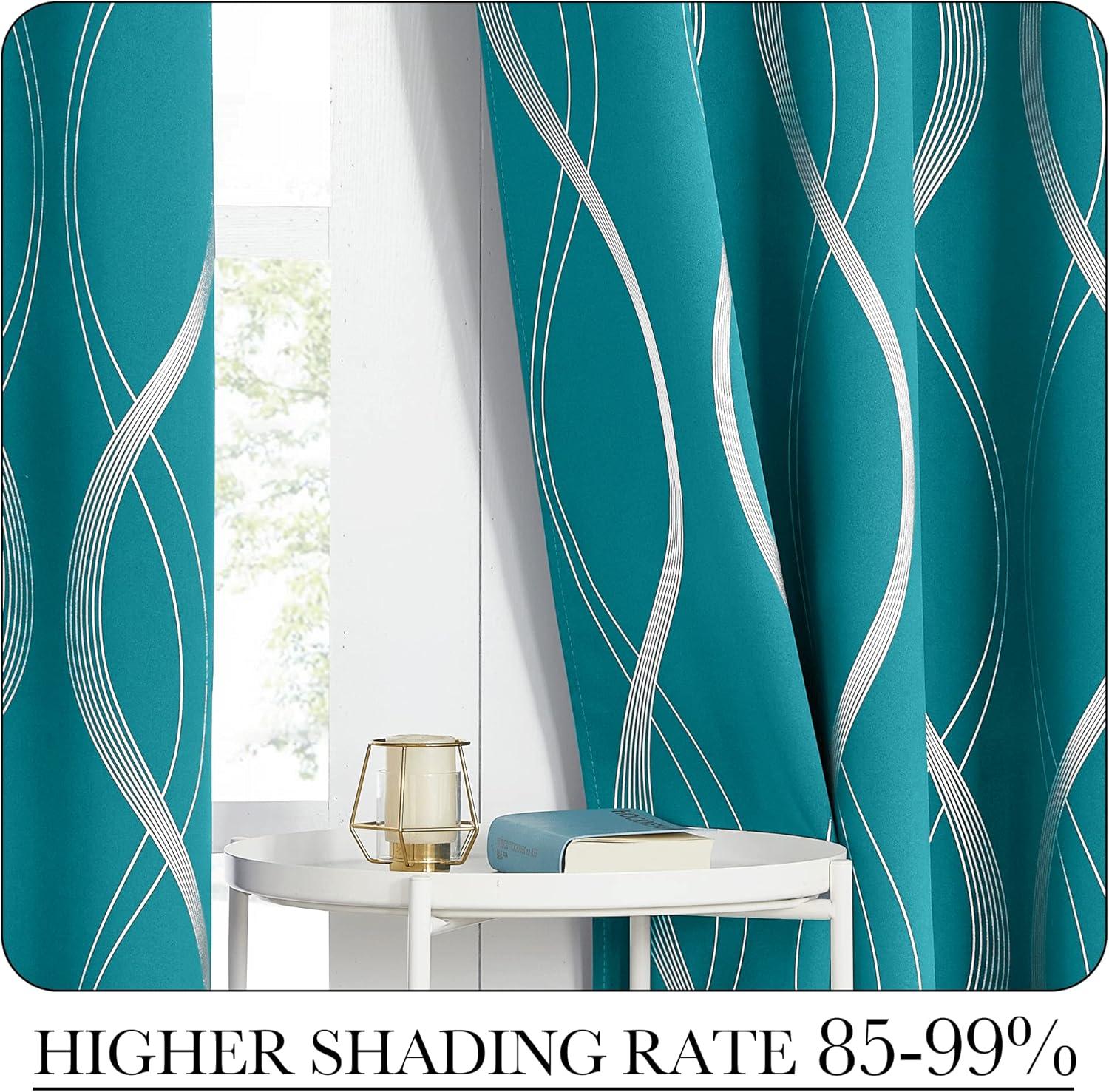 NICETOWN Blackout Short Curtains Panels for Bedroom, Microfiber Noise Reducing Thermal Insulated Wave Line Foil Print Design Drapes for Office, Classroom (Stone Blue, 2 Panels, 52 x 54 Inch)(1 - Peacock Teal)