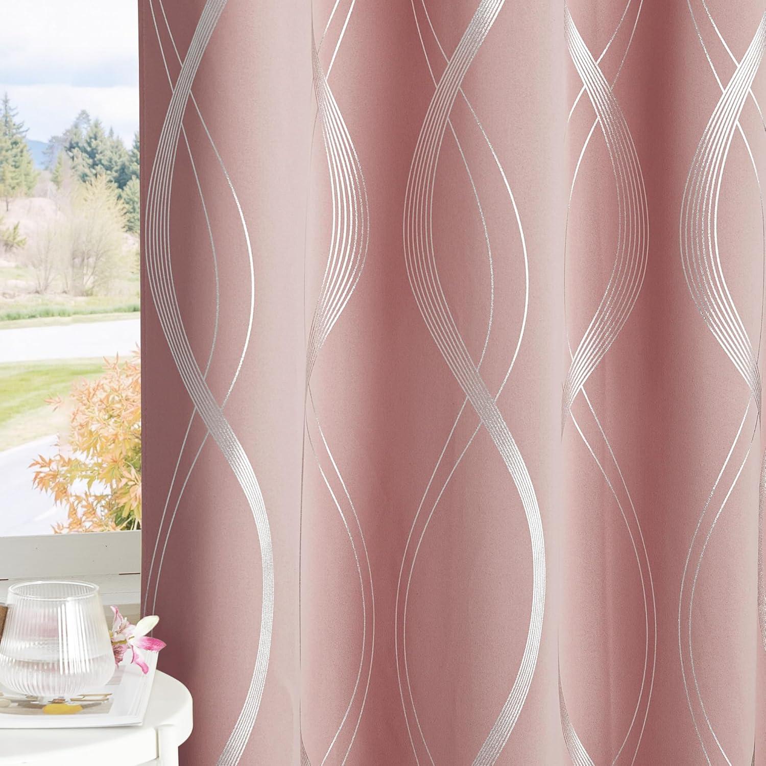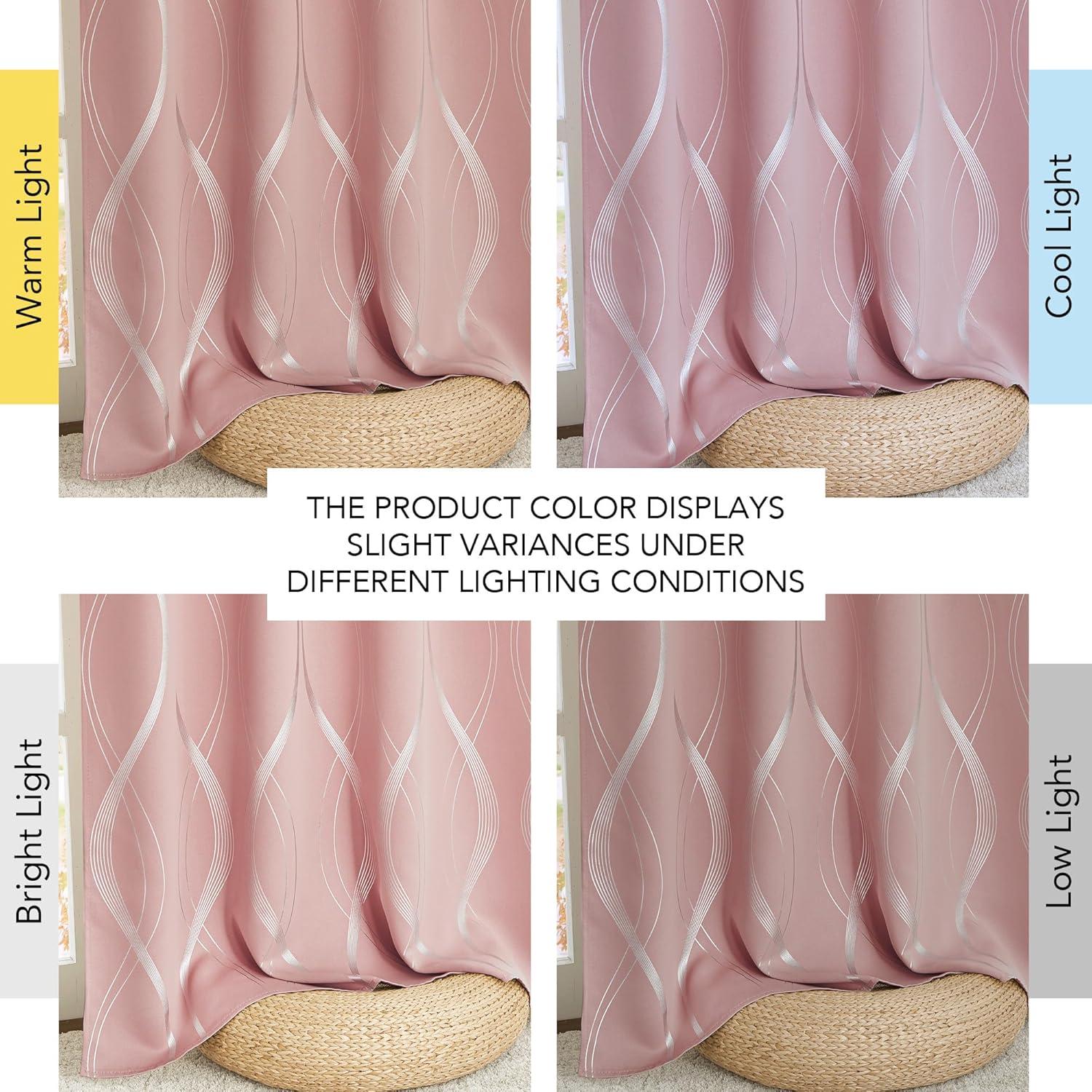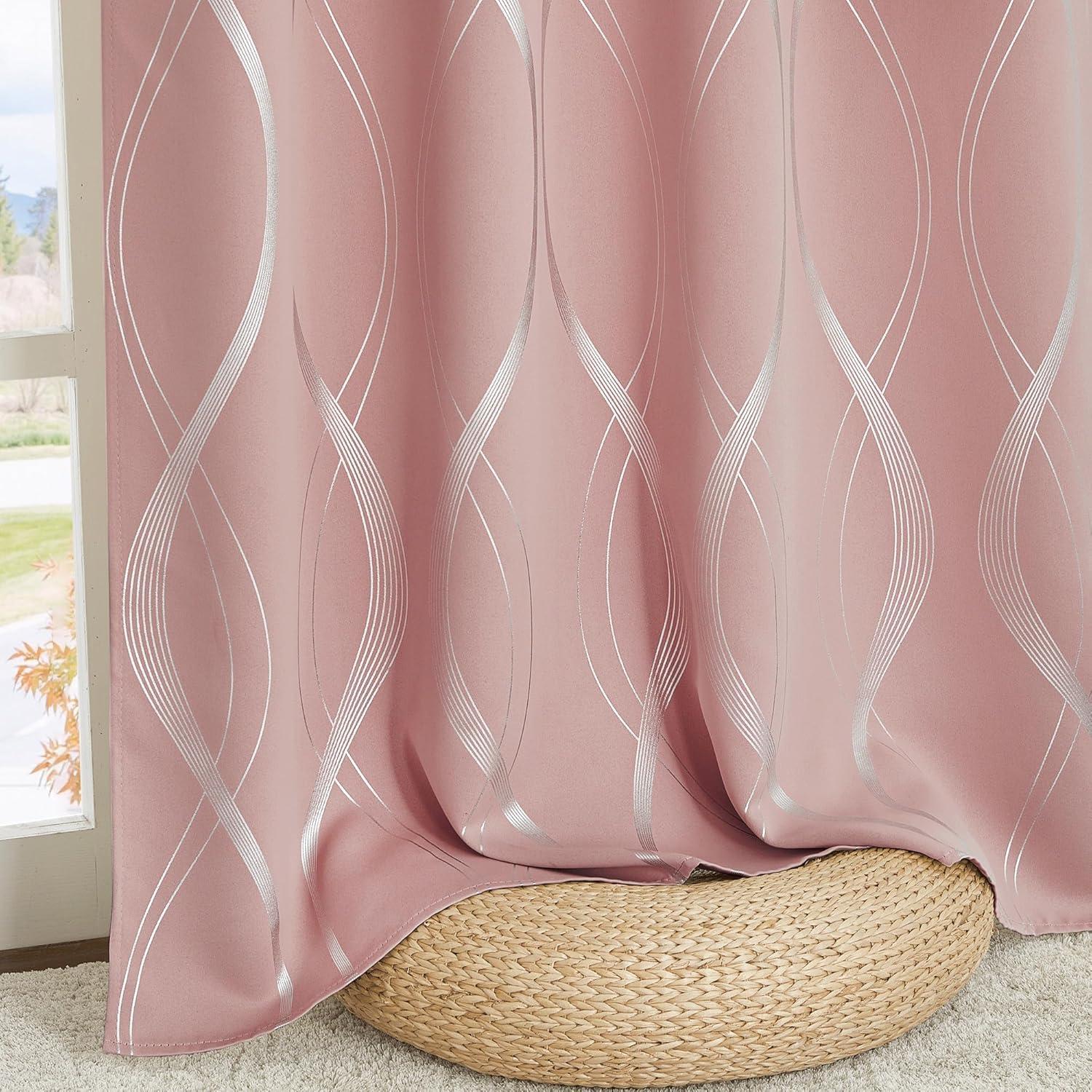 imageNICETOWN Blackout Short Curtains Panels for Bedroom Microfiber Noise Reducing Thermal Insulated Wave Line Foil Print Design Drapes for Office Classroom Stone Blue 2 Panels 52 x 54 Inch100 Blackout  Pink