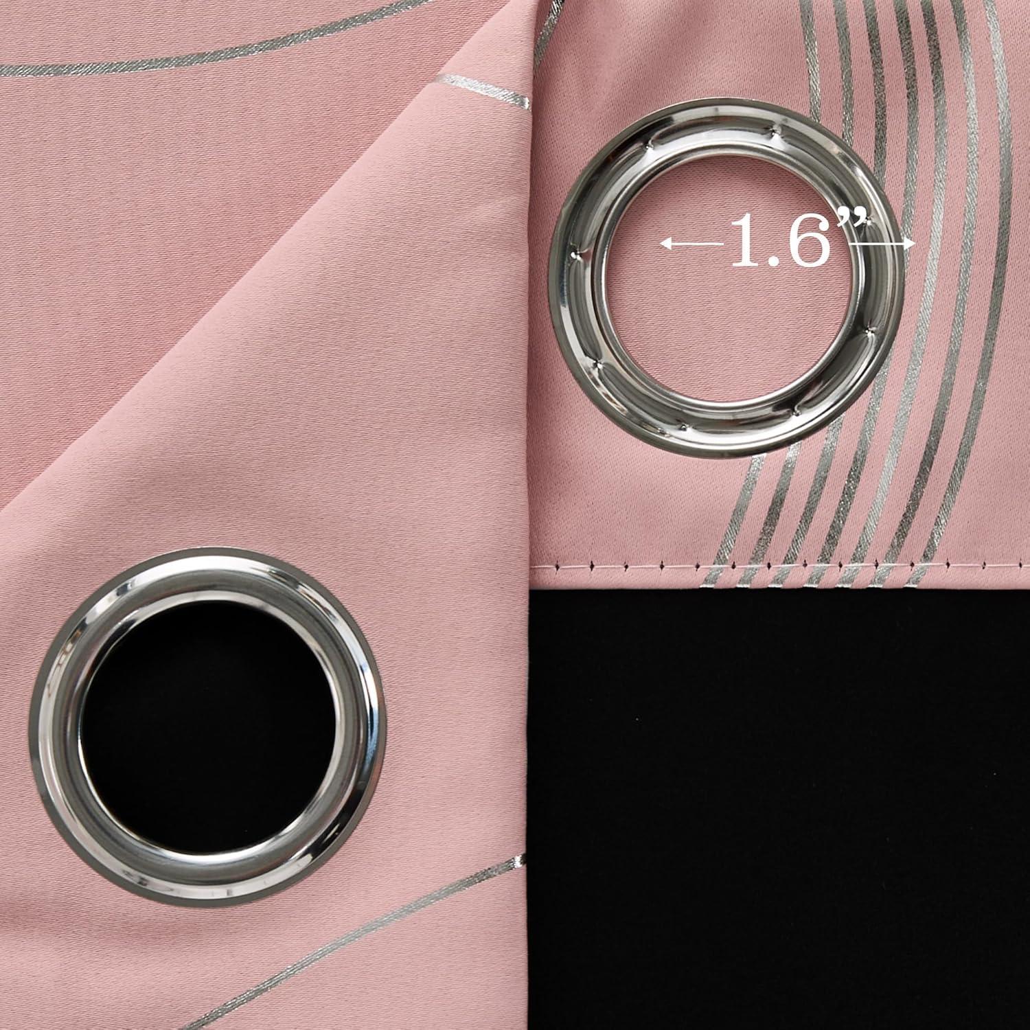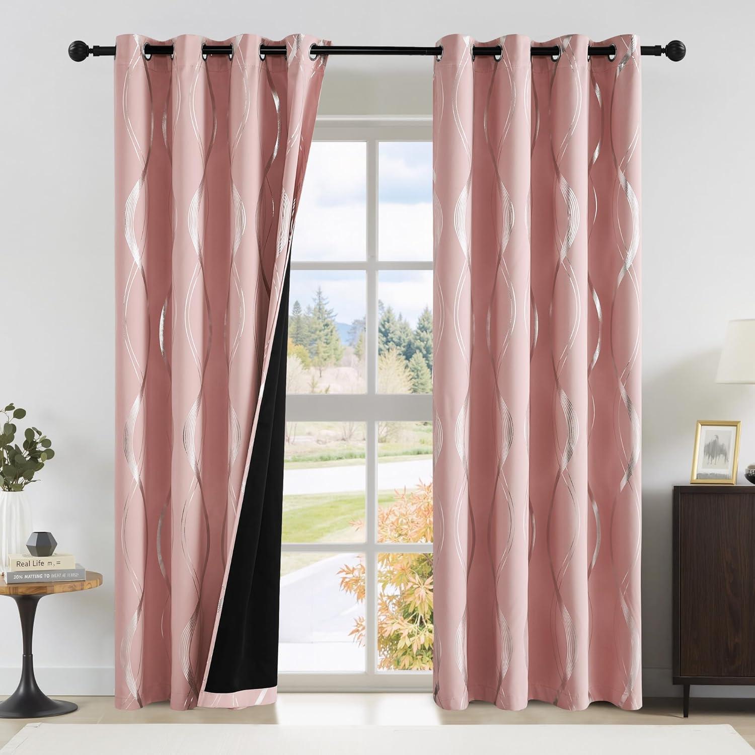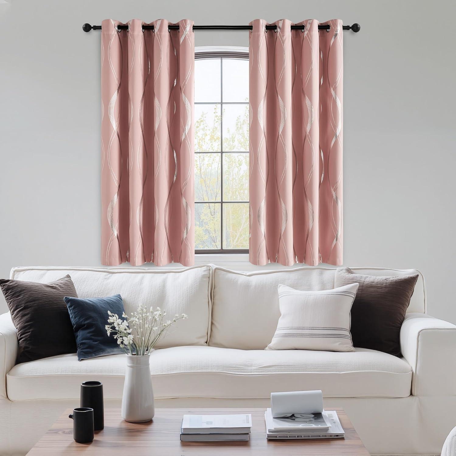 imageNICETOWN Blackout Short Curtains Panels for Bedroom Microfiber Noise Reducing Thermal Insulated Wave Line Foil Print Design Drapes for Office Classroom Stone Blue 2 Panels 52 x 54 Inch100 Blackout  Pink