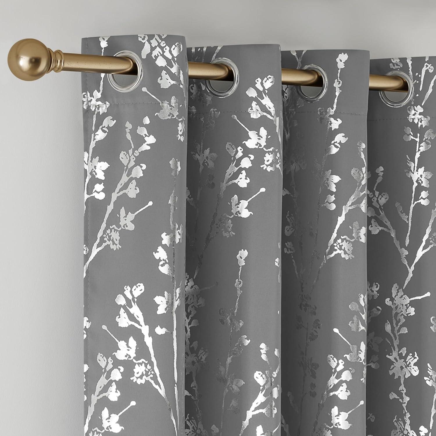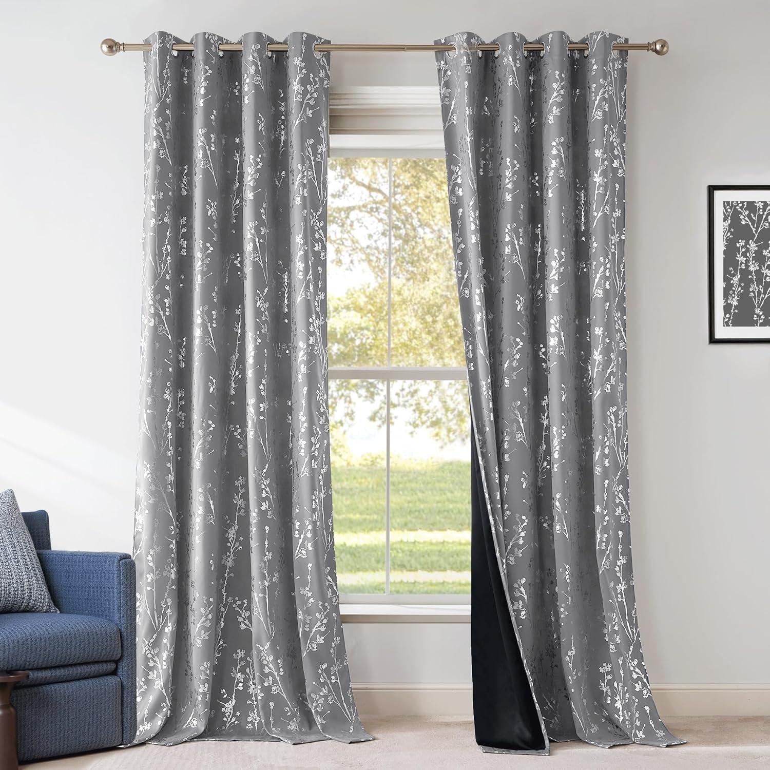 NICETOWN Blackout Short Curtains Panels for Bedroom, Microfiber Noise Reducing Thermal Insulated Wave Line Foil Print Design Drapes for Office, Classroom (Stone Blue, 2 Panels, 52 x 54 Inch)(Branch-100% Blackout Silver Grey)