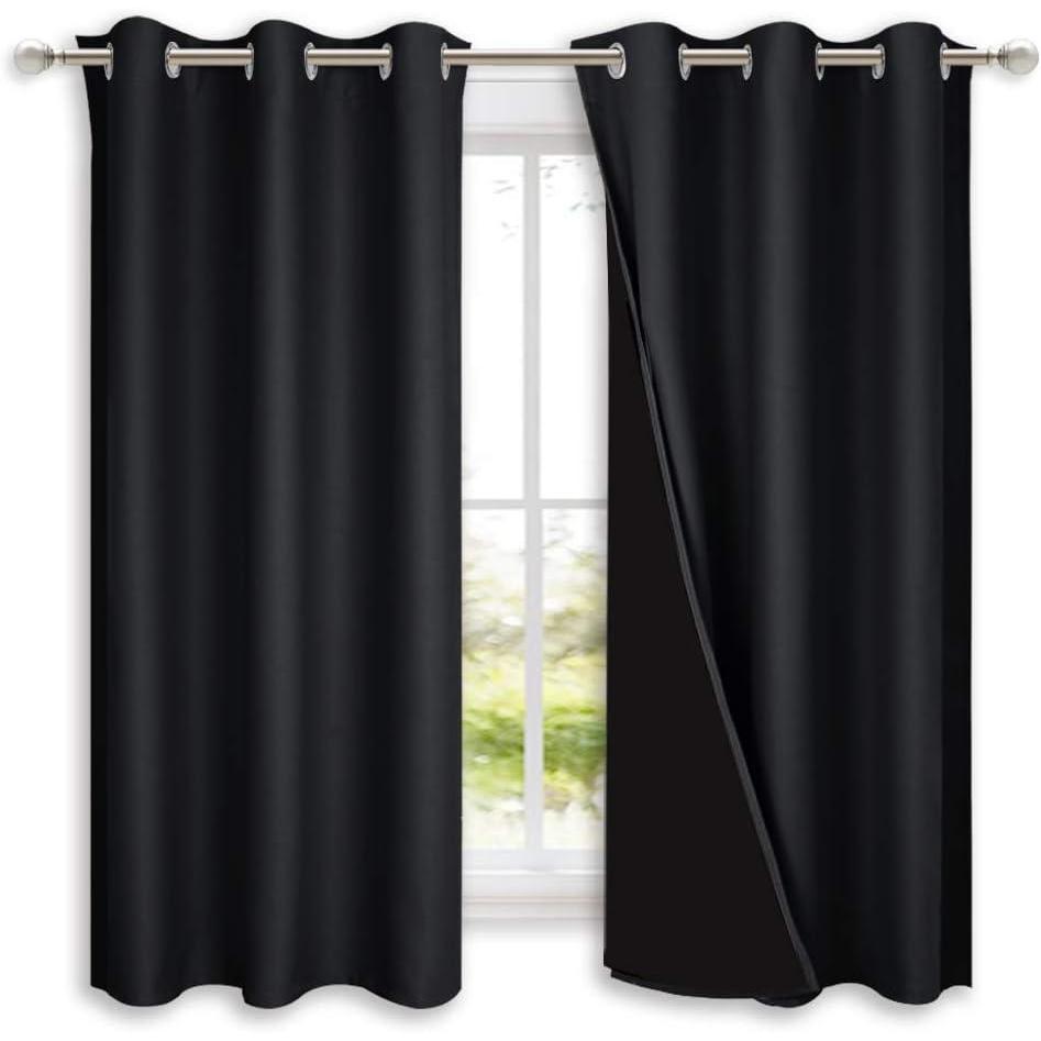 NICETOWN Complete 100% Blackout Curtain Set, Thermal Insulated & Energy Efficiency Window Draperies with Black Liner, Noise Reducing Short Curtains for Kids Room (Black, 42"W by 63"L, Double Panels)