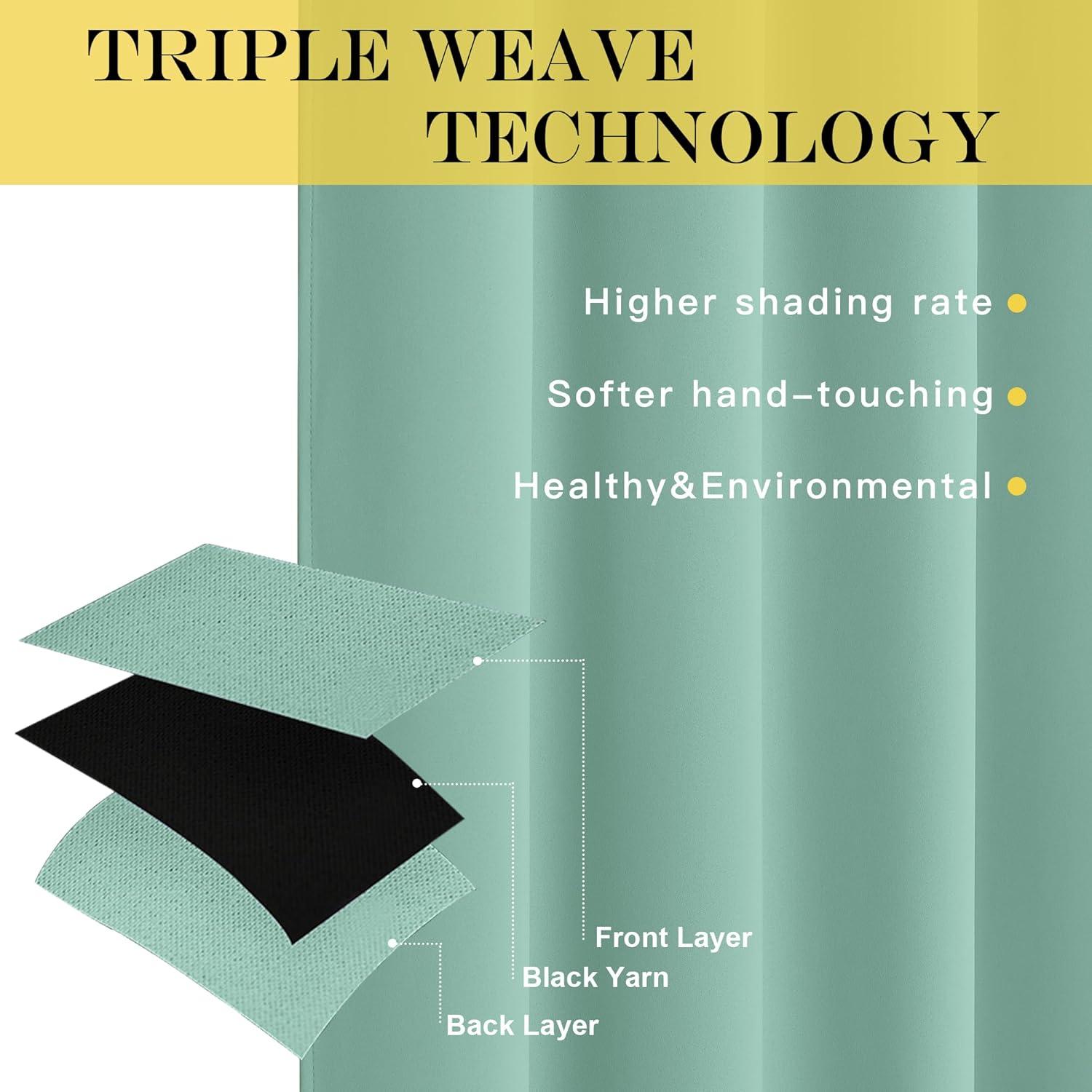 AMAZING FABRIC: The blackout curtain's fabric is a super soft and heavily innovative triple-weave polyester fabric. The Same material back as of front makes it appear more elegant. The 8 sliver grommets top (inner diameter is 1.6-inch) adds a modern touch and easy hanging.