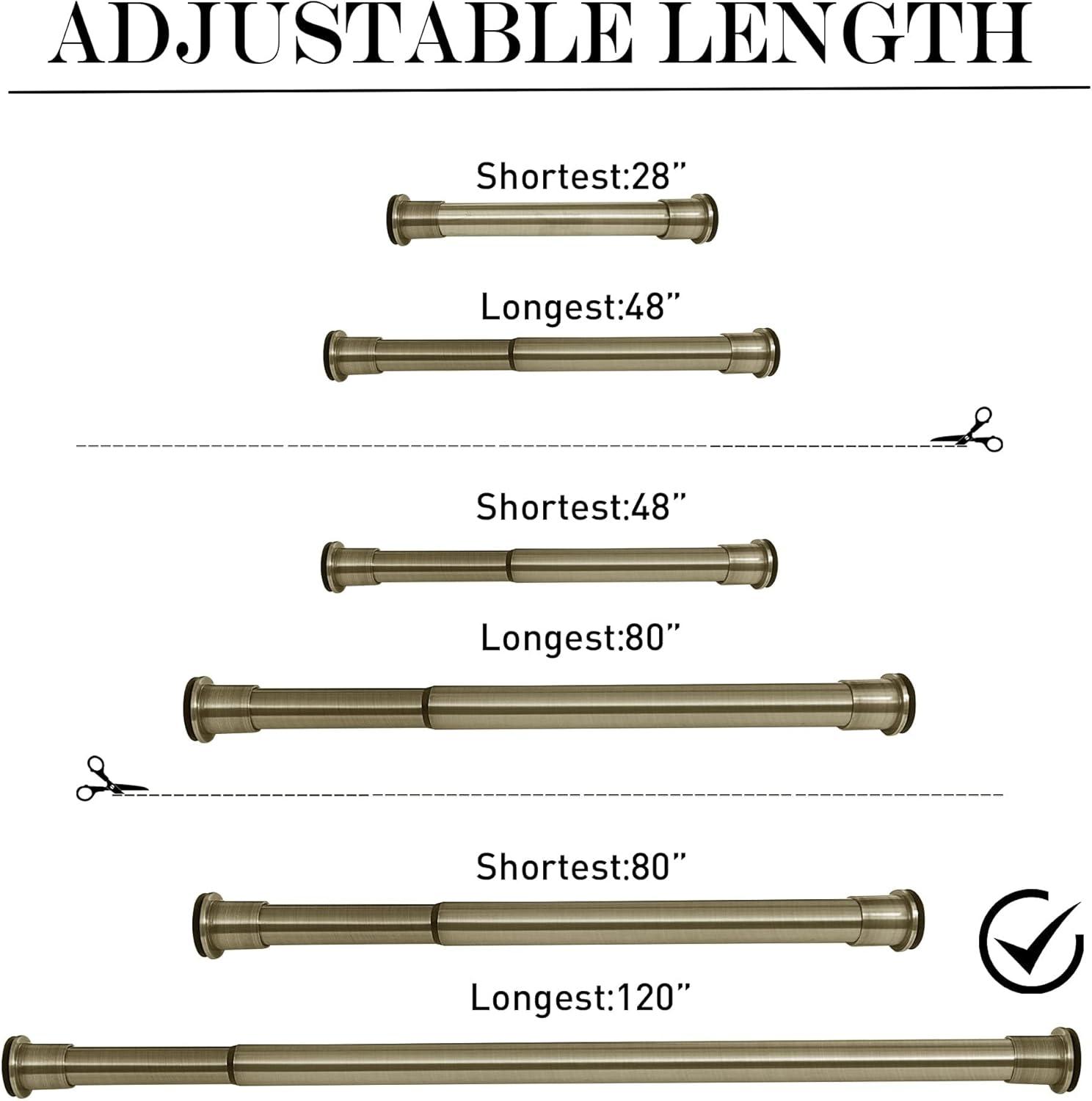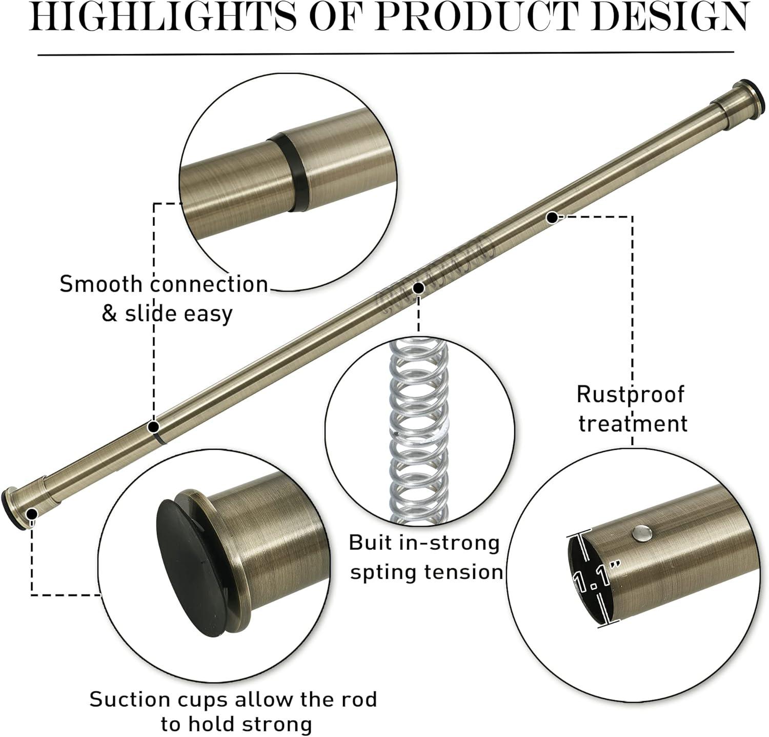ROD DETAIL: Heavy duty spring strong tension curtain rod contains stainless steel strong rough spring, 2 strong suction cup, a strong stretch to extend enough to support max load 30 lbs. Length can adjust from 28 to 48 inches