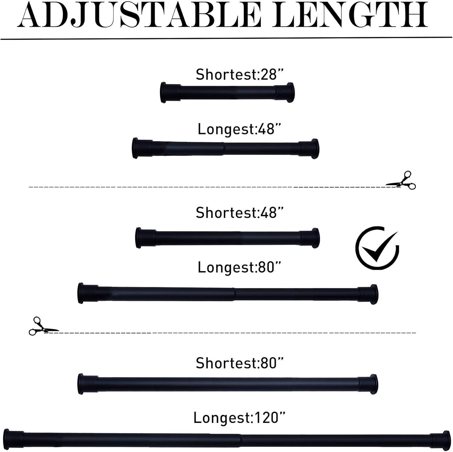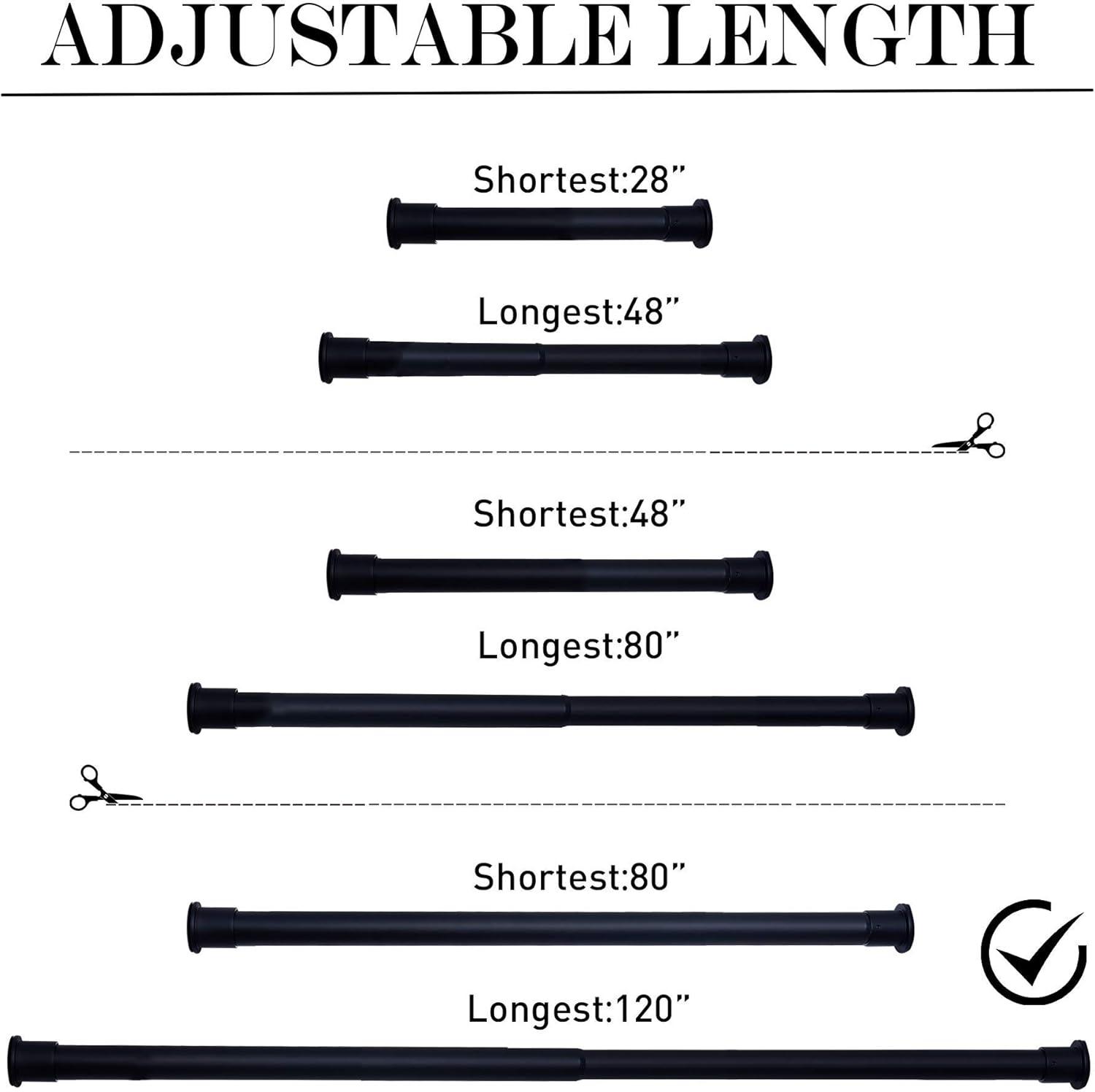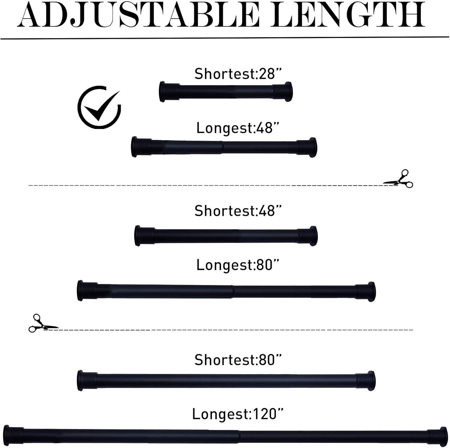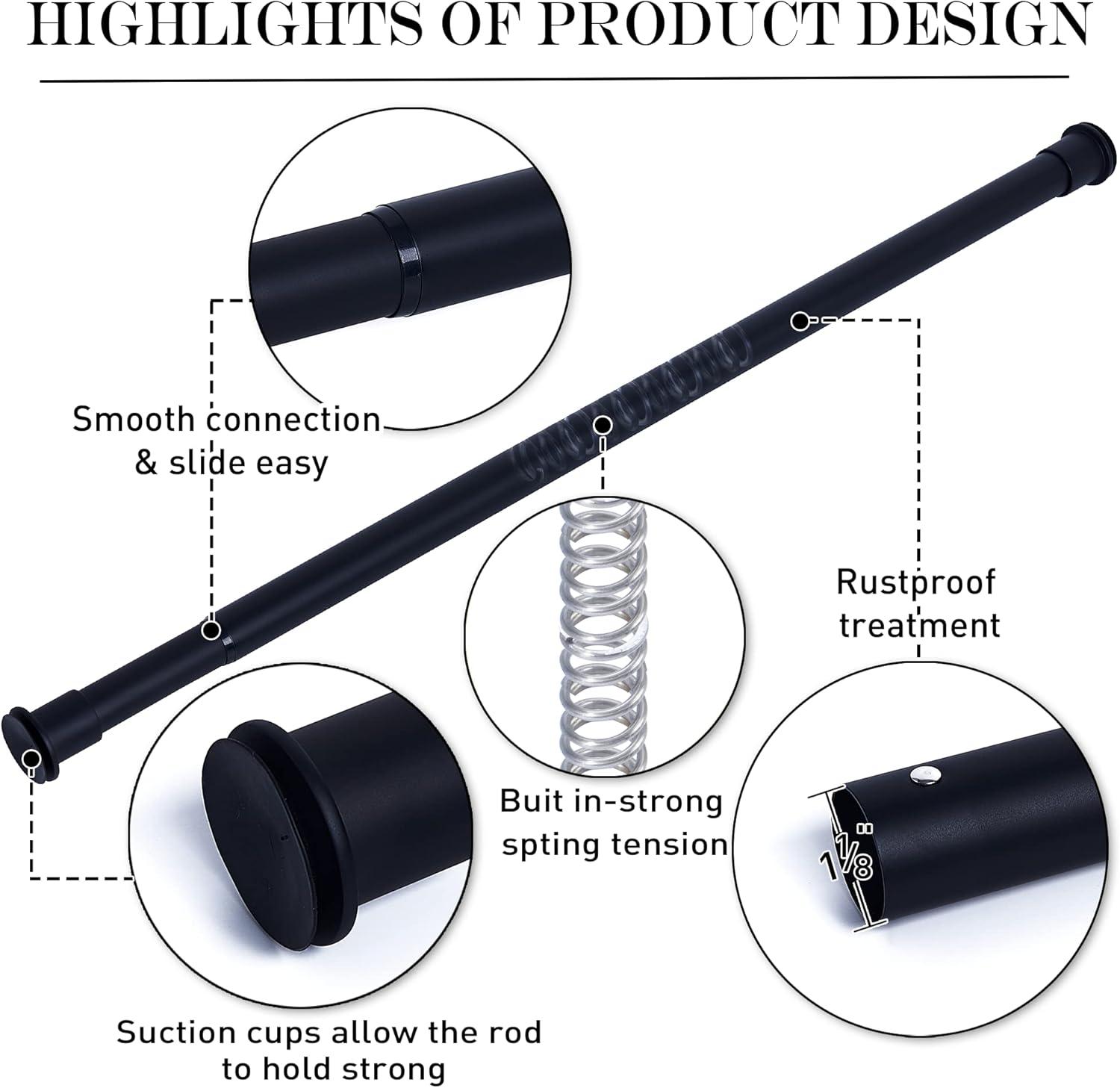 ROD DETAIL: Heavy duty spring strong tension curtain rod contains stainless steel strong rough spring, 2 strong suction cup, a strong stretch to extend enough to support max load 30 lbs. Length can adjust from 28 to 48 inches