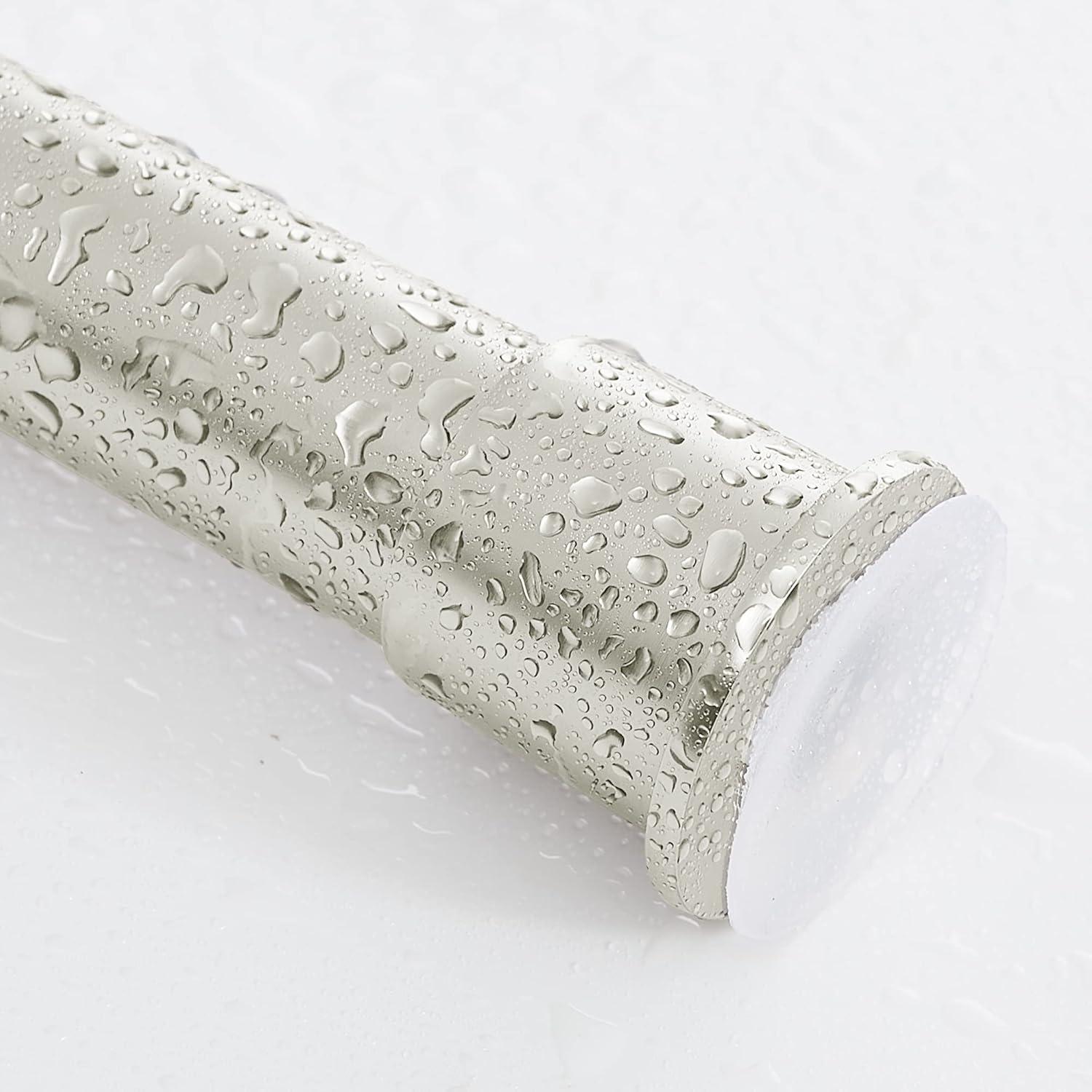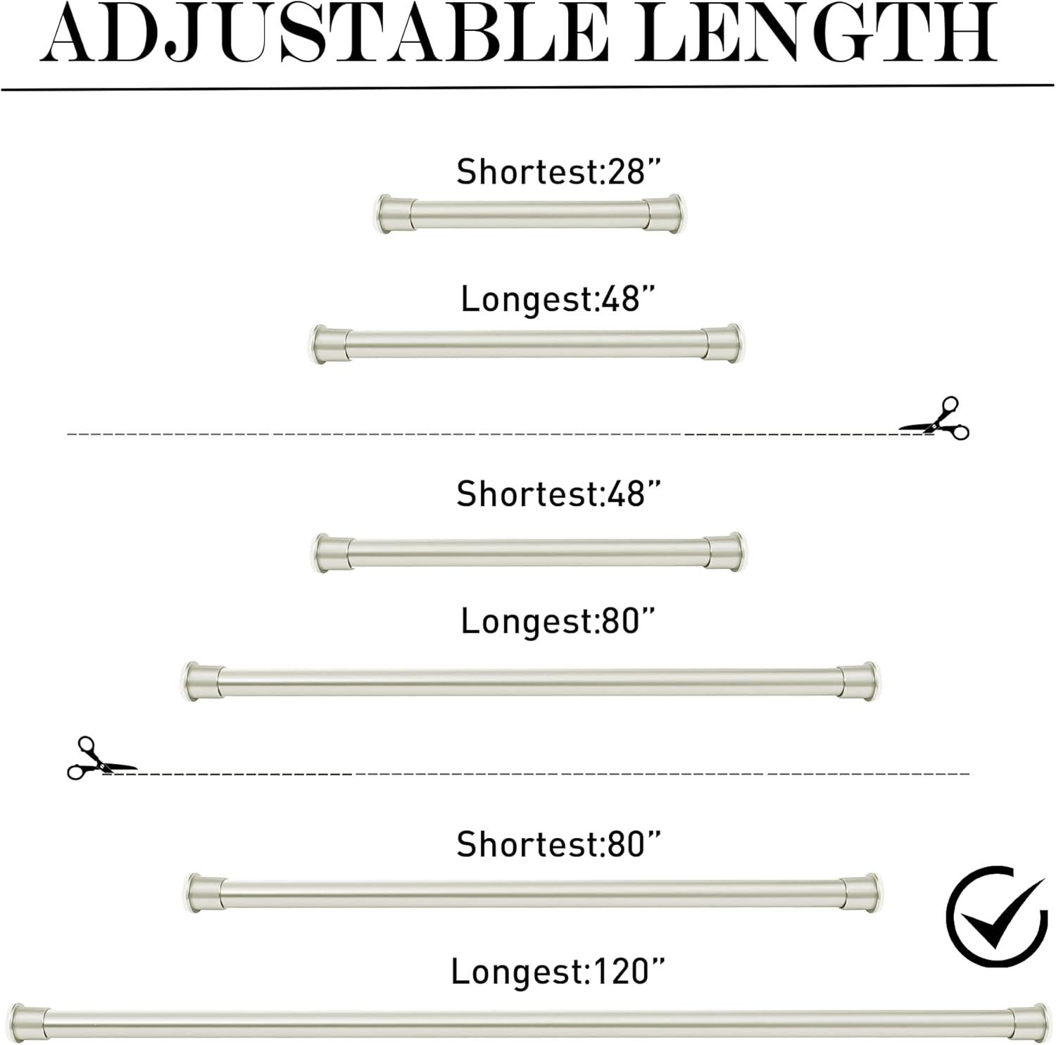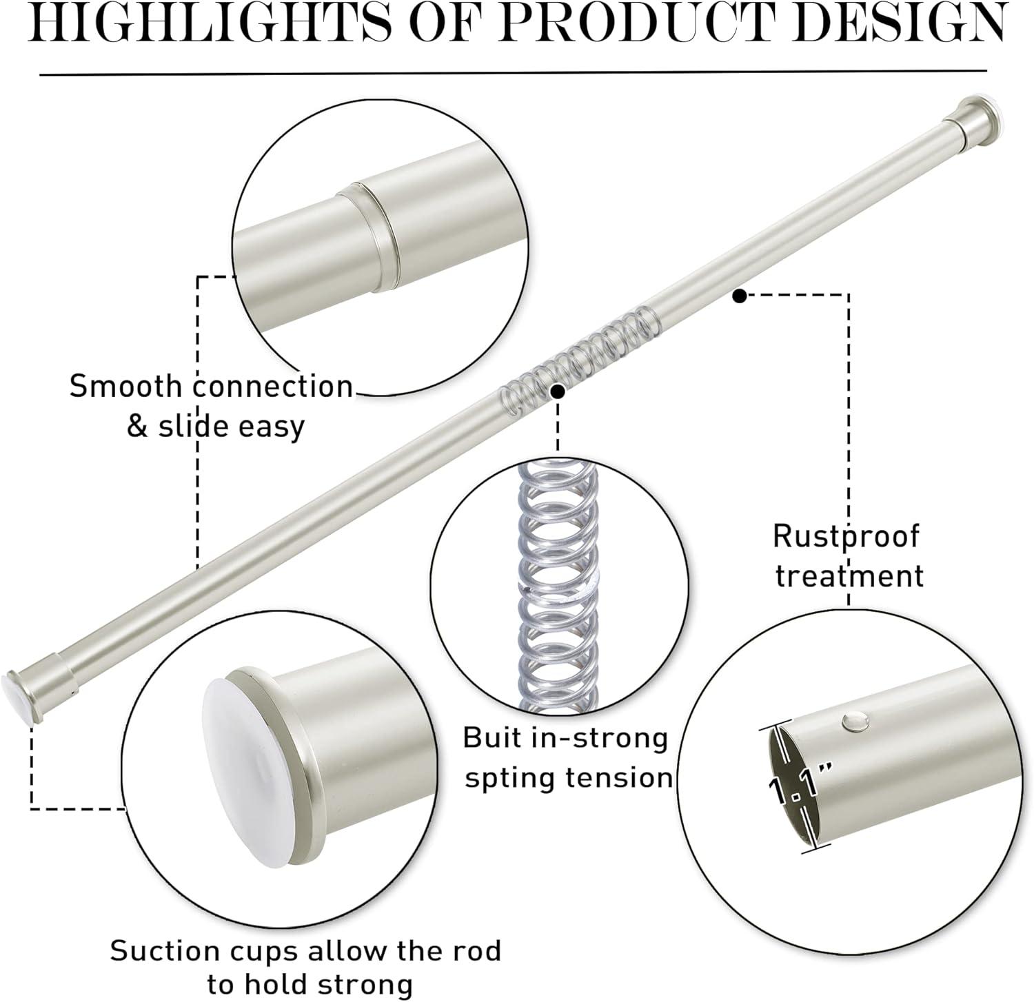 ROD DETAIL: Heavy duty spring strong tension curtain rod contains stainless steel strong rough spring, 2 strong suction cup, a strong stretch to extend enough to support max load 30 lbs. Length can adjust from 28 to 48 inches