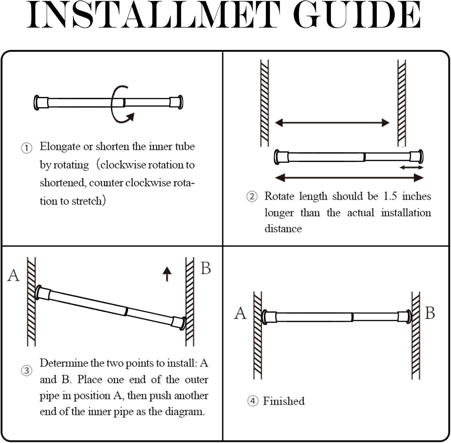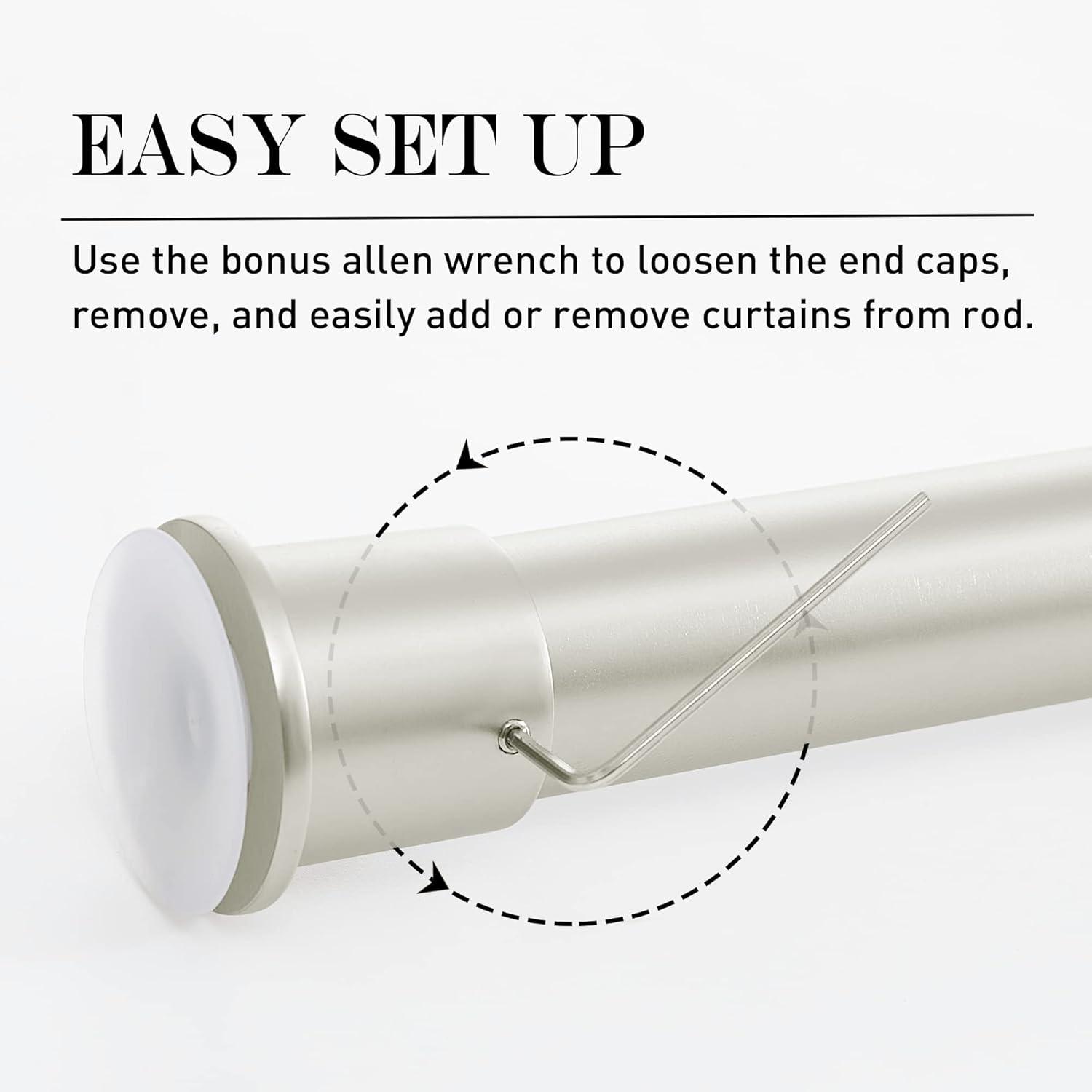 EASY INSTALLATION: Adjustable width design for easily hanging curtains. Unlike normal rod, this tension curtain rod Don't Need Any Tools To Install. Just unscrew them until they are about 1.5″-2″ longer than the area you're putting them in, then squeeze them into place.
