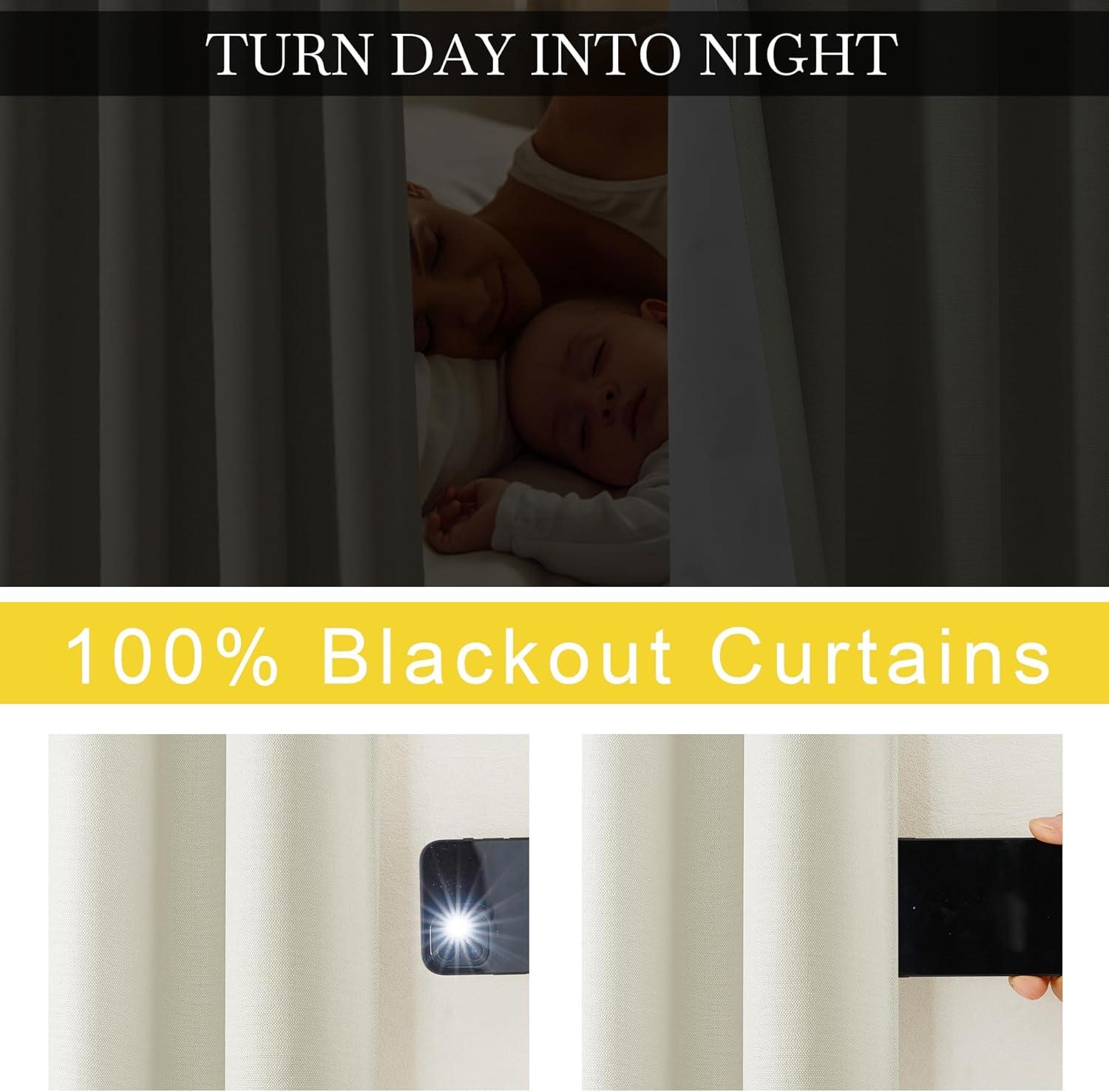 100% Blackout: The faux linen real blackout curtains sewn in white liner backing to keep out the sunlight and UV rays completely. Also offers you a really dark environment, bringing you a good night's sleep during the day.