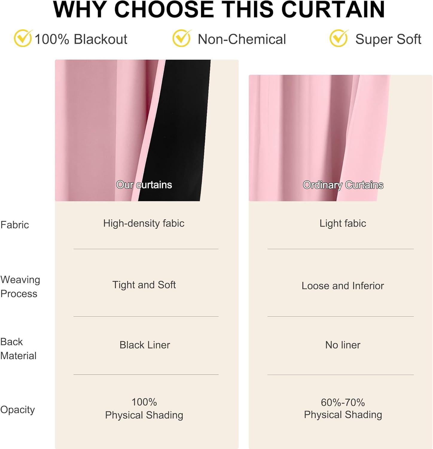 100% Blackout: Sew in black liner backing makes the drapes thick enough to completely keep out the 100% SUNLIGHT and UV RAY. The greatest benefit is to offer you a real dark environment, bringing you a good night's sleep during the day.