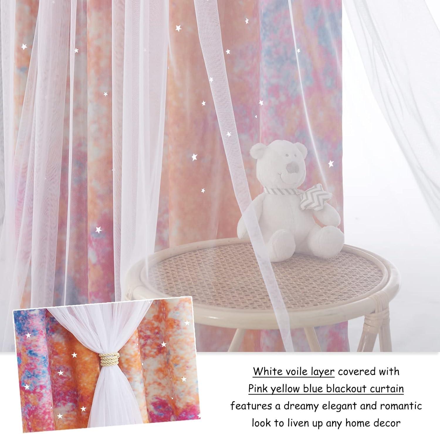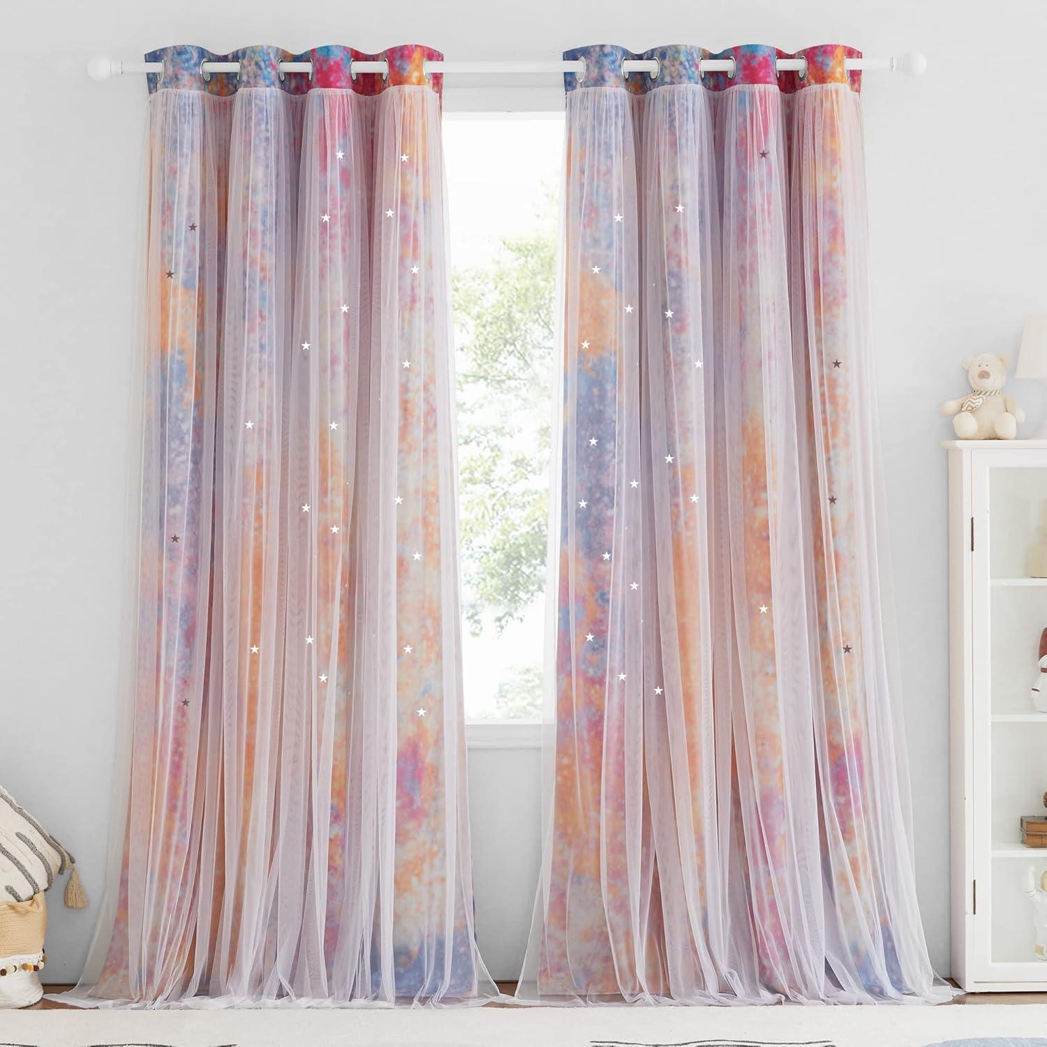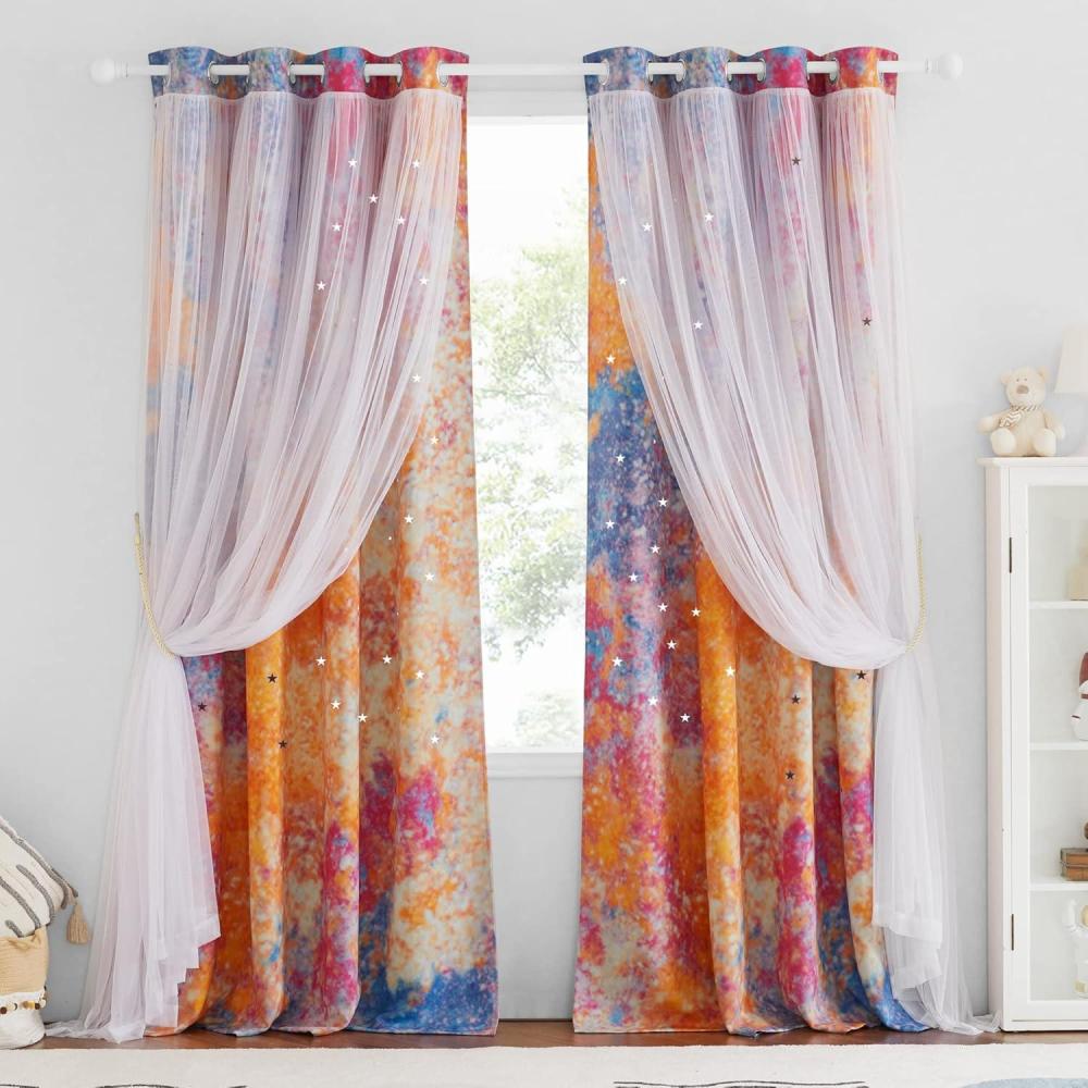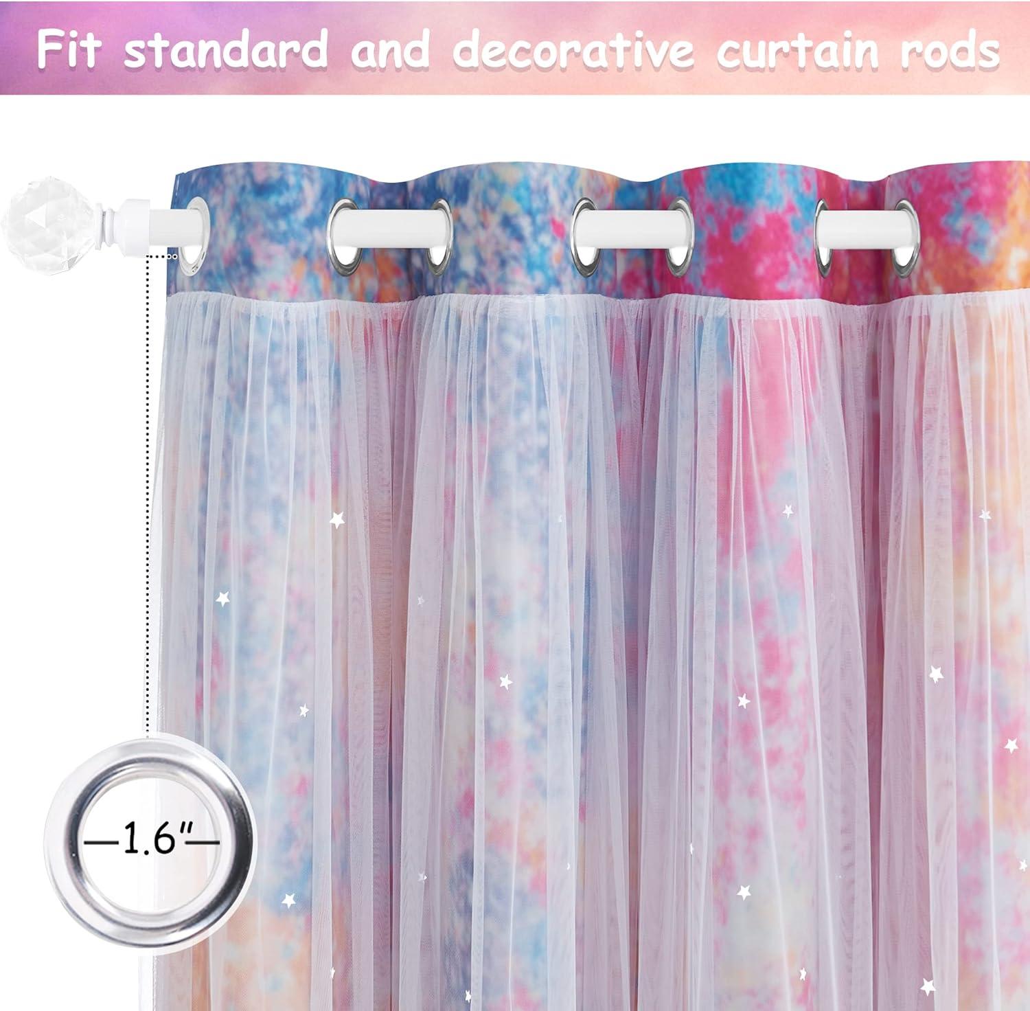 DETAIL INFO: 1 curtain = 1 layer of tulle attached 1 layer of baby girl nursery decor curtain. The package comes with 2 curtains and 4 tiebacks. Each gradient star curtain is 52″ wide. 1.6″ diameter Grommets make the curtains easy to install and slide.