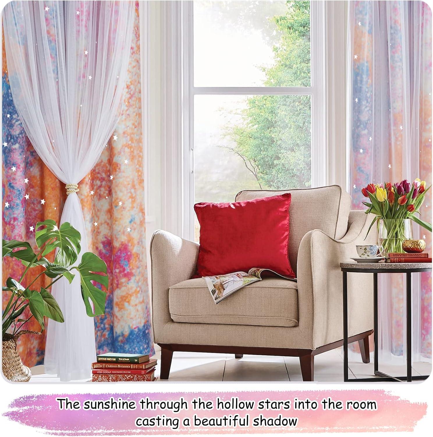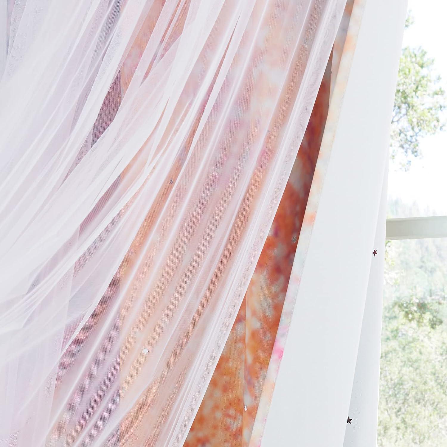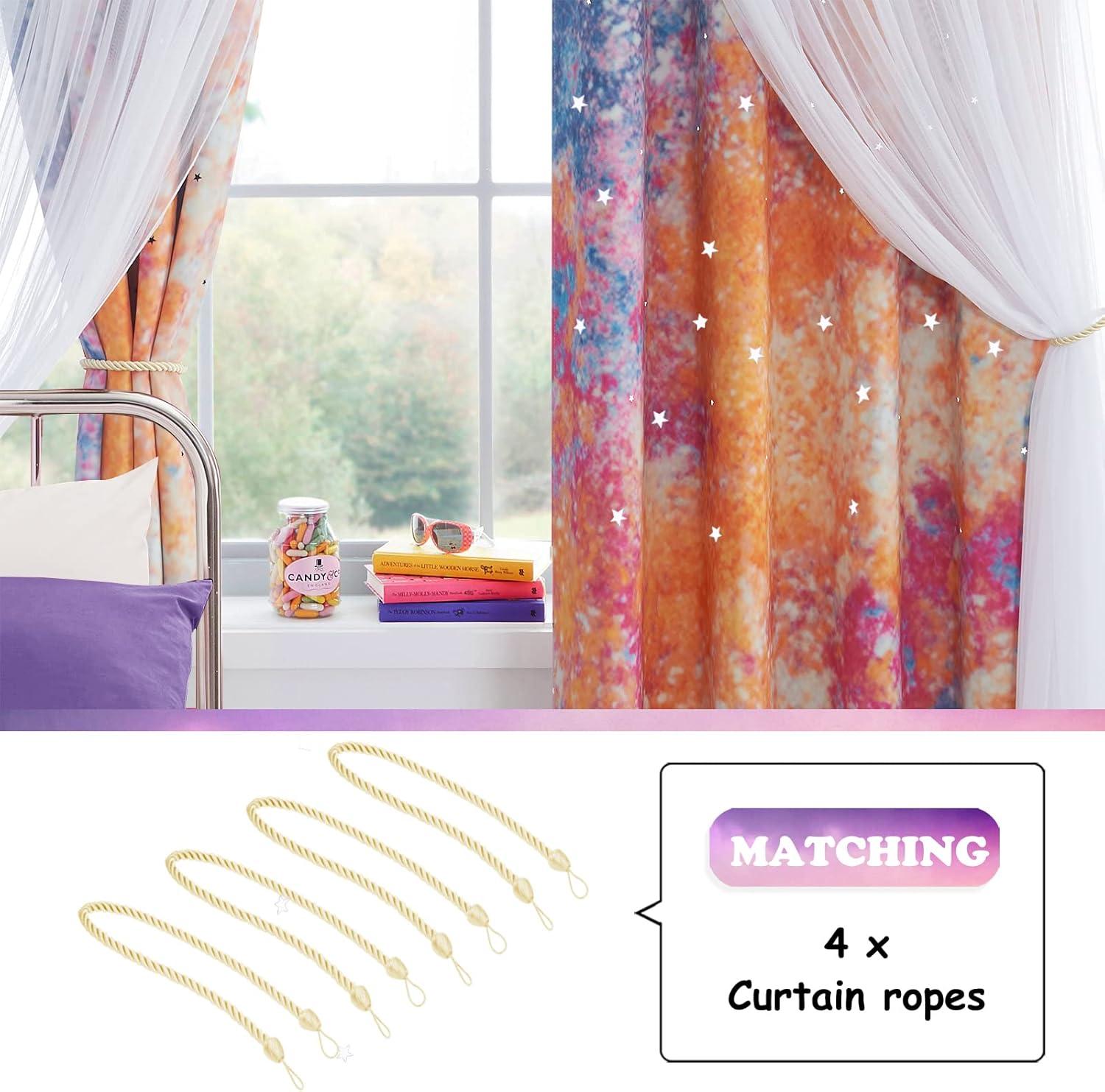 DETAIL INFO: 1 curtain = 1 layer of tulle attached 1 layer of baby girl nursery decor curtain. The package comes with 2 curtains and 4 tiebacks. Each gradient star curtain is 52″ wide. 1.6″ diameter Grommets make the curtains easy to install and slide.
