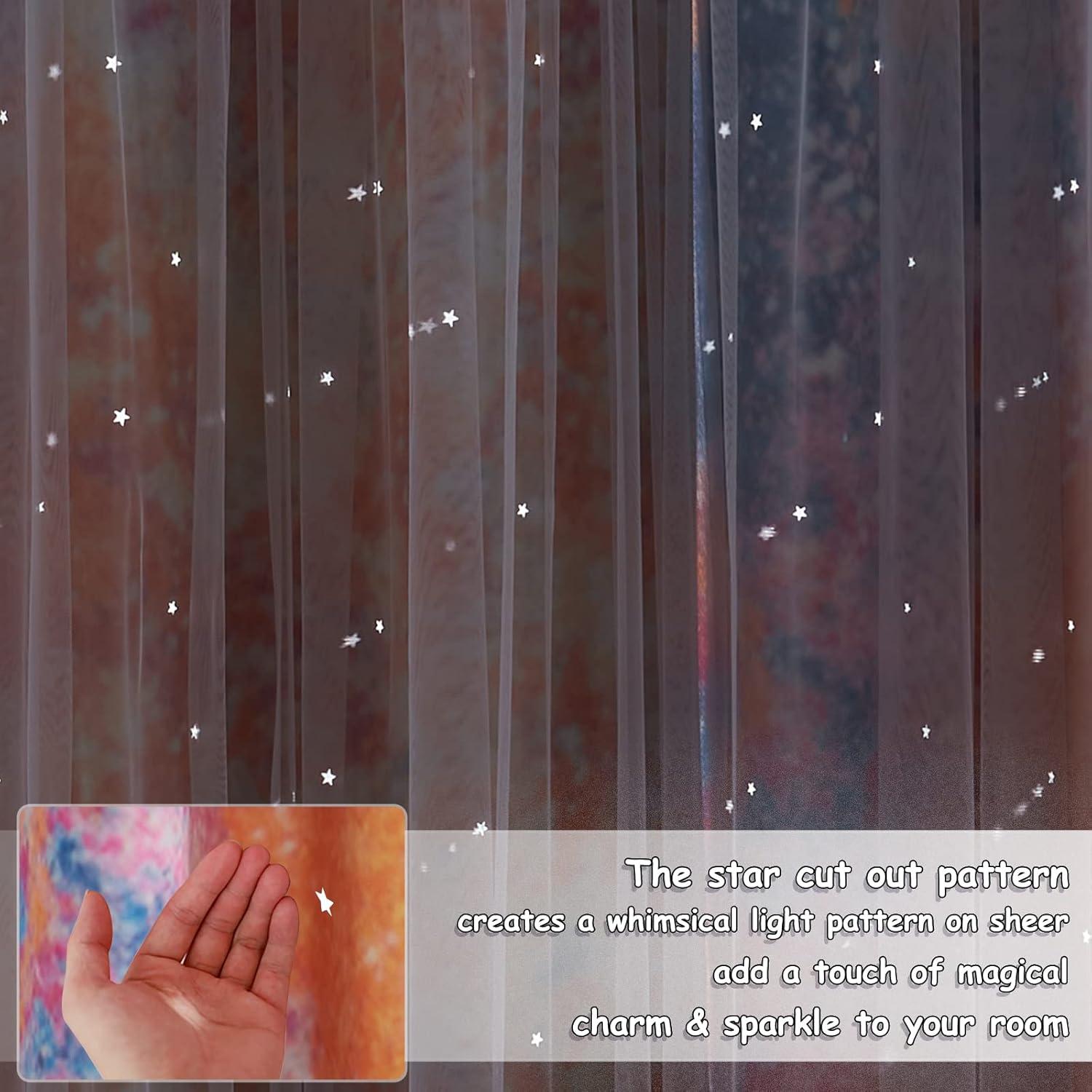 HOLLOW STAR: Hollow stars design cuts the light entering the room into the star shapes. The stars twinkle with the changing light throughout the day. This special airy sheer design will create a more dreamy sense for your little angels' room.