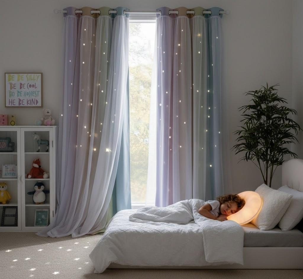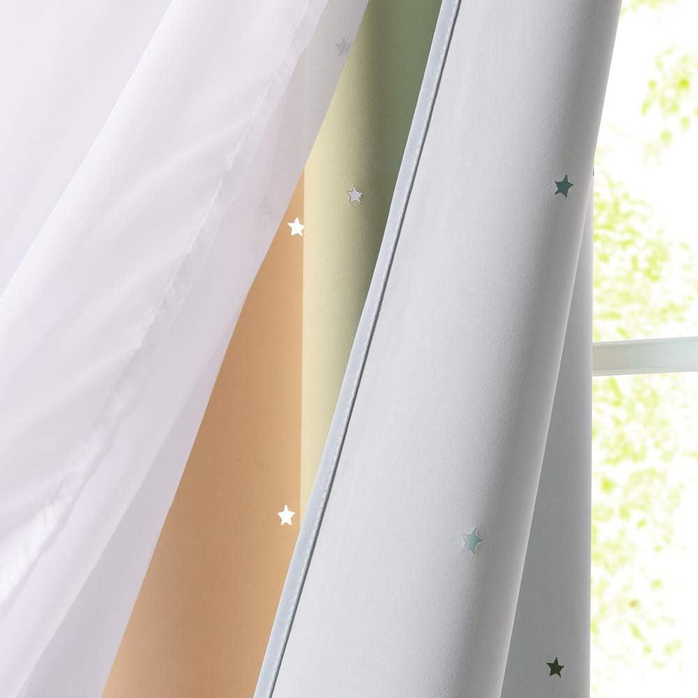 HOLLOW STAR: Hollow stars design cuts the light entering the room into the star shapes. The stars twinkle with the changing light throughout the day. This special airy sheer design will create a more dreamy sense for your little kids' room.