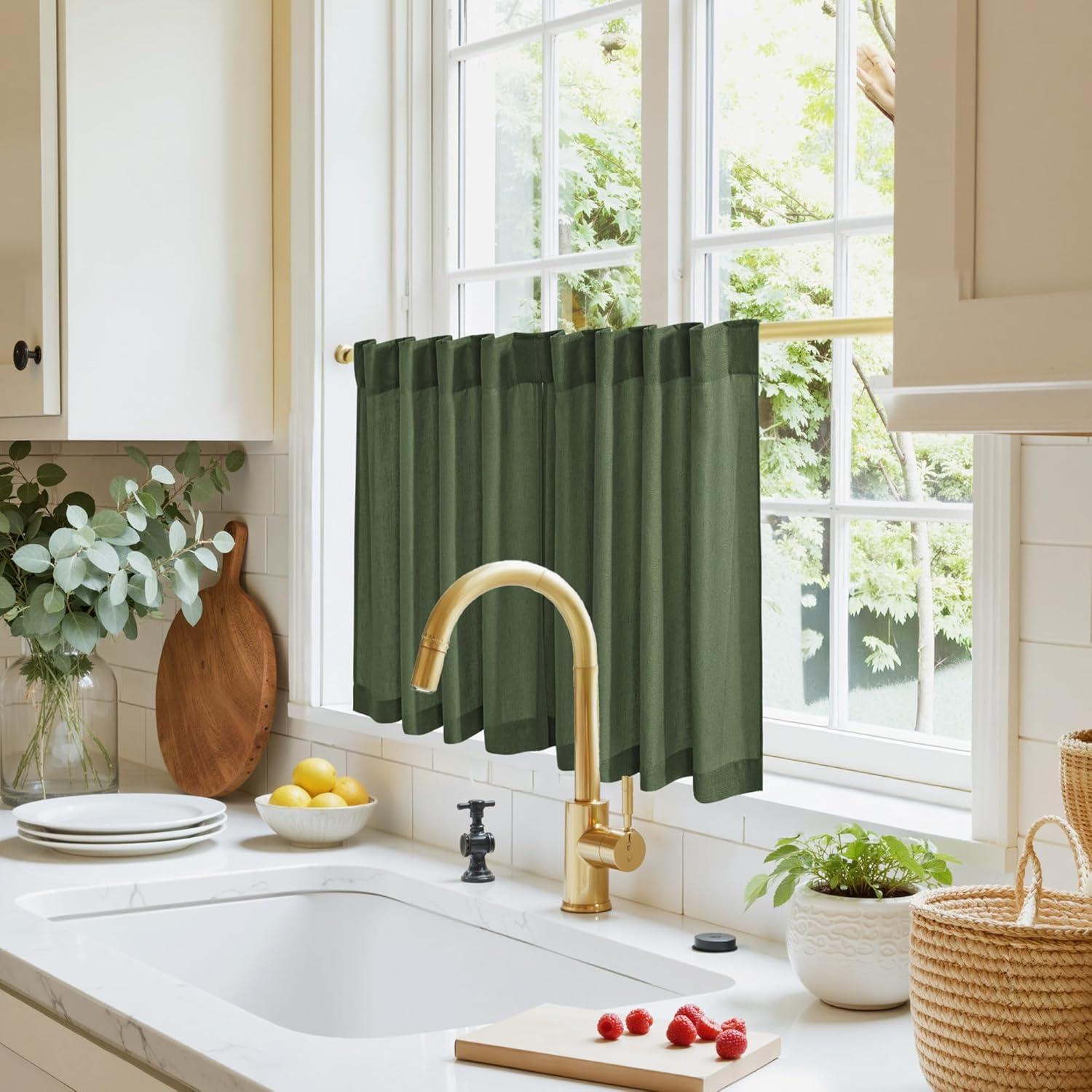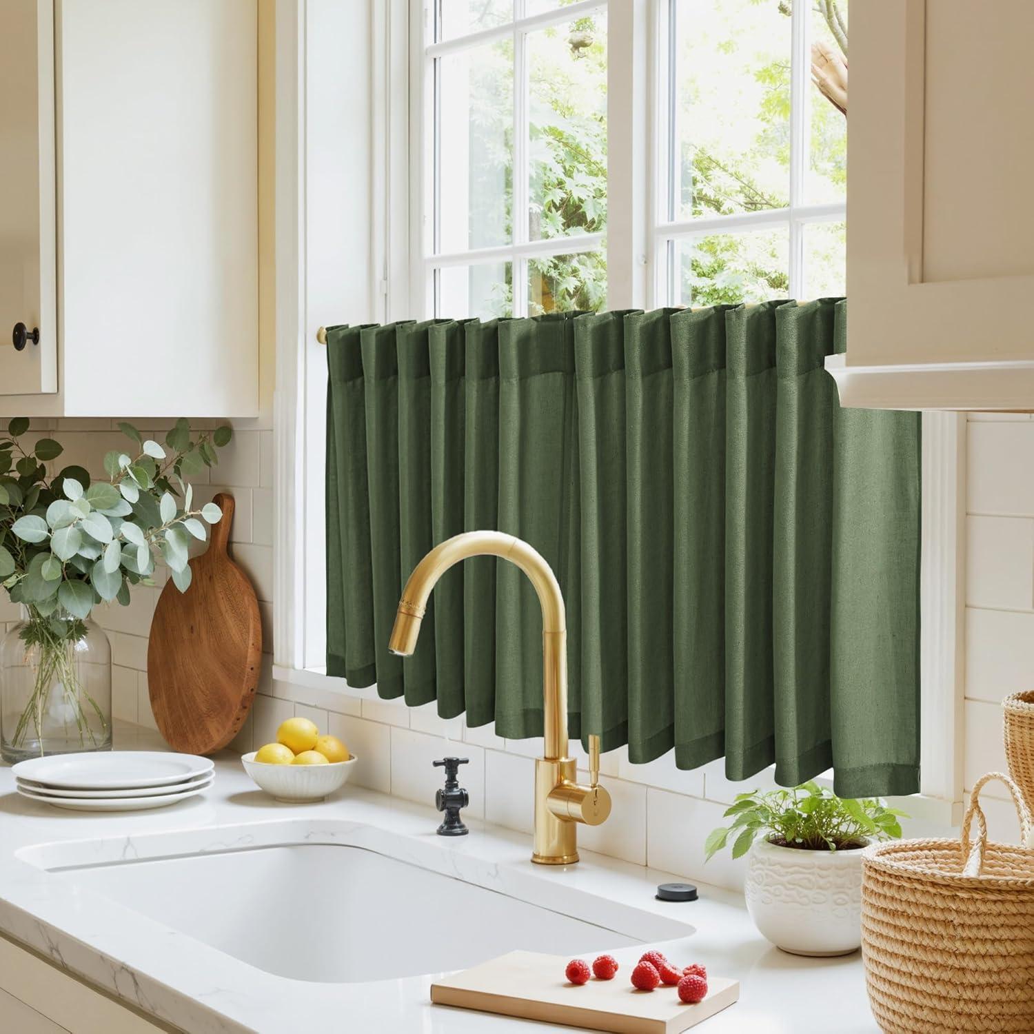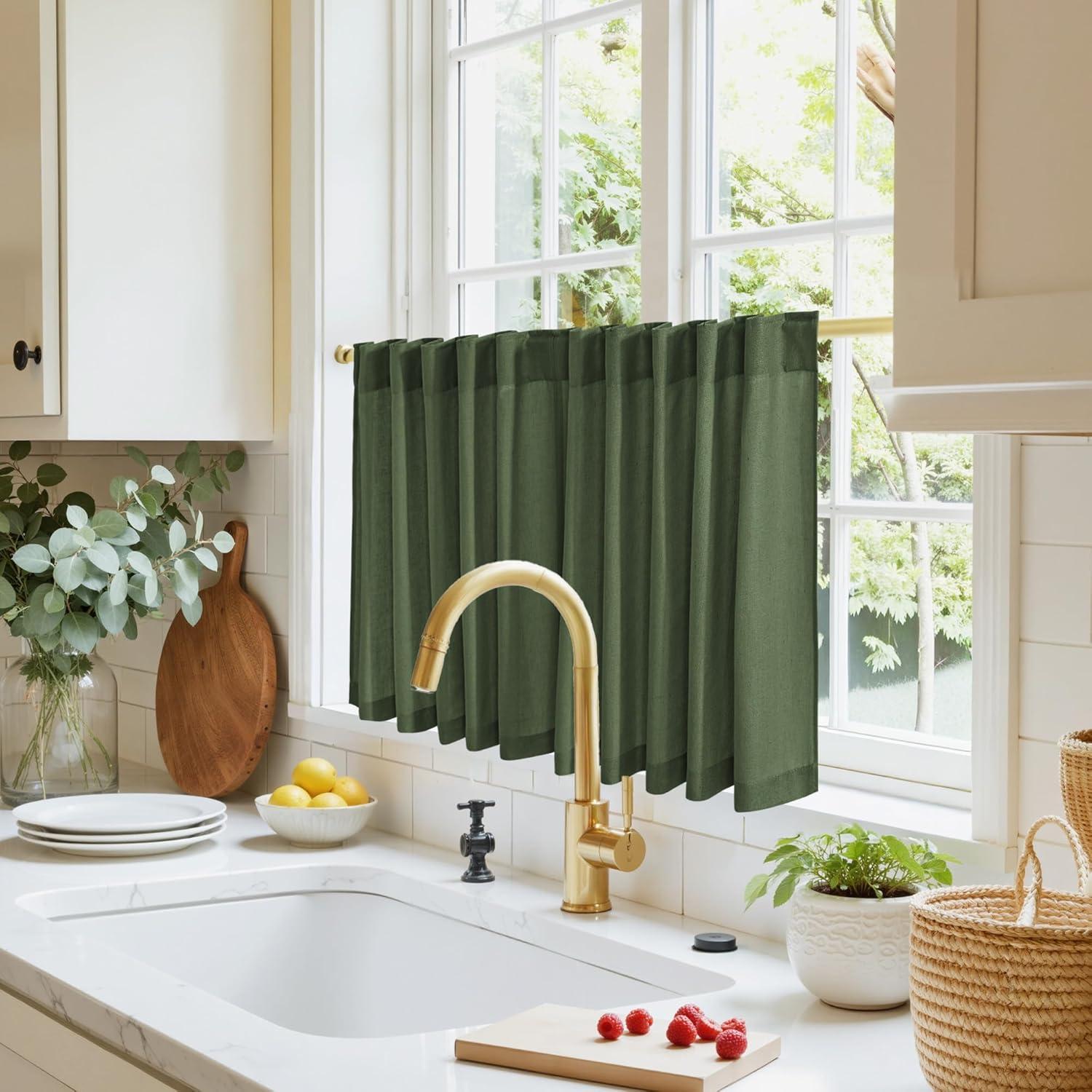 NICETOWN Kitchen Curtain Over Sink Window Set Farmhouse 24 Inch Length Small Bathroom Back Tab Pocket Linen Rustic Short Curtain Tier for Laundry Bay Window, 55x24, Nautal Beige, 1 Pair(Forest Green)