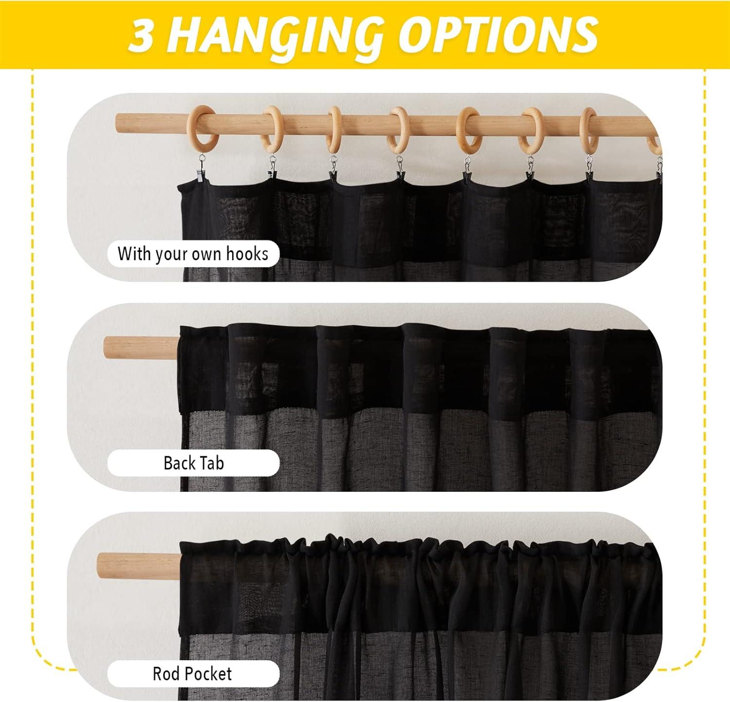 Ready Made: The package includes 2 panels of semi sheer linen curtain drapes, each measures 52″W (104″W for pair), with a rod pocket & Back tab design which 2 inch inner Diam to fit most of the curtain rods.