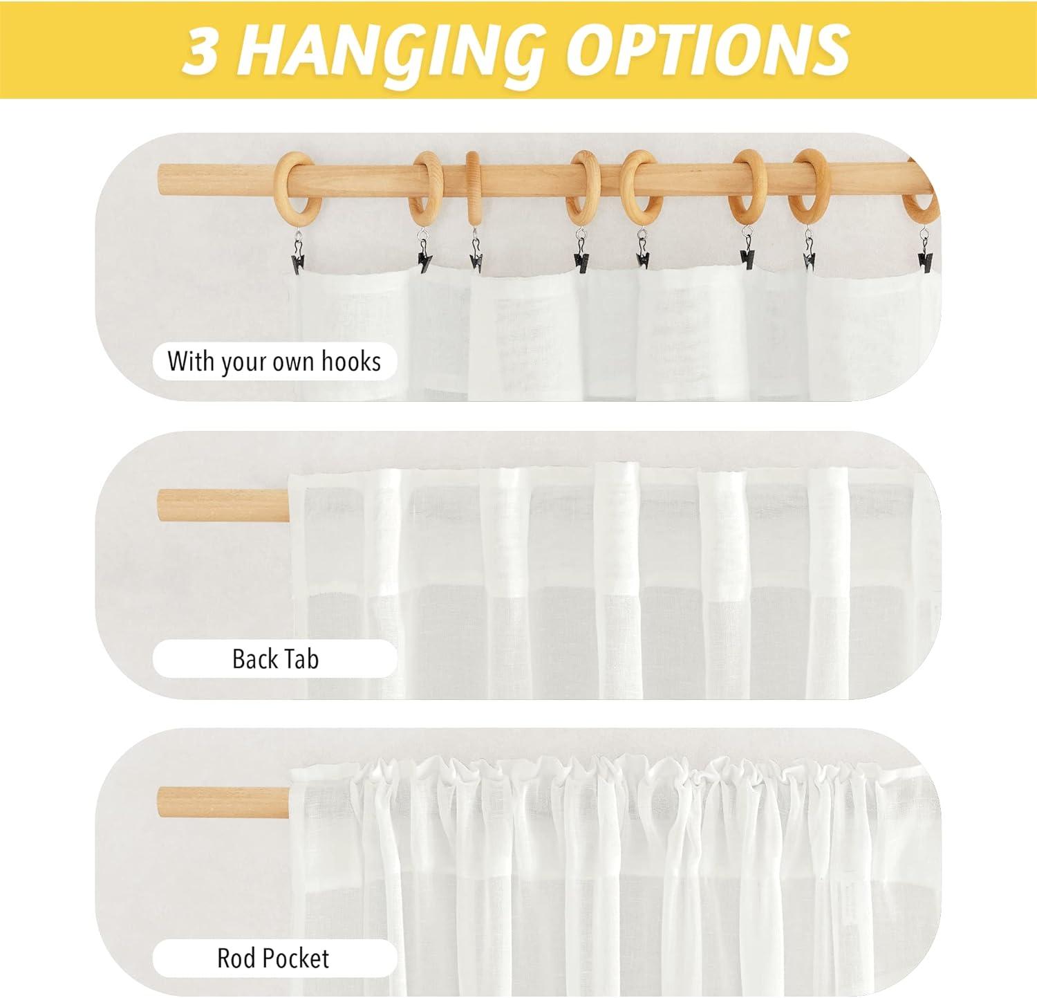 Ready Made: The package includes 2 panels of semi sheer linen curtain drapes, each measures 52″W (104″W for pair), with a rod pocket & Back tab design which 2 inch inner Diam to fit most of the curtain rods.