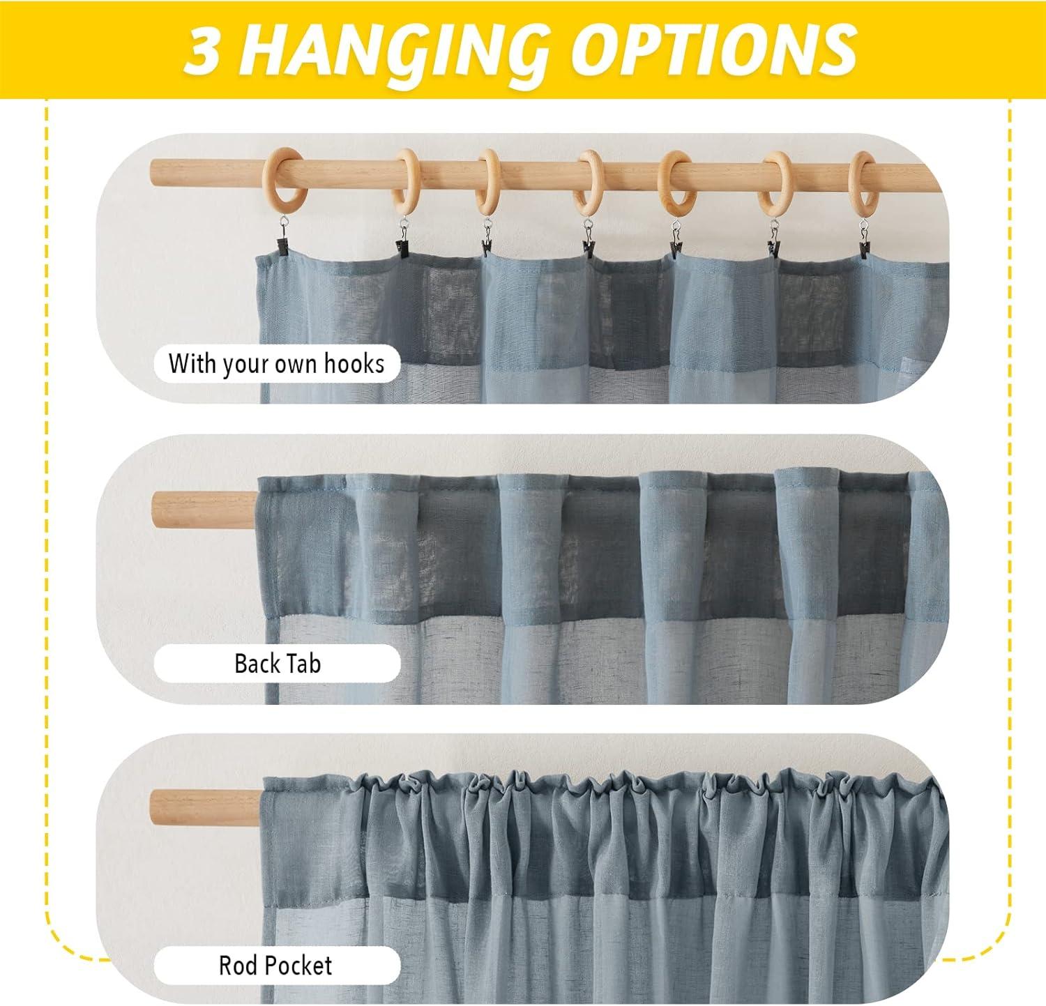 Ready Made: The package includes 2 panels of semi sheer linen curtain drapes, each measures 52″W (104″W for pair), with a rod pocket & Back tab design which 2 inch inner Diam to fit most of the curtain rods.